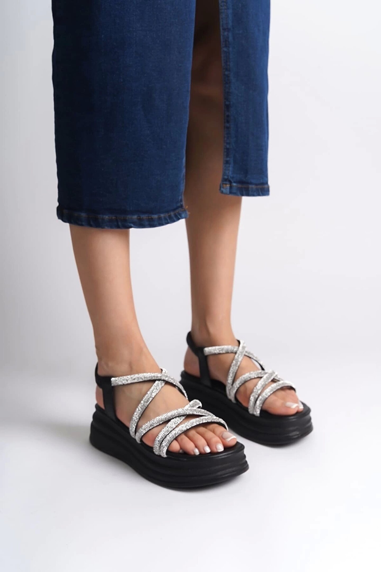Joy Ayakkabı ELENA Lastikli Taşlı Şeritli Ortopedik Taban Kadın Sandalet CST - Siyah