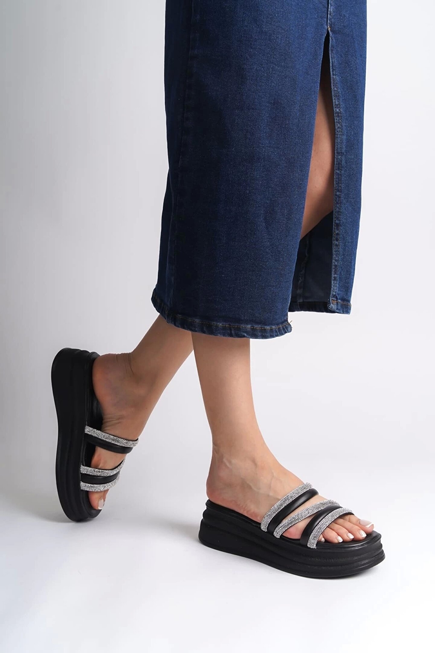 Joy Ayakkabı ELISE Düz Topuklu Şeritli Taşlı Kalın ve Ortopedik Taban Kadın Terlik CST - Siyah