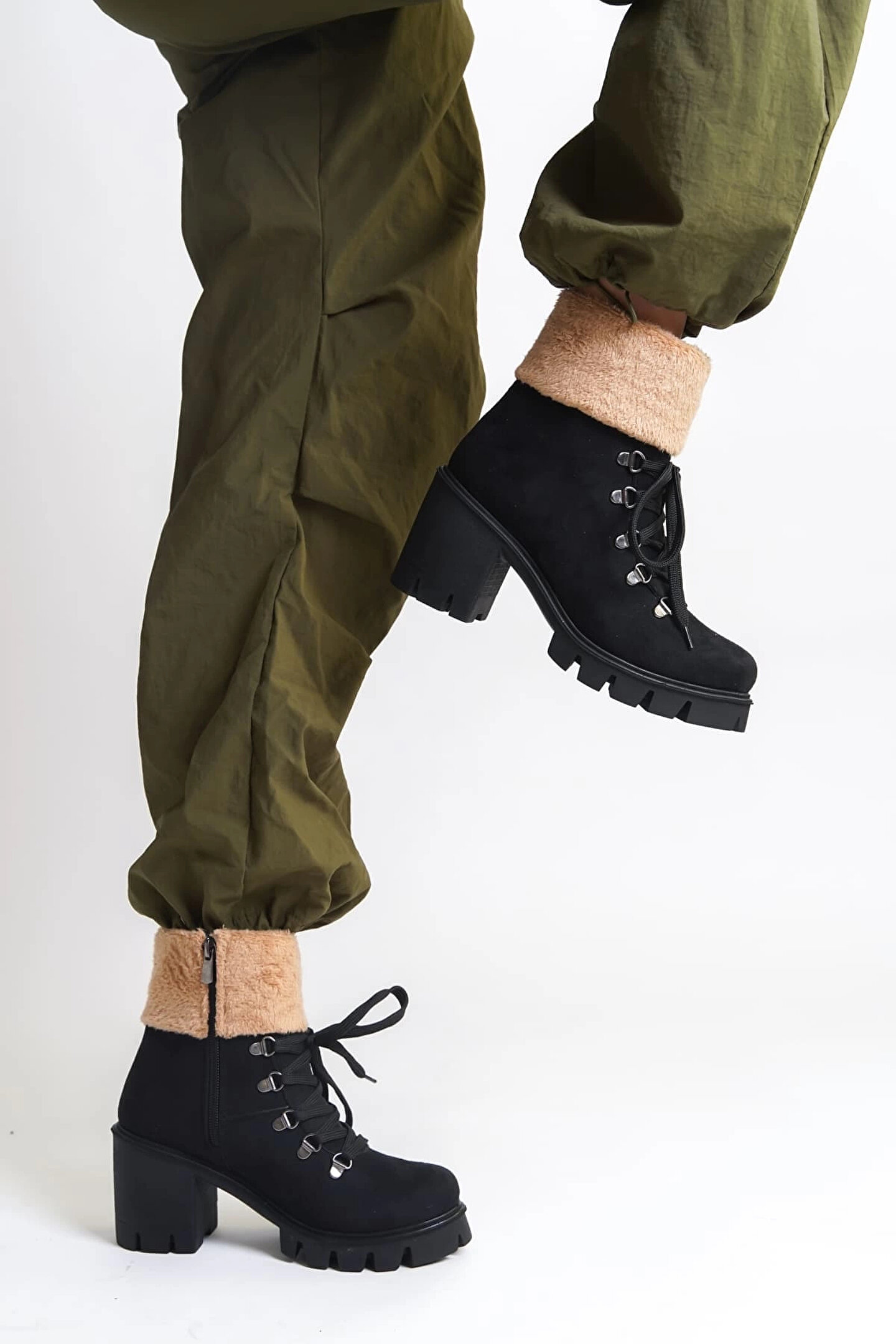 Joy Ayakkabı EMMA Bağcıklı Fermuarlı Ortopedik Taban Topuklu Kürk Detaylı Süet Kadın Bot SST - Siyah
