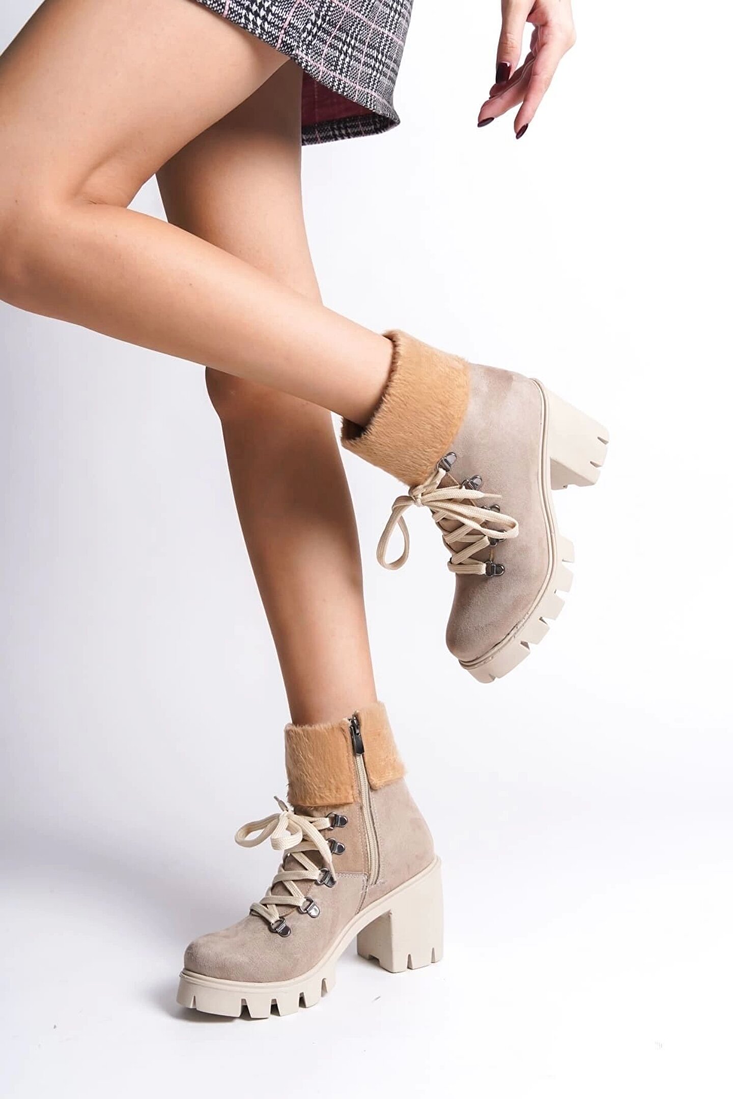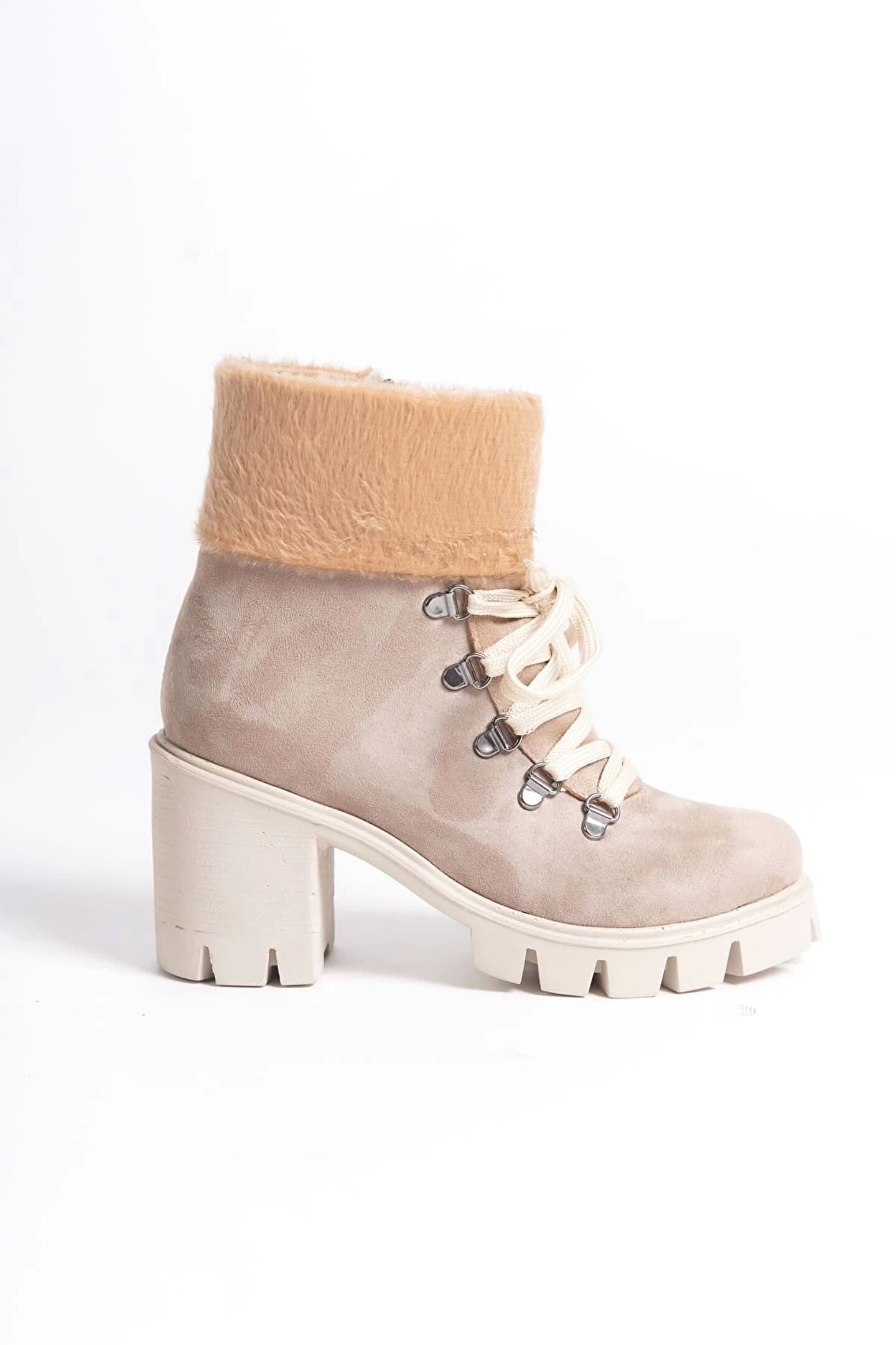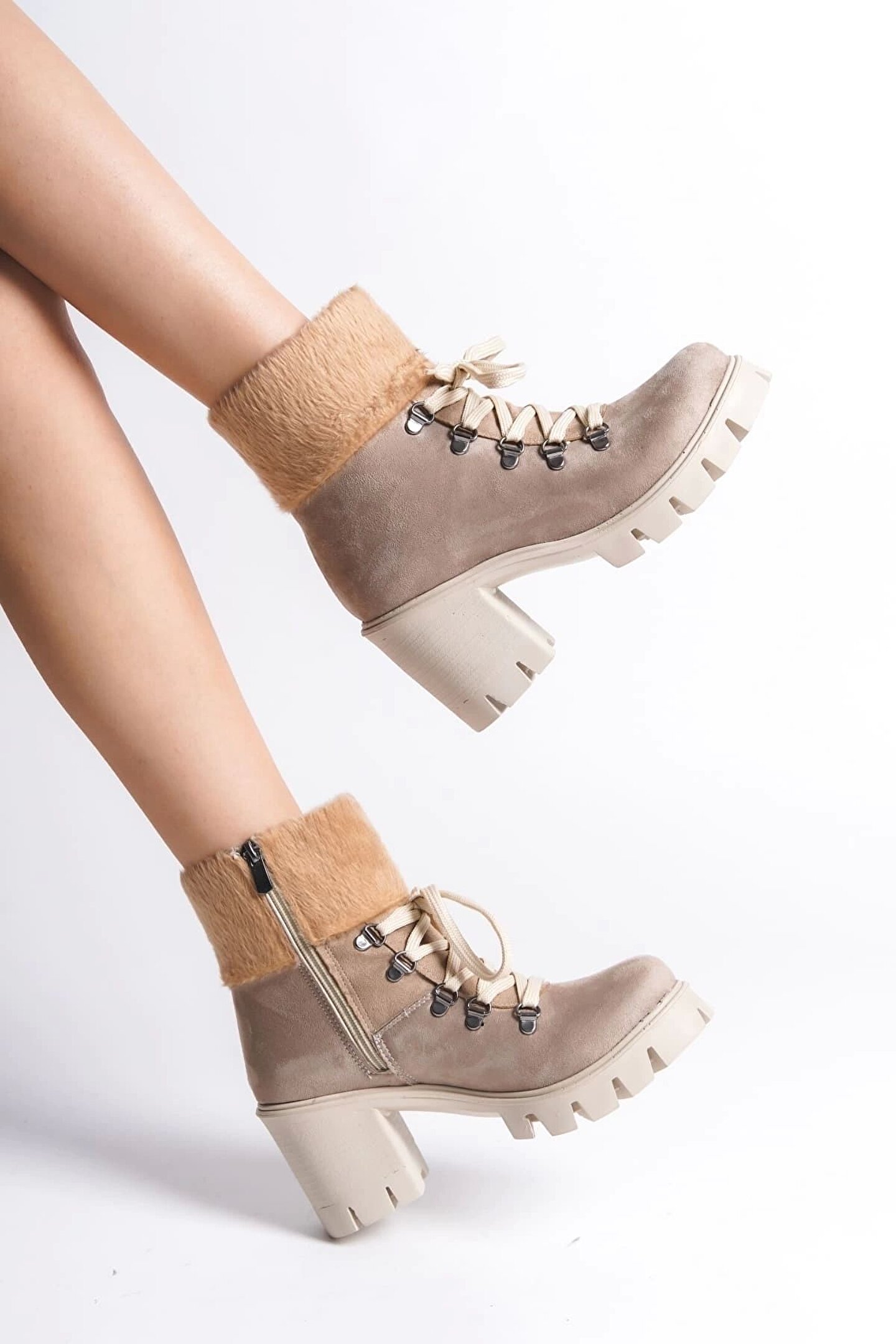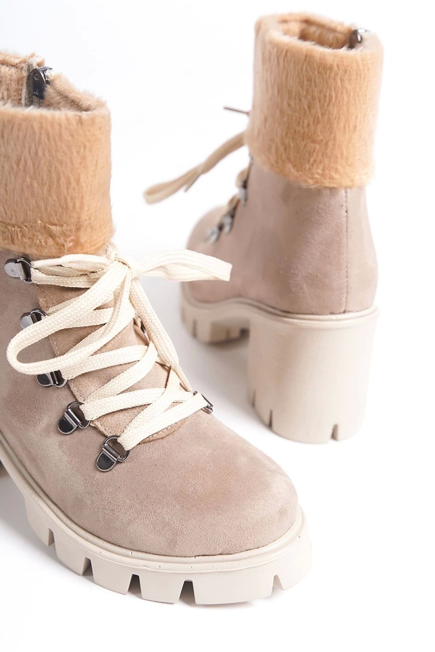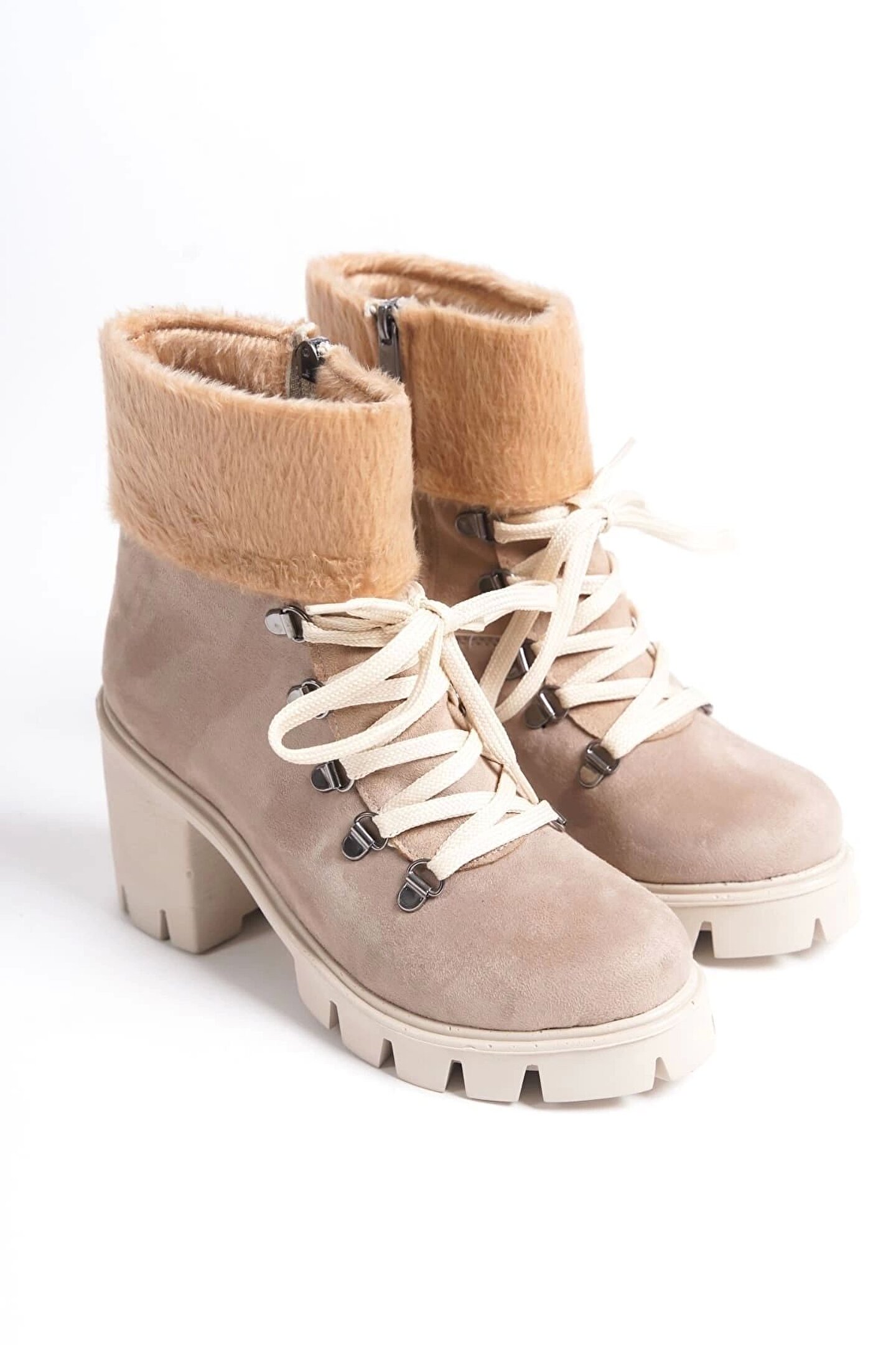 Joy Ayakkabı Emma Bağcıklı Fermuarlı Ortopedik Taban Topuklu Kürk Detaylı Süet Kadın Bot Stt - Ten