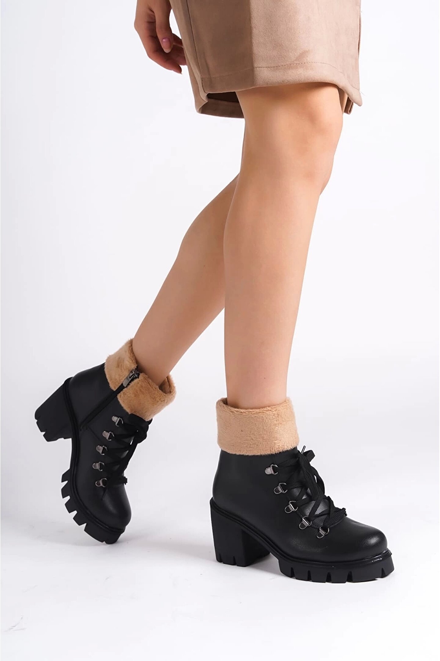 Joy Ayakkabı EMMA Bağcıklı Fermuarlı Ortopedik Taban Topuklu Kürk DetaylıKadın Bot CST - Siyah