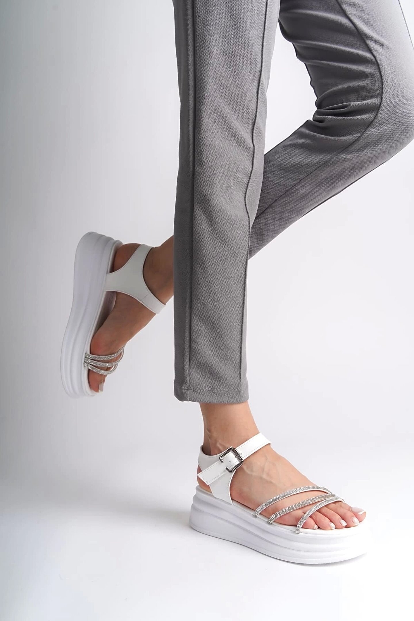 EVA Kalın Tokalı Taşlı Şeritli Ortopedik Taban Kadın Sandalet CBT - Beyaz