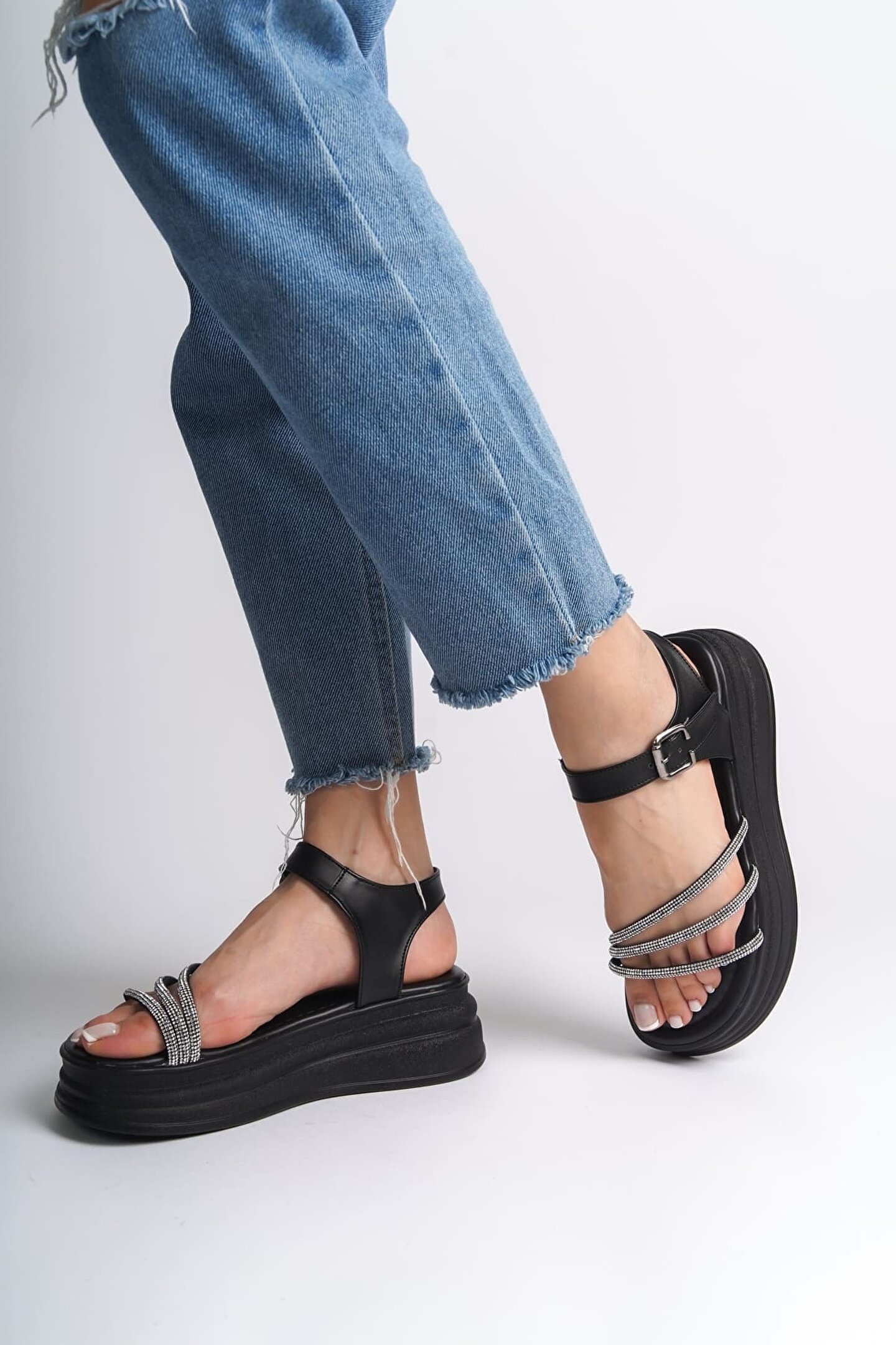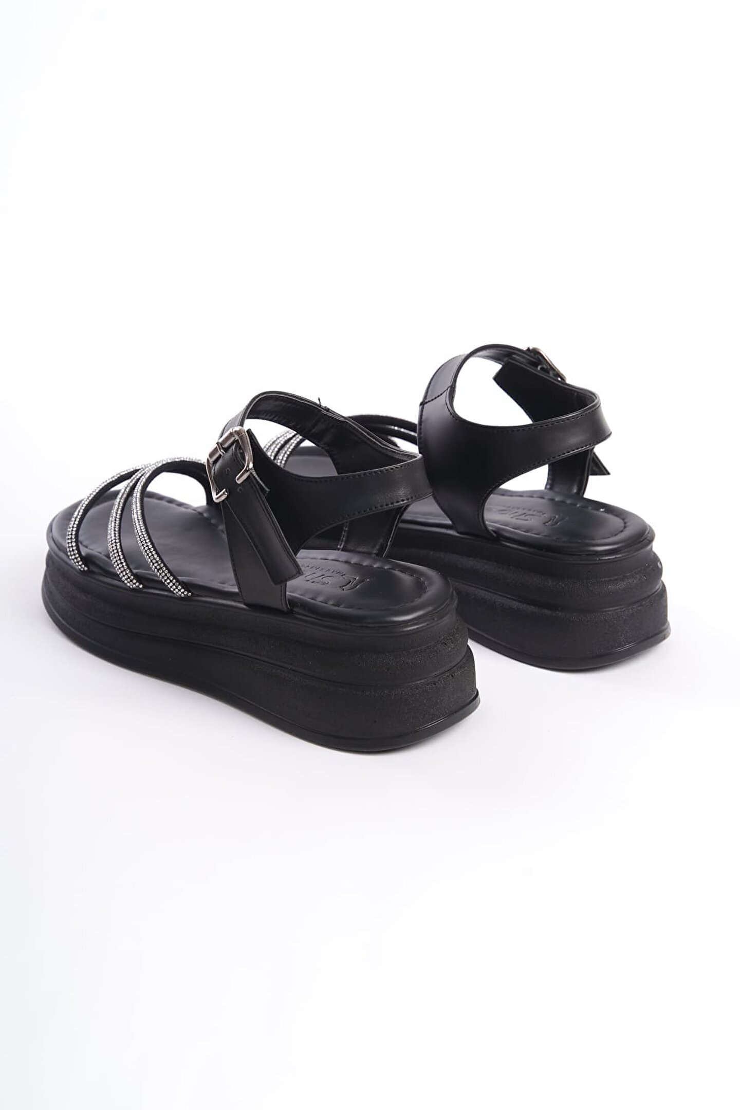 Joy Ayakkabı EVA Kalın Tokalı Taşlı Şeritli Ortopedik Taban Kadın Sandalet CST - Siyah