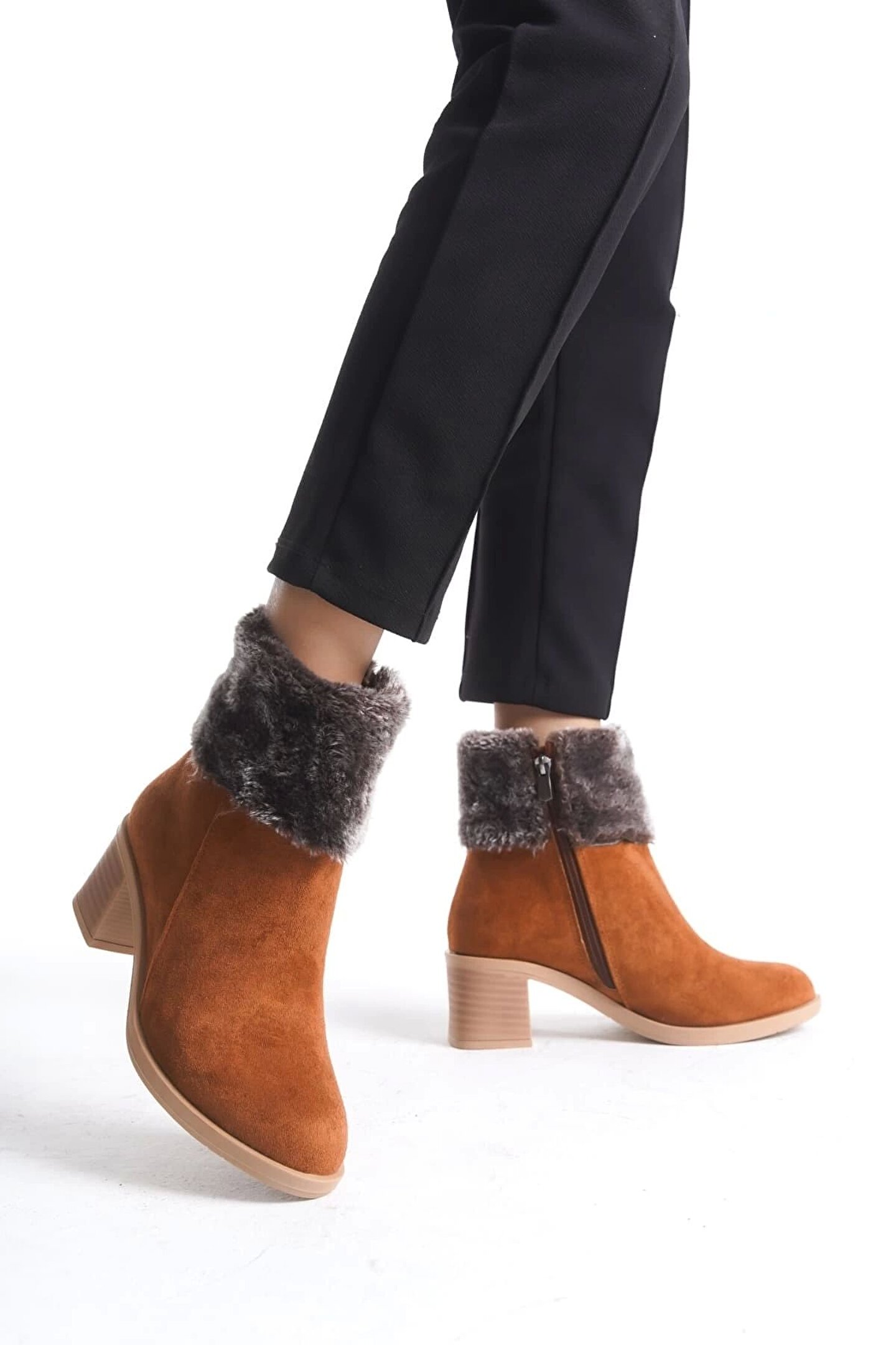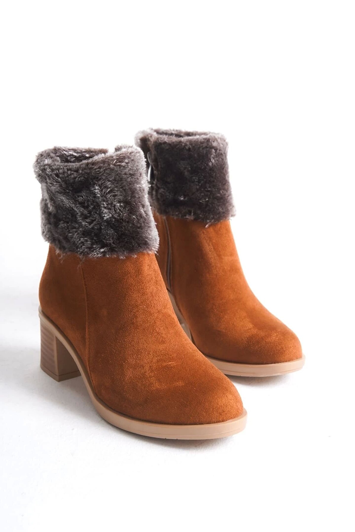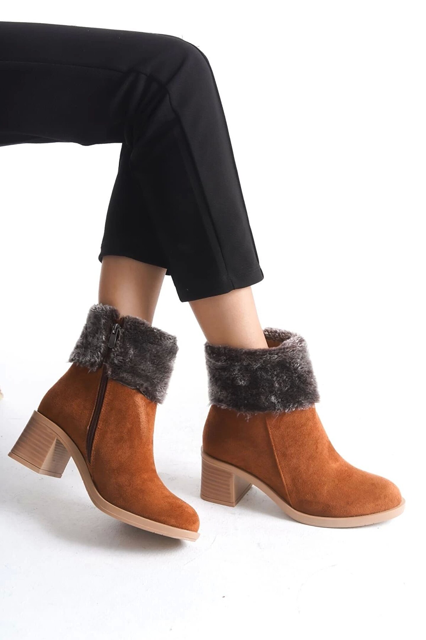 Joy Ayakkabı KATYA Fermuarlı Ortopedik Taban Topuklu Kürk Detaylı Süet Kadın Bot STT - Taba