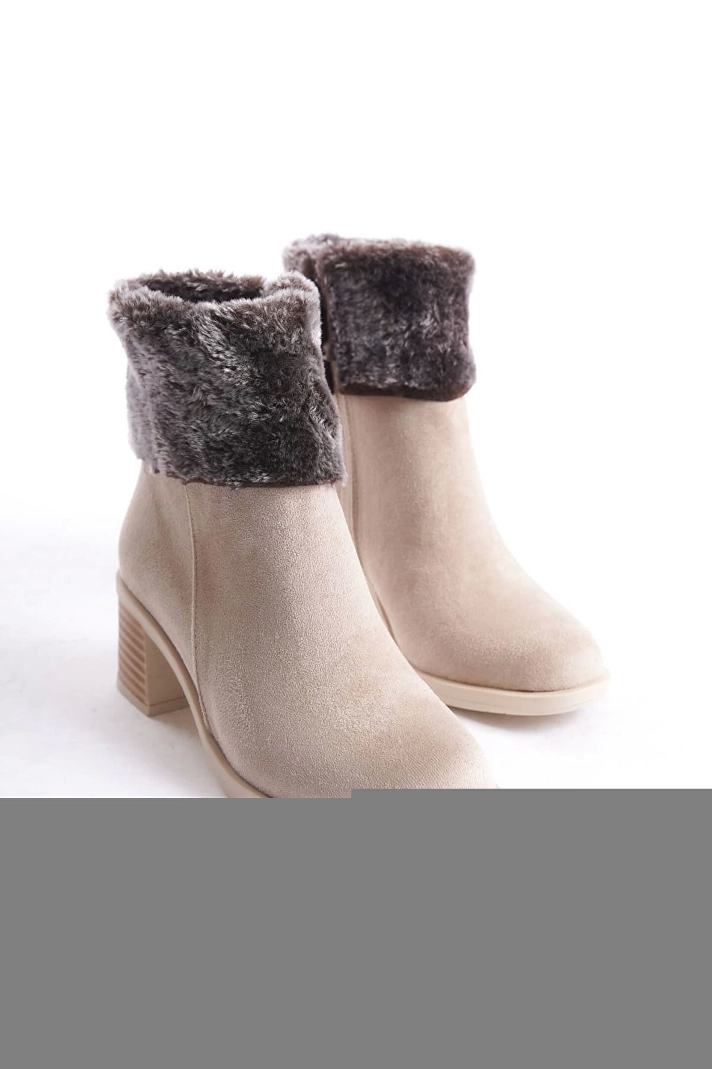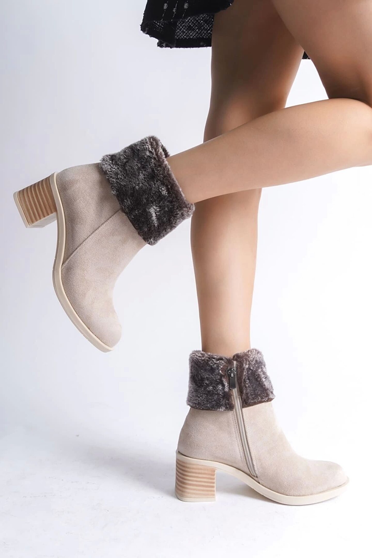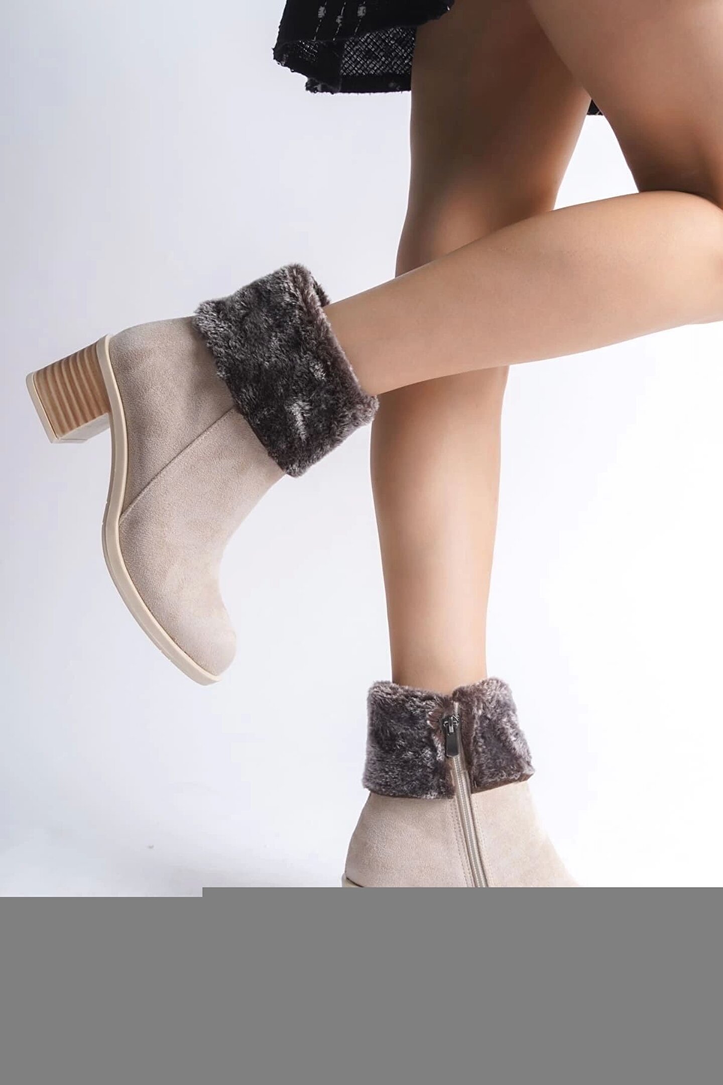 Joy Ayakkabı KATYA Fermuarlı Ortopedik Taban Topuklu Kürk Detaylı Süet Kadın Bot - Ten