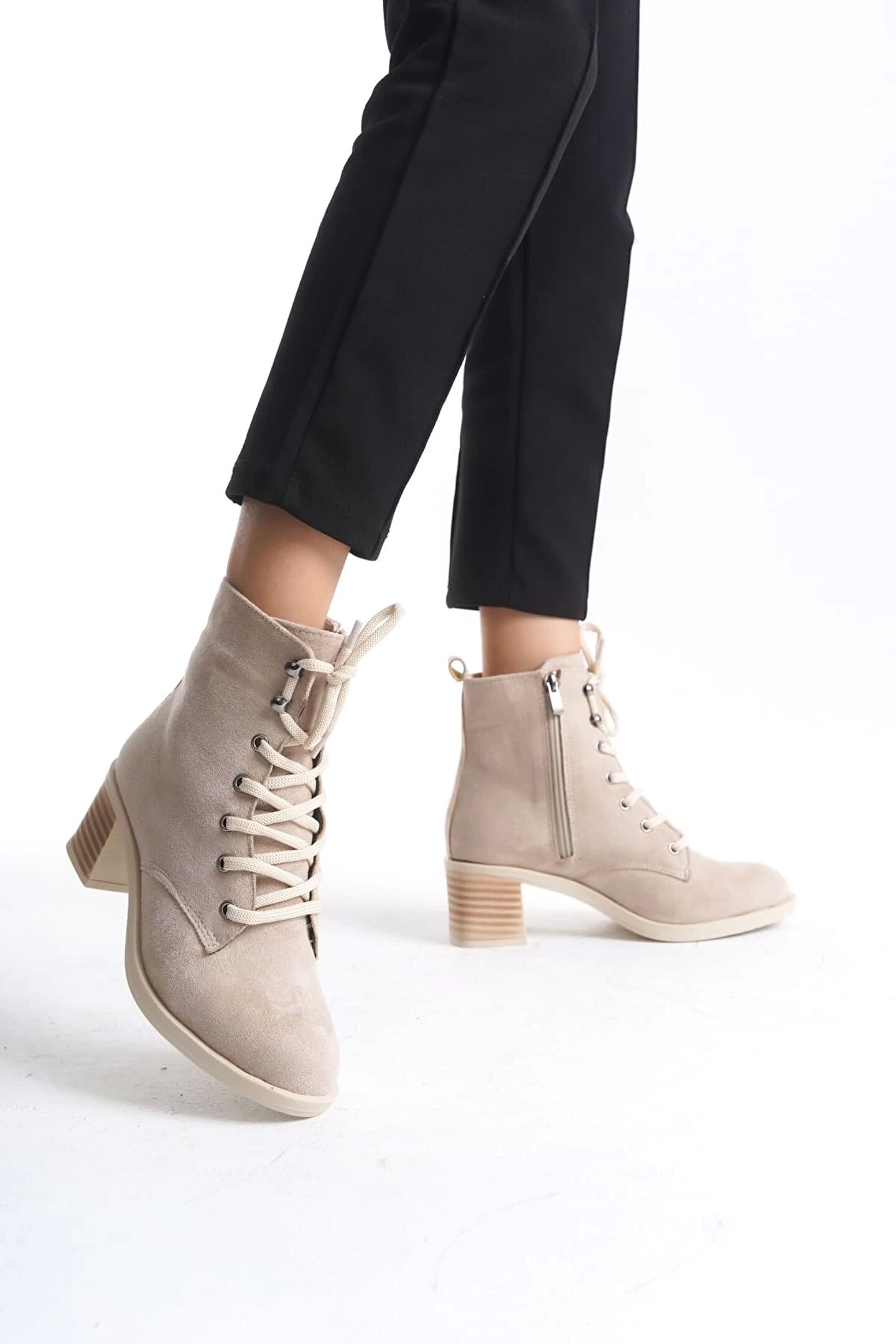 Joy Ayakkabı LENA Bağcıklı Fermuarlı Ortopedik Taban Topuklu Süet Kadın Bot - Ten