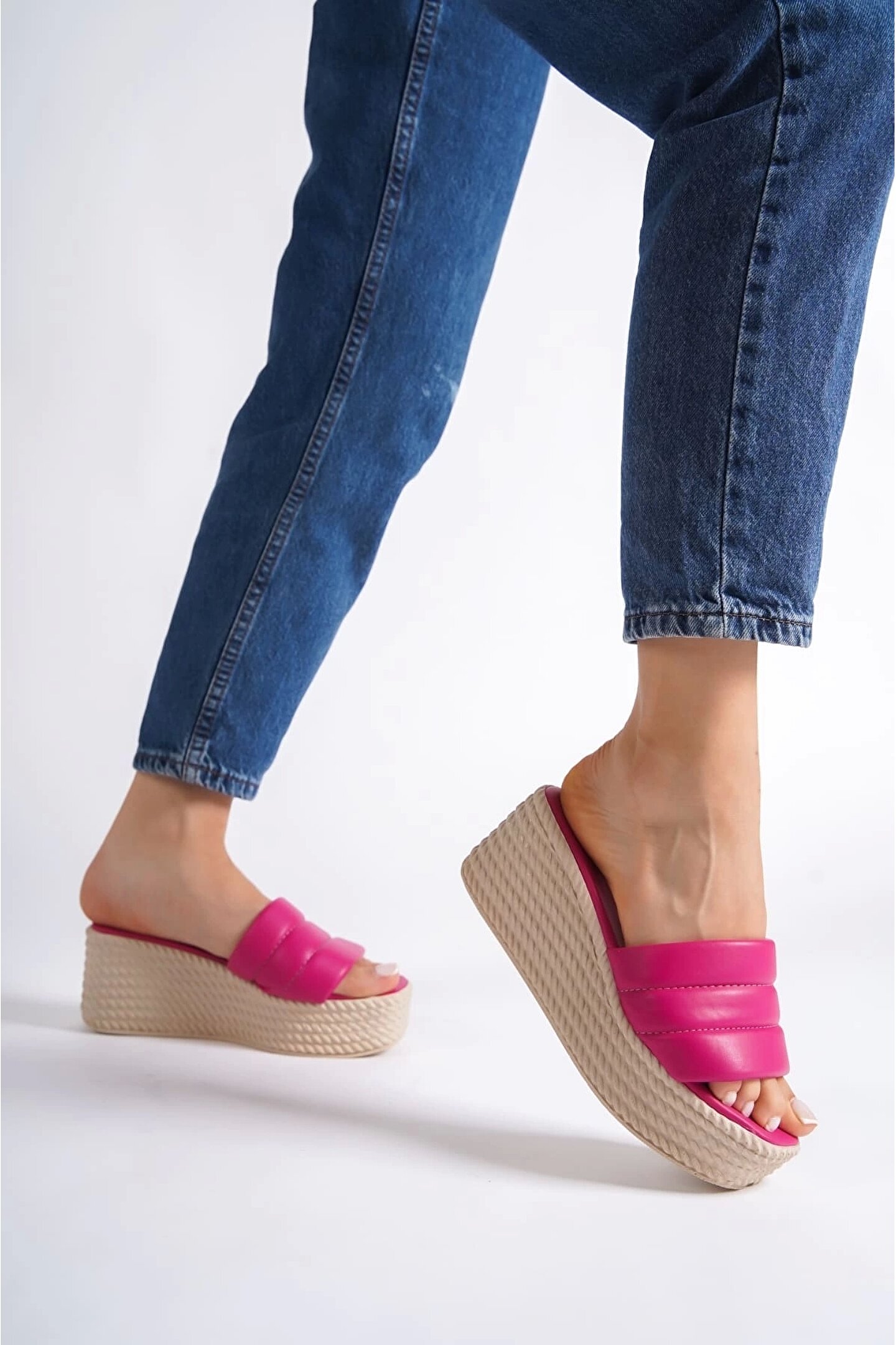 REINA Dolgu Topuklu Ortopedik Taban Hasır Görünümlü Kadın Terlik CKT - Fuşya