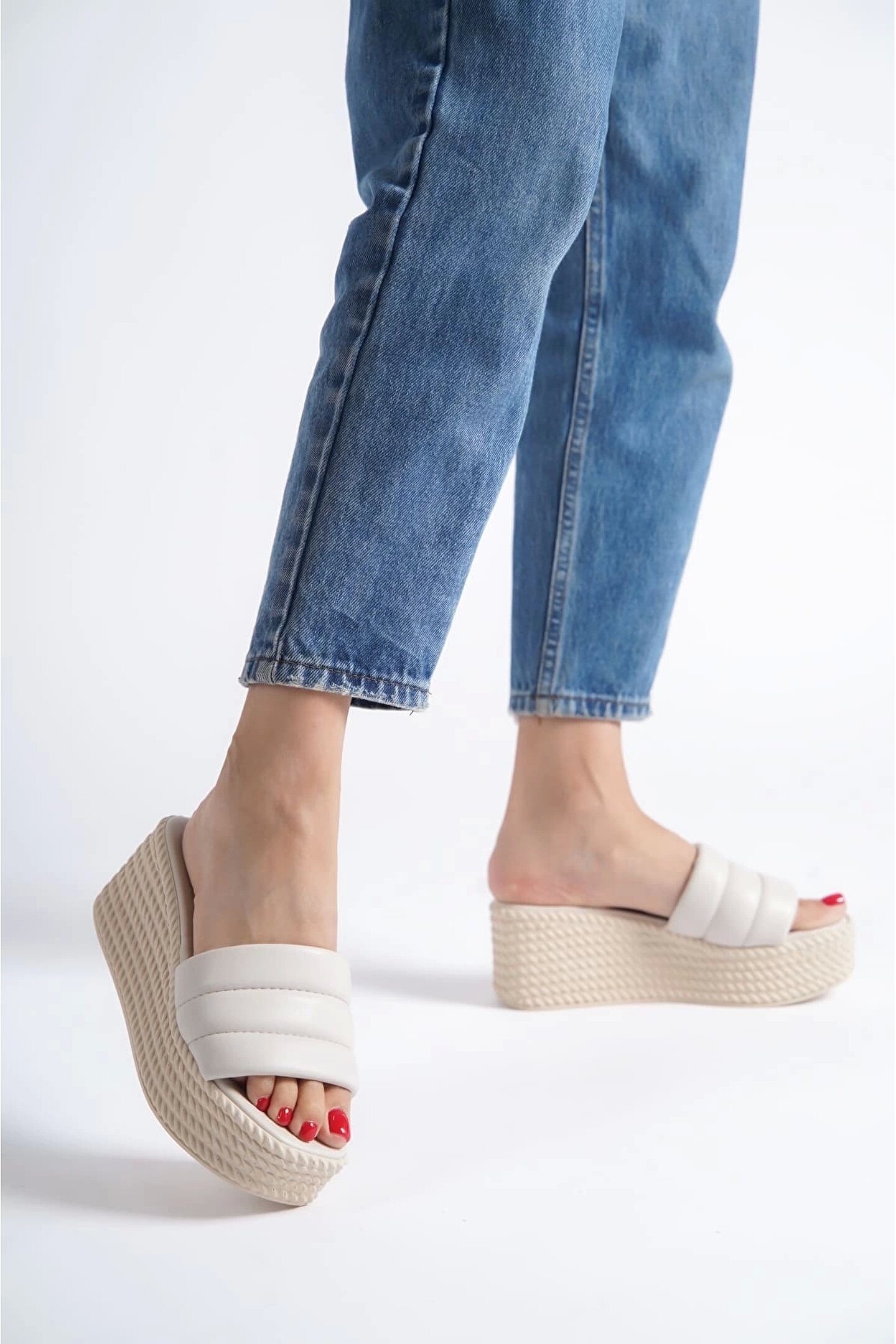 Joy Ayakkabı REINA Dolgu Topuklu Ortopedik Taban Hasır Görünümlü Kadın Terlik CKT - Krem