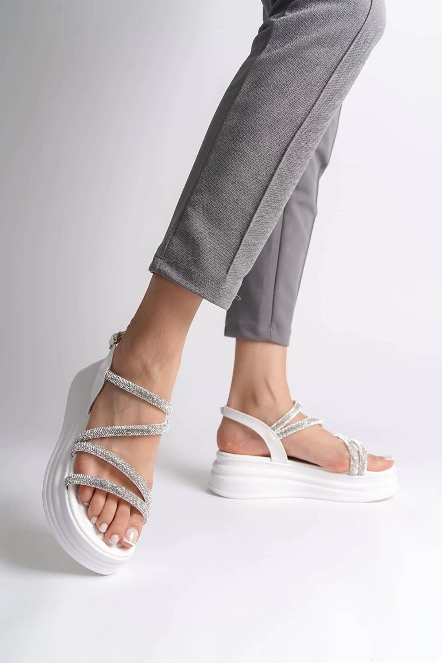 Joy Ayakkabı RILEY İnce Tokalı Taşlı Şeritli Ortopedik Taban Kadın Sandalet CBT - Beyaz