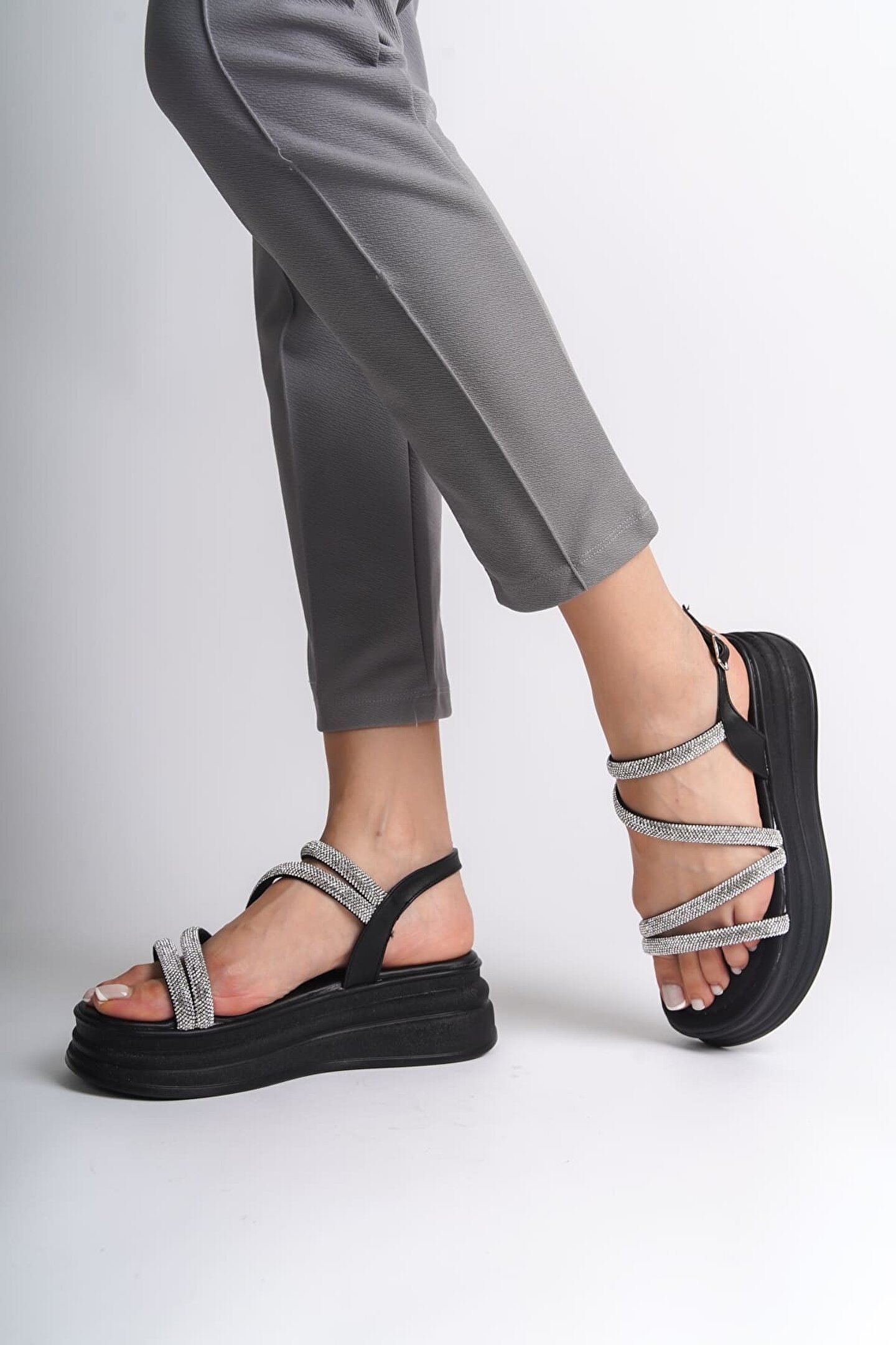 Joy Ayakkabı RILEY İnce Tokalı Taşlı Şeritli Ortopedik Taban Kadın Sandalet CST - Siyah