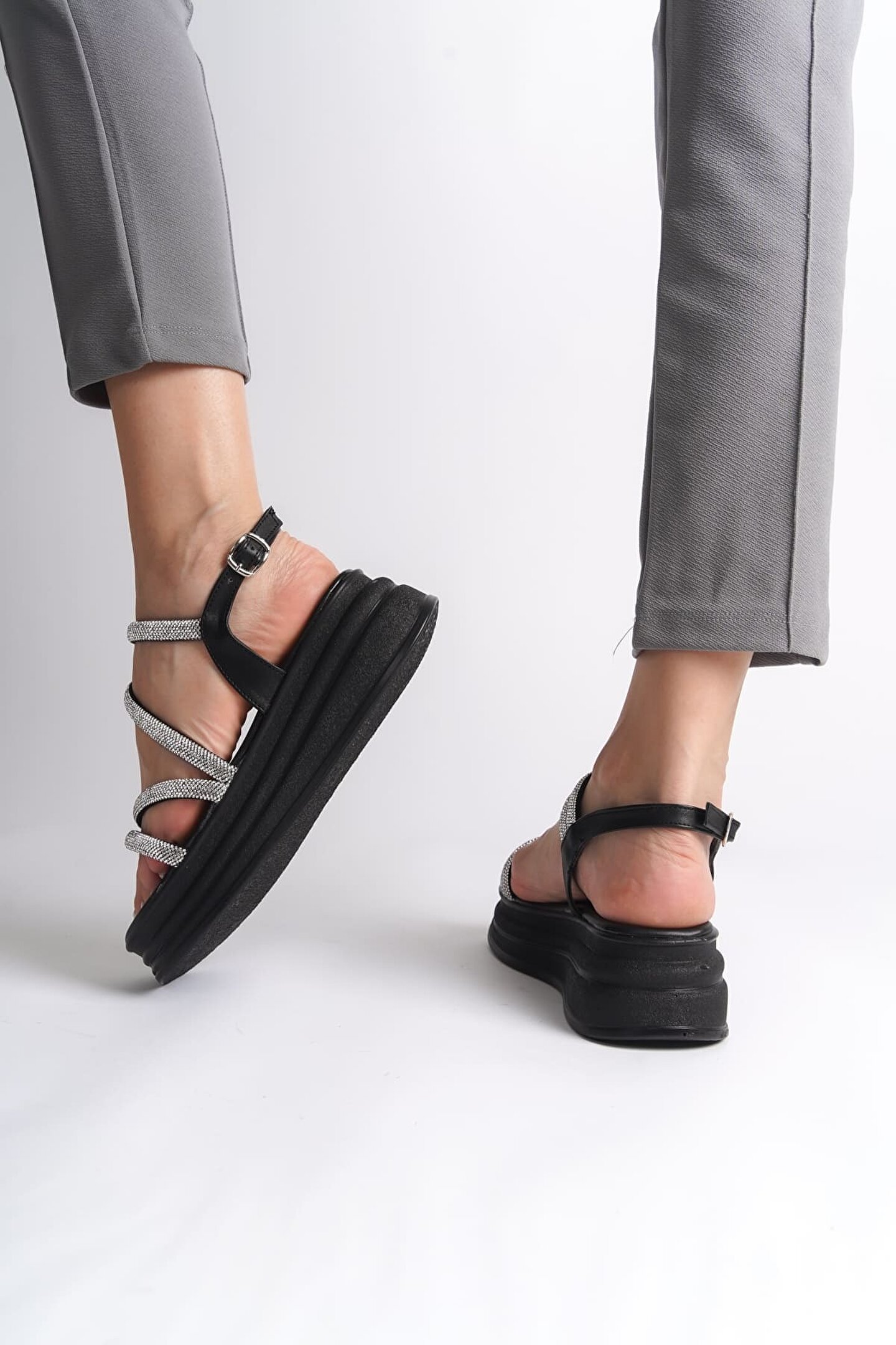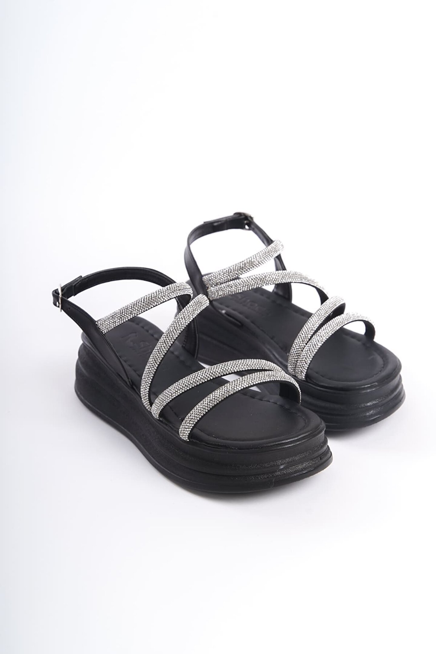 Joy Ayakkabı RILEY İnce Tokalı Taşlı Şeritli Ortopedik Taban Kadın Sandalet CST - Siyah