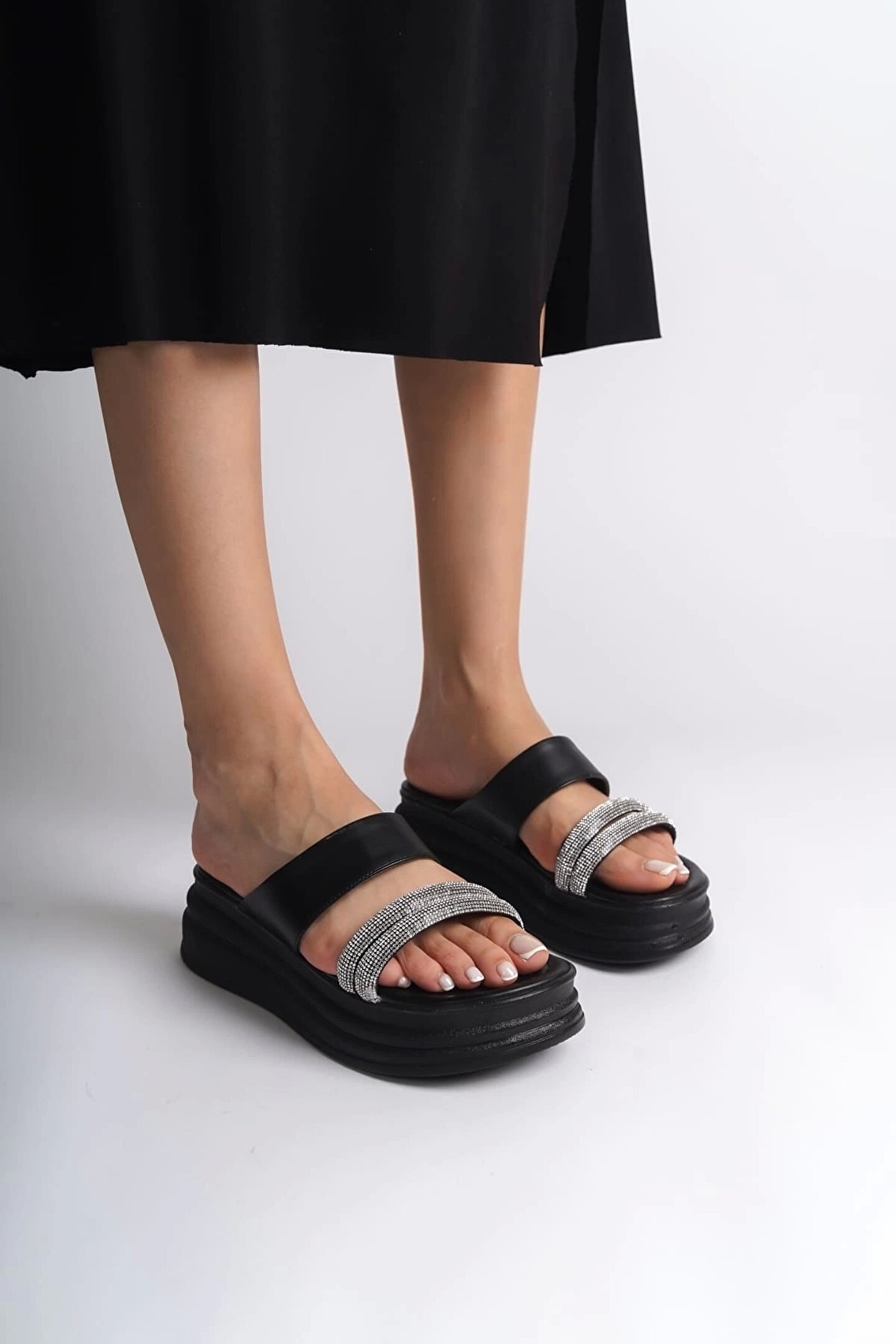 Joy Ayakkabı SARAH Düz Topuklu Taşlı Şeritli Kalın ve Ortopedik Taban Kadın Terlik CST - Siyah