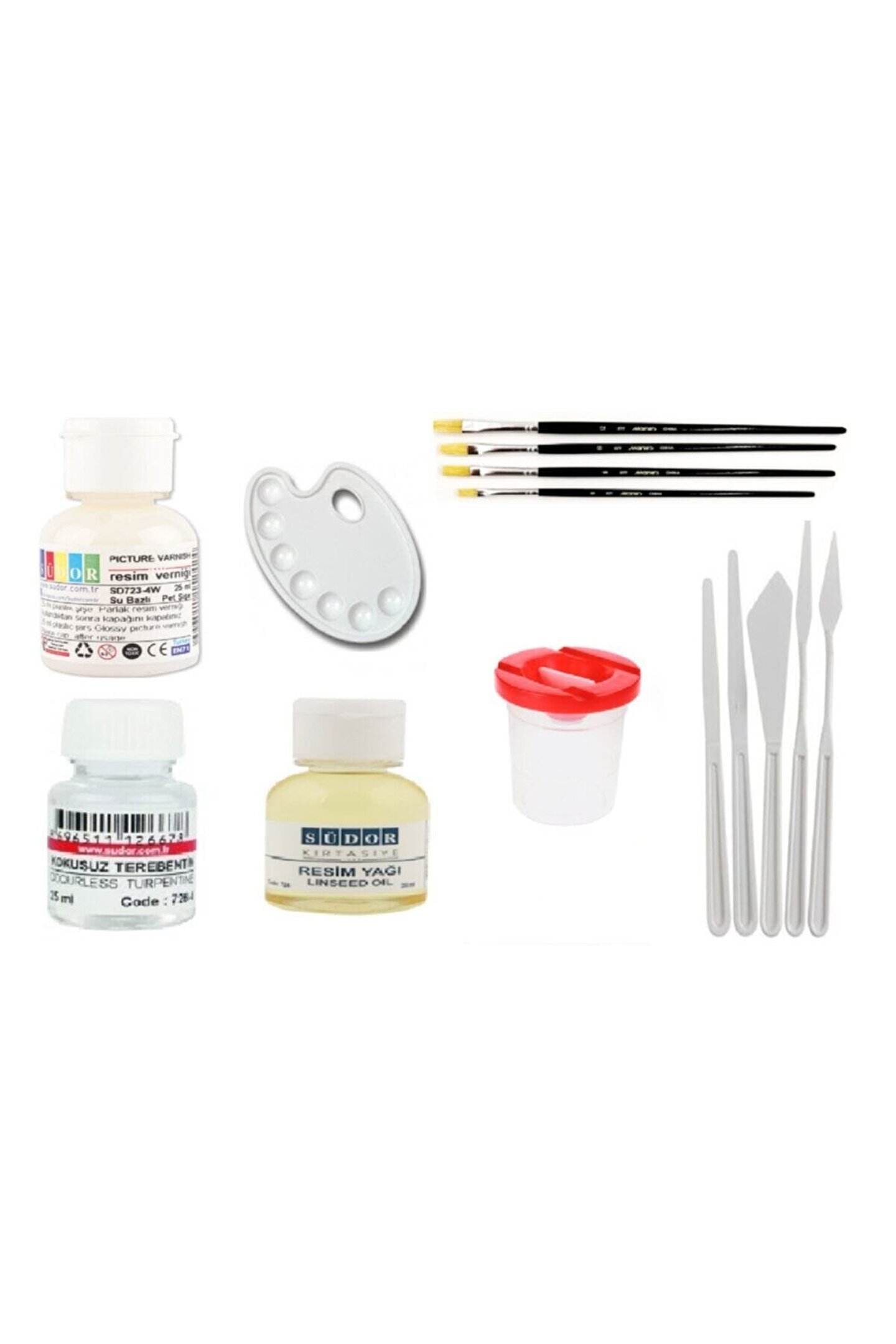terebentin 25ml vernik 25ml resim yagı 25ml maries 4lü set fırça palet su kabı 5li spatula