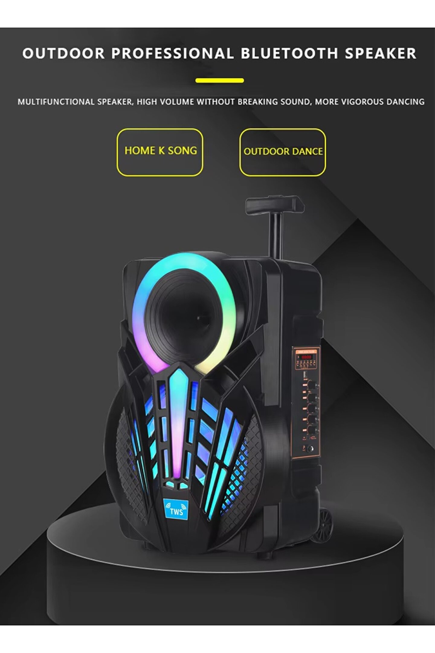 USB, TF kartı, Bluetooth ile, ekran, FM, renk kutusu, 9V şarj cihazı, küçük uzaktan kumanda, TWS, kablosuz mikrofon, çekme çubuğu, tekerlek, Sony lamba halkası