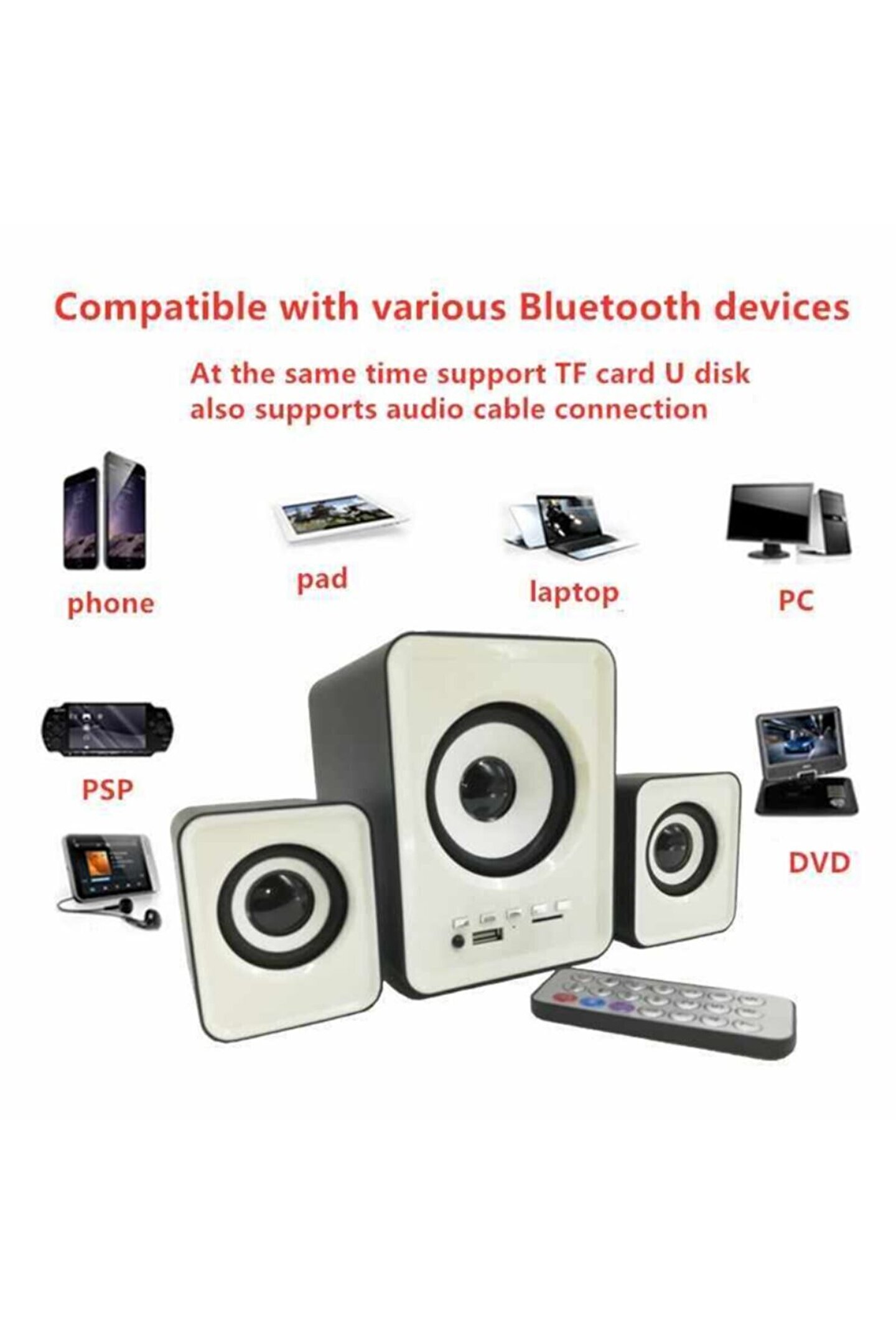2+1 MİNİ HOPARLÖR PC/TV/TELEFON UYUMLU BLUETOOTH LU SES SİSTEMİ SPEAKER • Müziğinizi her ortamda dinlemek için ideal. ; • Küçük boyutları, her alanda kolayca konumlanmalarını sağlar. ; • Geniş bir alana ihtiyaç duymadan mükemmel ses sağlar. ; - 11 W RMS toplam güç - Ön Güç AÇMA / KAPATMA düğmesi - Ön ses kontrolü - Güç göstergesi LED'i - 3,5 mini fişli stereo bağlantı (dahili kablo) - USB güç kaynağı - Boyutlar: - Uydu: 7,3 x 6, 4 x 5.5 cm - Subwoofer: 12,8 x 9,6 x 11,8 cm;