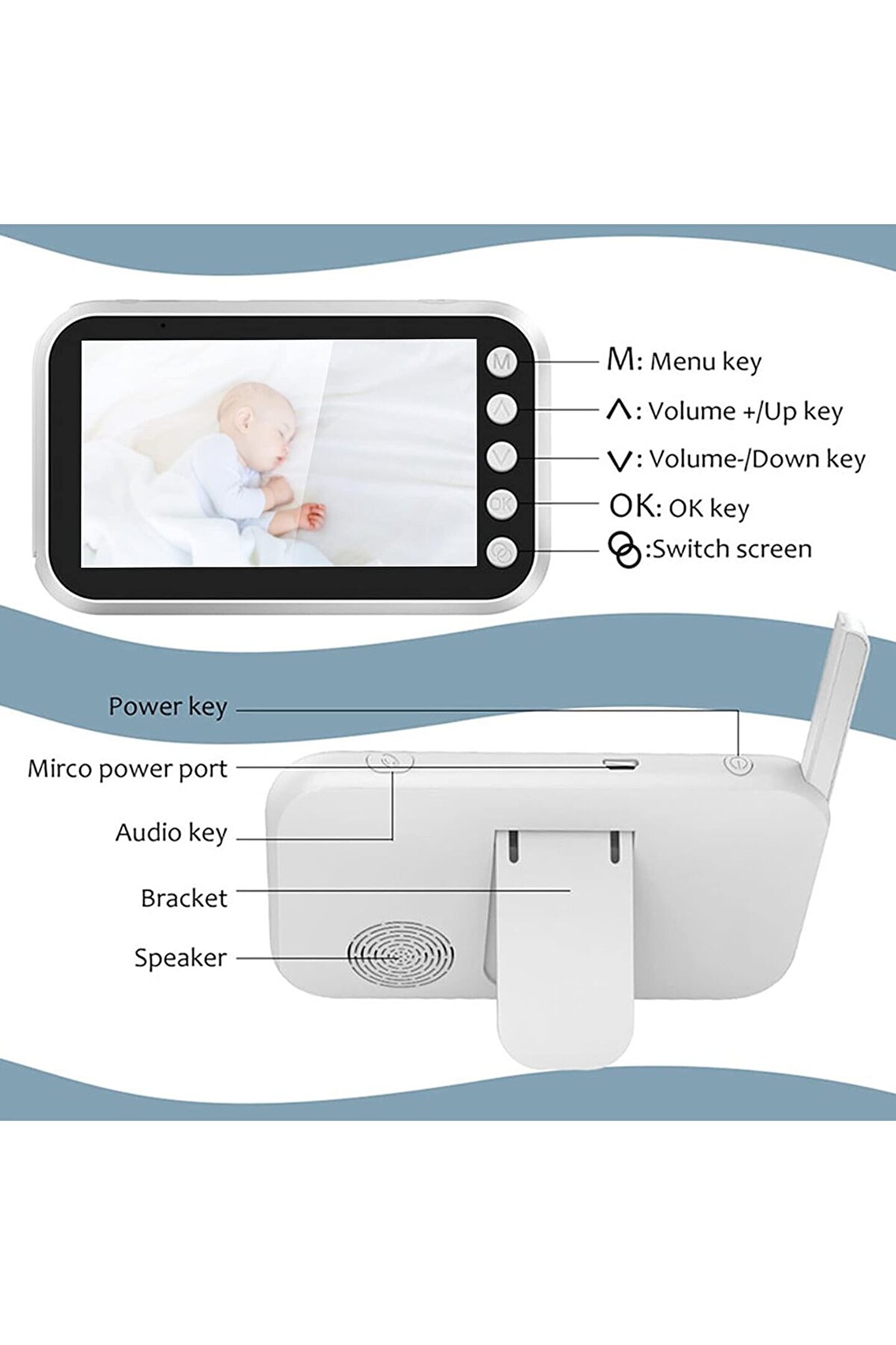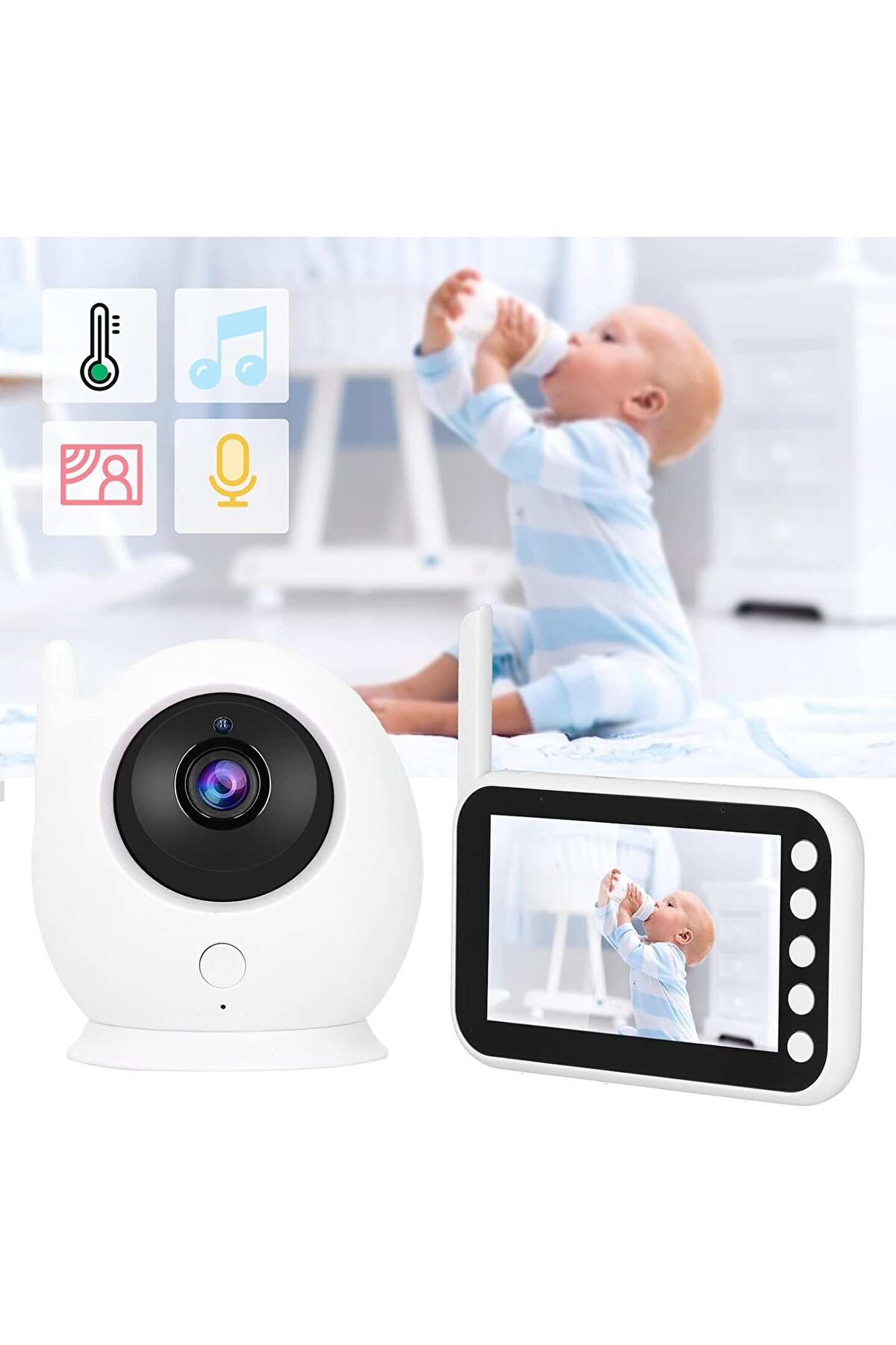 Bu ürün hakkında [Yüksek Çözünürlüklü Monitör]: Bu 720P yüksek çözünürlüklü 4,3 inç kablosuz monitör, net ve ayrıntılı görüntüler sunarak her zaman gözünüzü açık tutmanızı sağlar. Monitör, hızlı tepki vermenize yardımcı olan bir ağlama hatırlatma işlevine sahiptir. ; [VOX Algılama Modu]: Monitör, 30 saniye boyunca herhangi bir işlem yapılmadığında ekranı otomatik olarak kapatan bir VOX algılama moduna sahiptir. Etrafındaki ses seviyesi ayarlanan değeri aştığında ekran aydınlanarak dikkat etmeniz gerektiğinde uyarılmanızı sağlar. ; ?Kızılötesi Gece Görüşü ve İki Yönlü Ses?: Monitör, düşük ışık koşullarında bile gözünüzü açık tutmanıza olanak tanıyan kızılötesi gece görüşü özelliğine sahiptir. İki yönlü ses işlevi net bir şekilde duymanızı sağlar ve sesinizle rahatlamanıza olanak tanır. ; ?Sıcaklık Algılama ve Ses Kontrolü?: Monitör, odanın rahat bir sıcaklıkta olmasını sağlamanıza yardımcı olan bir sıcaklık algılama özelliği içerir. Ses kontrolü, ses seviyesini tercihinize göre ayarlamanıza olanak tanır. ; ?Ek Özellikler?: Monitör, uykuya dalmak için 8 ninni, emzirme ve ağlama hatırlatıcısı, döngü kayıt işlevi ve dahili 2000mAh pil içerir. Güvenli ve parazitsiz bir bağlantı sağlayan 2,4 GHz FHSS iletim yöntemiyle çalışır. Açık alanda 300 m/984 ft'ye varan iletim mesafesiyle evinizin her yerinden izleme yapabilirsiniz. ;