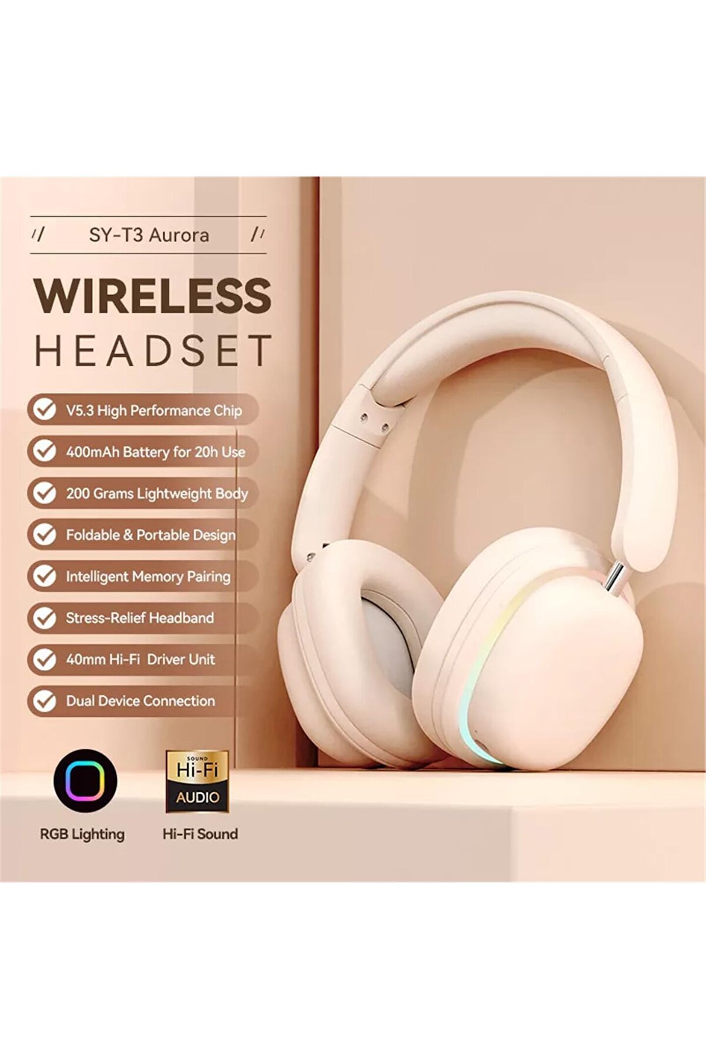 Ürün Açıklaması SY-T3 kulak üstü gürültü engelleme kulaklığı kablosuz spor oyun kulaklığı ultra uzun ömürlü katlanabil kablolu/kablolu çift modu destekler Ürün Açıklaması: Bu kablosuz en son teknoloji ve tasarımı kullanır, katlanabilir, döndürülebilir, geri çekilebilir, farklı kafa şekillerine uyum sağlayabilir, daha esnek ve iyidir.; 5.3 çip, yüksek gürültü azaltma, düşük enerji tüketimi, kararlı bağlantı, HD mikrofon, düşük gecikme süresi, oyun oynaması kolay.; ses kalitesi, 40 mm ultra geniş daire, mükemmel bas, ses, karta takılabilir, ayrıca prize takılmayabilir, kablosunu takmak da kullanımı ra olabilir, hızlı şarj artı.; Gürültü engelleme tasarımı, dahili çift mikrofon, farklılıktan korkmaz, çift mikrofon tasarımı, 360° Çok yönlü radyo, çok yönlü yakalama net ses, böylece net b şekilde arayabilir, bağlanabilirsiniz.; 400mAh yüksek kapasiteli yüksek lı pil, 2 saat şarj, düşük güçlü la donatılmış, 20 saate kadar pil ömrü Kulaklıklar, yumuşak PVC pedleri çemberine, ayarlanabil lar kendi boyutuna, uzun süre daha ra ve ağrısız kullanım sağlar.; Işık efekti, şık müzik çalma, yüksek görünüm seviyesi yumuşak modelleme, eneksel çekirdek tasarım yerine, şık, zarif ve muhteşem ışık efektini vurgulayarak, sizin için sürükleyici yeni b his uyandırır.; Büyük güçlü pil, tam şarjlı 6 saat kullanılabilir, her zaman müzik ihtiyaçlarını karşılamak için, seya elektrik kesintilerinden korkmaz.; Şarkı dinlemek ve video izlemek tatmin edici olabilir.; Geniş uyumluluk, kablosuz çift mod desteği, kablolu, bilgisayarlar, cep fonları vb.; ile uyumludur.; Kablolu, kablosuz anahtarlama, kapanmaktan korkmaz, ly kullanın; İlk kez SY-T3 eşleştirme ile, sonraki önyükleme otomatik olarak çok hızlı bağlantı Not: kablolu mod, yalnızca müzik çalmayı destekler, sesli aramaları desteklemez Şartname: Adı: kulak üstü Model: SY-T3 Malzeme: ABS Renk: Bej, Siyah, (isteğe bağlı) Pil: 400mAh Halka hoparlör: 40mm Bluetooth: 5.3 Mikrofon: VAR