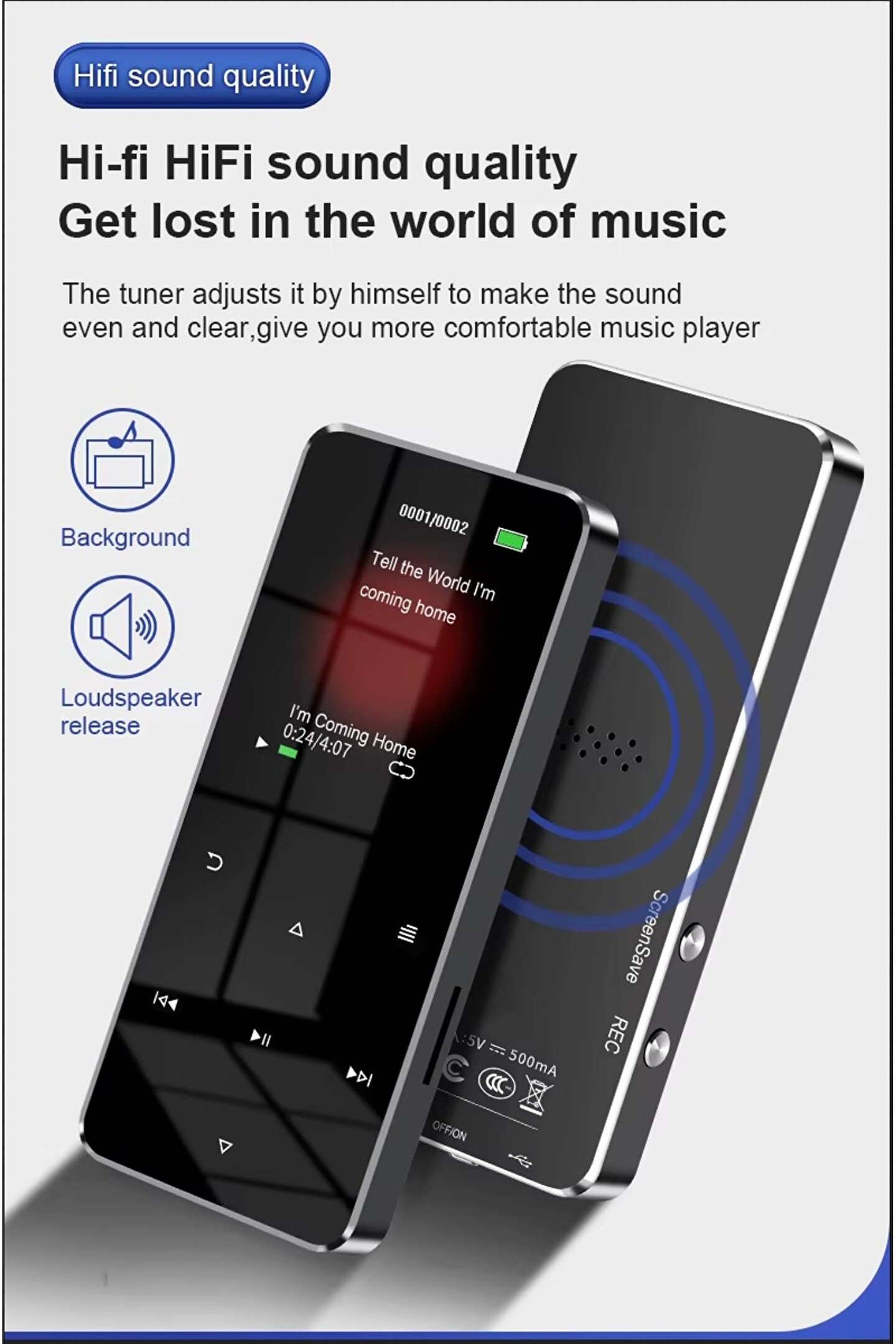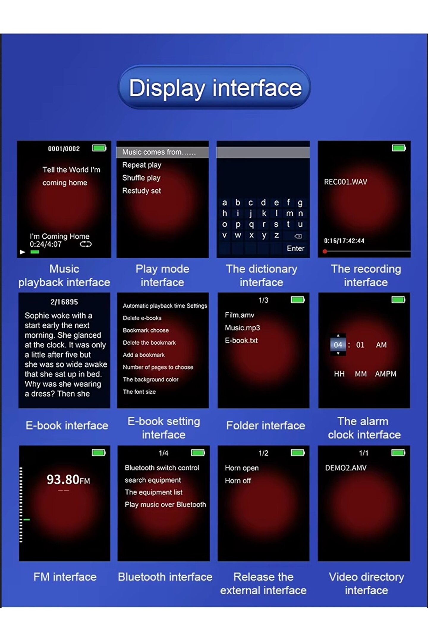 Açıklama: 1; 8 inç renkli ekran Kayıpsız ses kalitesi Bluetooth uyumlu 8 GB DAHİLİ HAFIZA Maksimum destek belleği 128G (dahil değildir) FM radyo E; kitap Özellikler: Sözlük Dahili hoparlör Çalar saat Çoklu dil desteği Video oynatma: AW/AVI (dönüştürülen video) BLUETOOTH KULAKLIK VEYA HOPARLÖR E BAĞLANILABİLİR BLUETOOTH İLE TELEFONA BAĞLANMAZ Paket içeriği: 1; MP3 müzik çalar 1; USB kablosu 1; kullanım kılavuzu 1; kablolu kulaklık;
