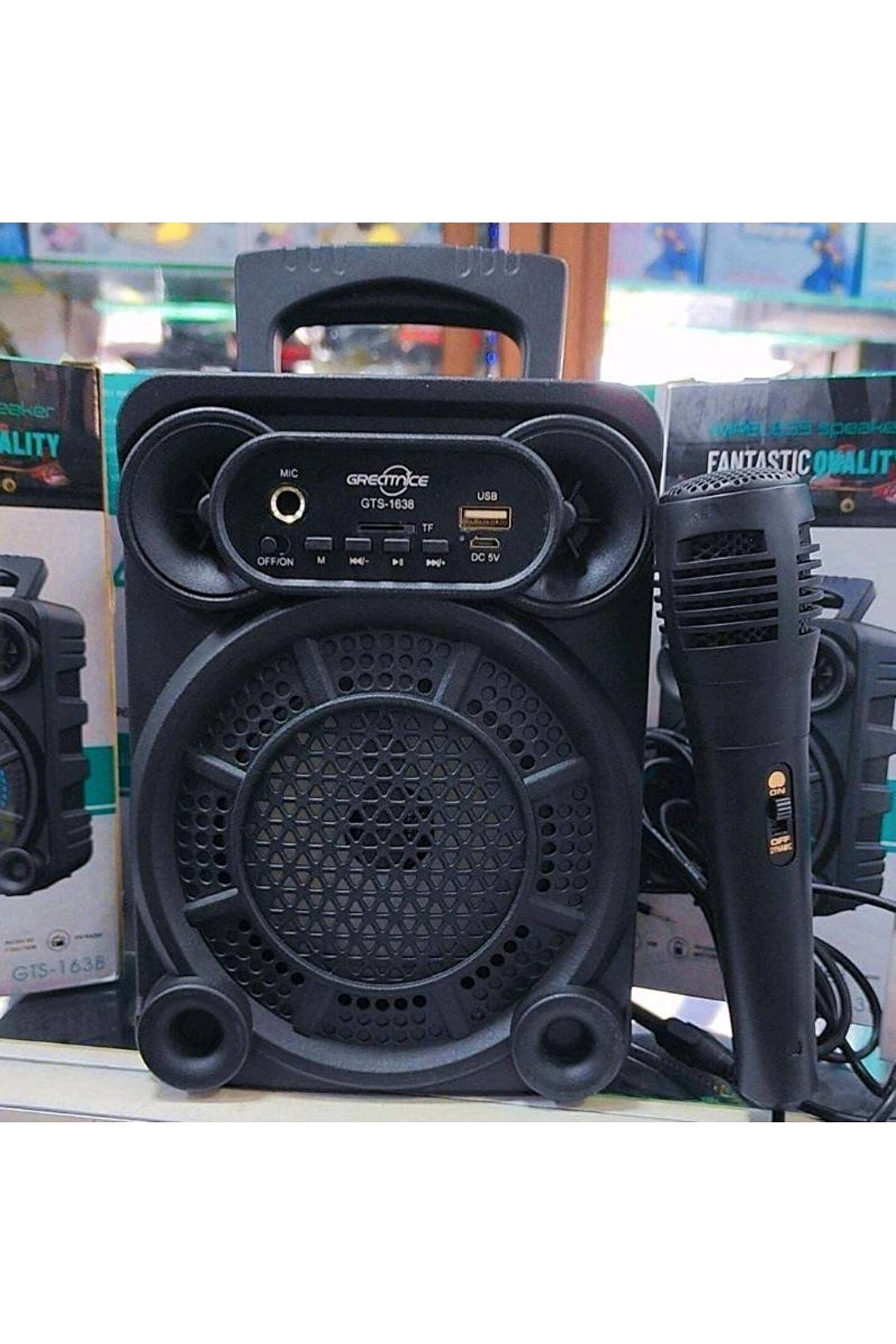 Ürün adıGTS-1638 Açık Taşınabilir Kablosuz 4 inç Subwoofer Mini Karaoke Mikrofonlu Bluetooth HoparlörModeliGTS-1638İşlevBluetooth, FM, USB, TWS, Karaoke Mikrofonu, LED IşıkÜrün boyutu140*109*210mmGüç5WPil3.7V / 500mAhAğırlık780gRenk Kutusu Boyutu14,7*10,8*20cmİşlev1. ; Yepyeni ve kaliteli.2. ; 5W yüksek güç, LED renkli ışıklı hoparlör, ışıklar müzikle birlikte zıplayacaktır.3. ; Dahili stereo ve 360° stereo sağlanır.4. ; Uzun süre müzik çalmak için tekrar tekrar kullanılabilen yüksek kapasiteli lityum pil.5. ; FM radyo, radyoyu özgürce dinlemenizi sağlar.6. ; Destek mp3, wma, WAV, FLAC, ape formatlı müzik dosyaları.7. ; Destek USB 2.0 disk ve TF Kartı8. ; TWS modu desteklenir ve aynı anda iki makine bağlanabilir.9. ; Basit tuş kontrolü, açmak / kapatmak, oynatmak / duraklatmak, modu değiştirmek, şarkıları atlamak, ses seviyesini ayarlamak vb. ; için düğmeye basabilirsiniz.10.Bluetooth 5.0, tüm Bluetooth cihazlarıyla uyumludur.11. ; Karaoke modunu destekleyin, mikrofonu takın ve hemen şarkı söylemeye başlayabilirsiniz.AksesuarlarUSB kablosuRenk kutusuMikrofon;