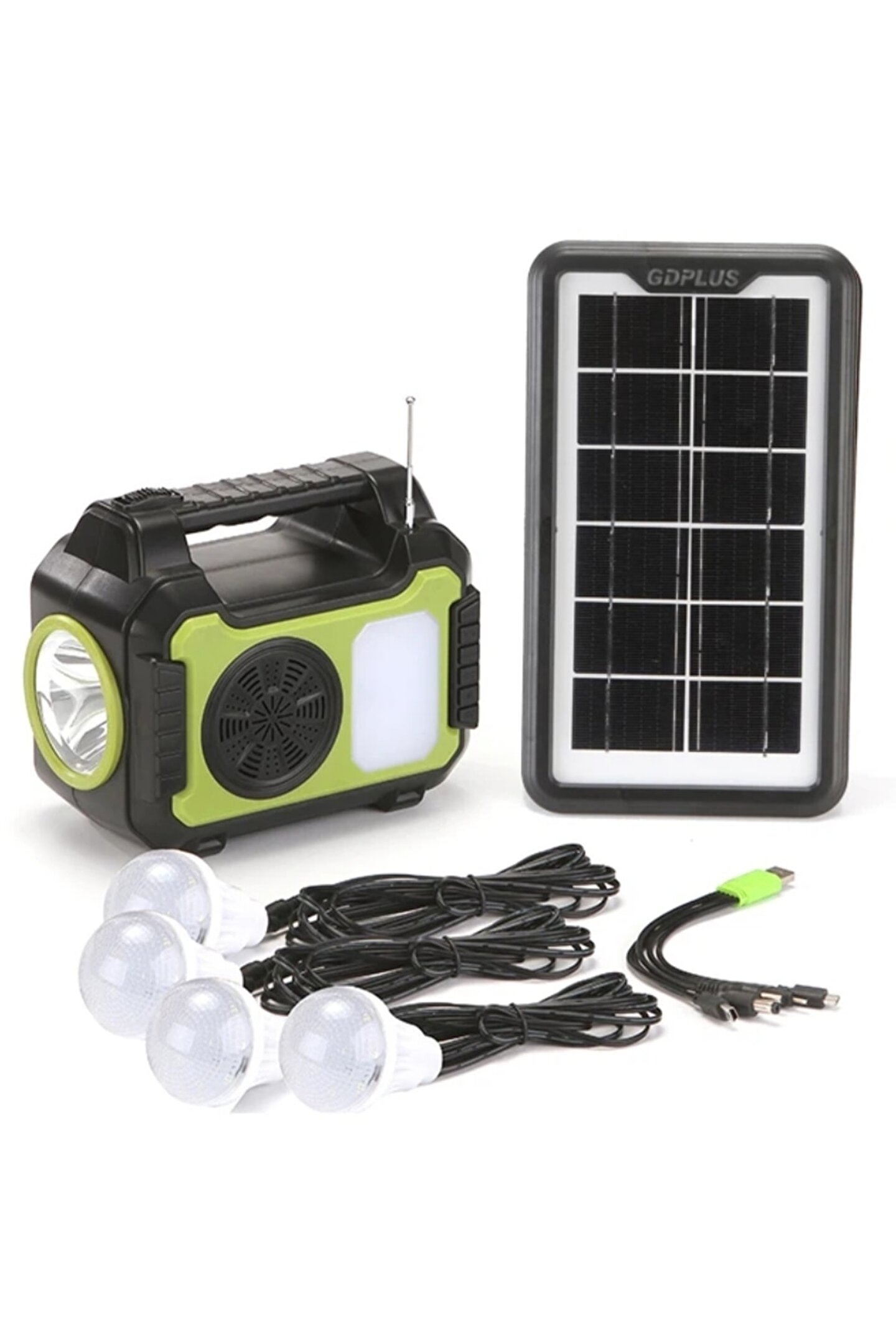 Solar aydınlatma ve şarj sistemi. ; Sistemde güneş paneli, LED el feneri, her biri ayrı açma/kapama anahtarlı 4 adet LED lamba, birden fazla cihazı şarj etmek için USB kablo demeti ve FM radyo bulunmaktadır. ; TF kartı destekler. ; Bluetooth 5.0 bağlantısı.Açık hava etkinlikleri veya acil durumlar için idealdir. ; Mükemmel aydınlatma otonomisi ve pil doluluk göstergesi. ; Güneş veya elektrik tarafından şarj edilir. ; Güneş paneli: 6V 3.5W. ; Güneş paneli boyutu: 27x15x1.5cm. ; El feneri boyutu: 19x17x12cm. ; Pil kapasitesi: 10000 mAh.Şarj süresi: PRİZE TAKILI 8-10 saat. ; 4 ADET LAMBA İLE 15-20 SAAT AYDINLATMA 1 ADET LAMBA İLE 60-80 SAAT AYDINLATMA LAMBALARIN KABLO UZUNLUĞU 2 METRE 80CM SD KART VE USB GİRİŞİ AUX GİRİŞİ BLUETOOTH HOPARLÖR FM RADYO 2 ADET 5V USB ÇIKIŞI;