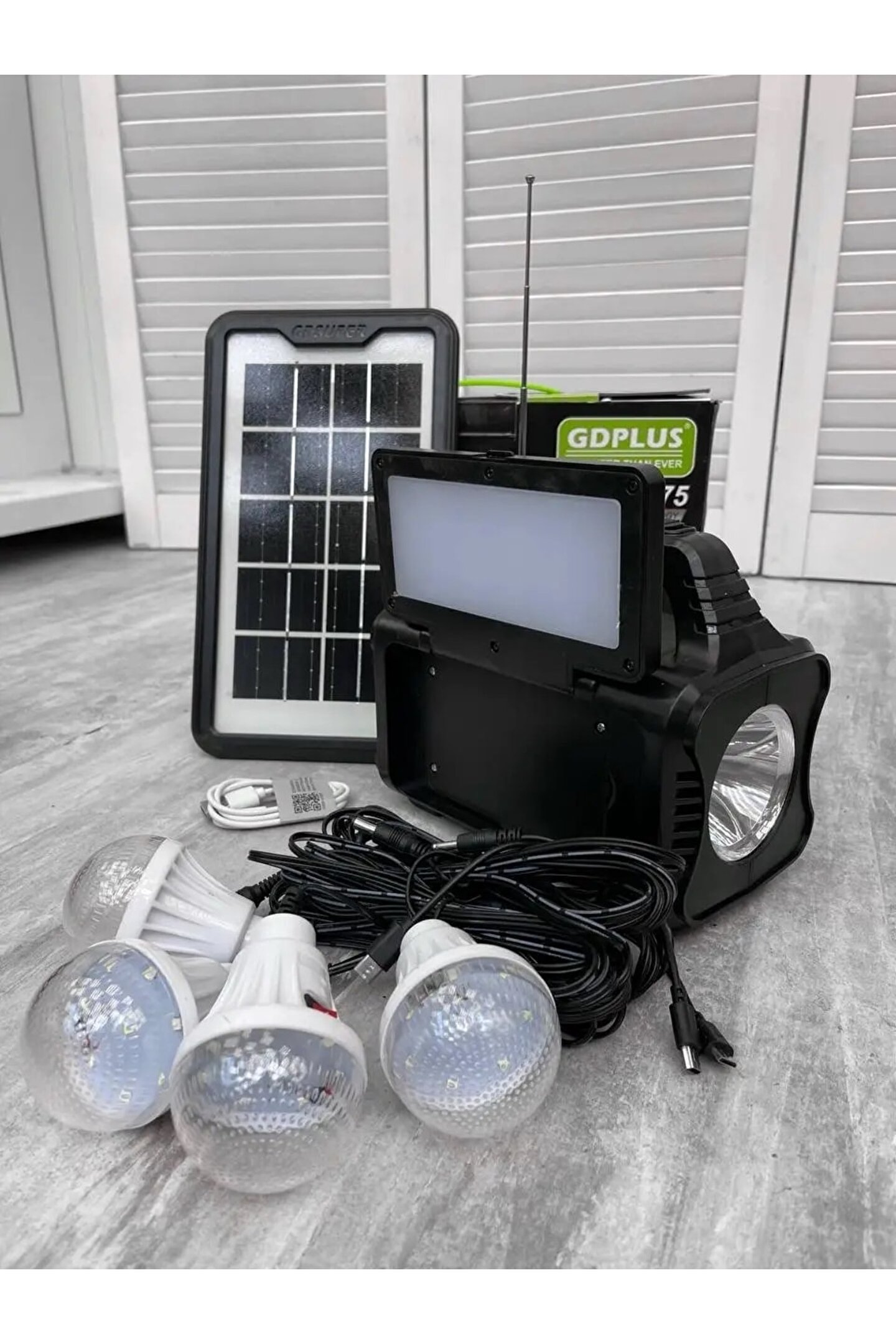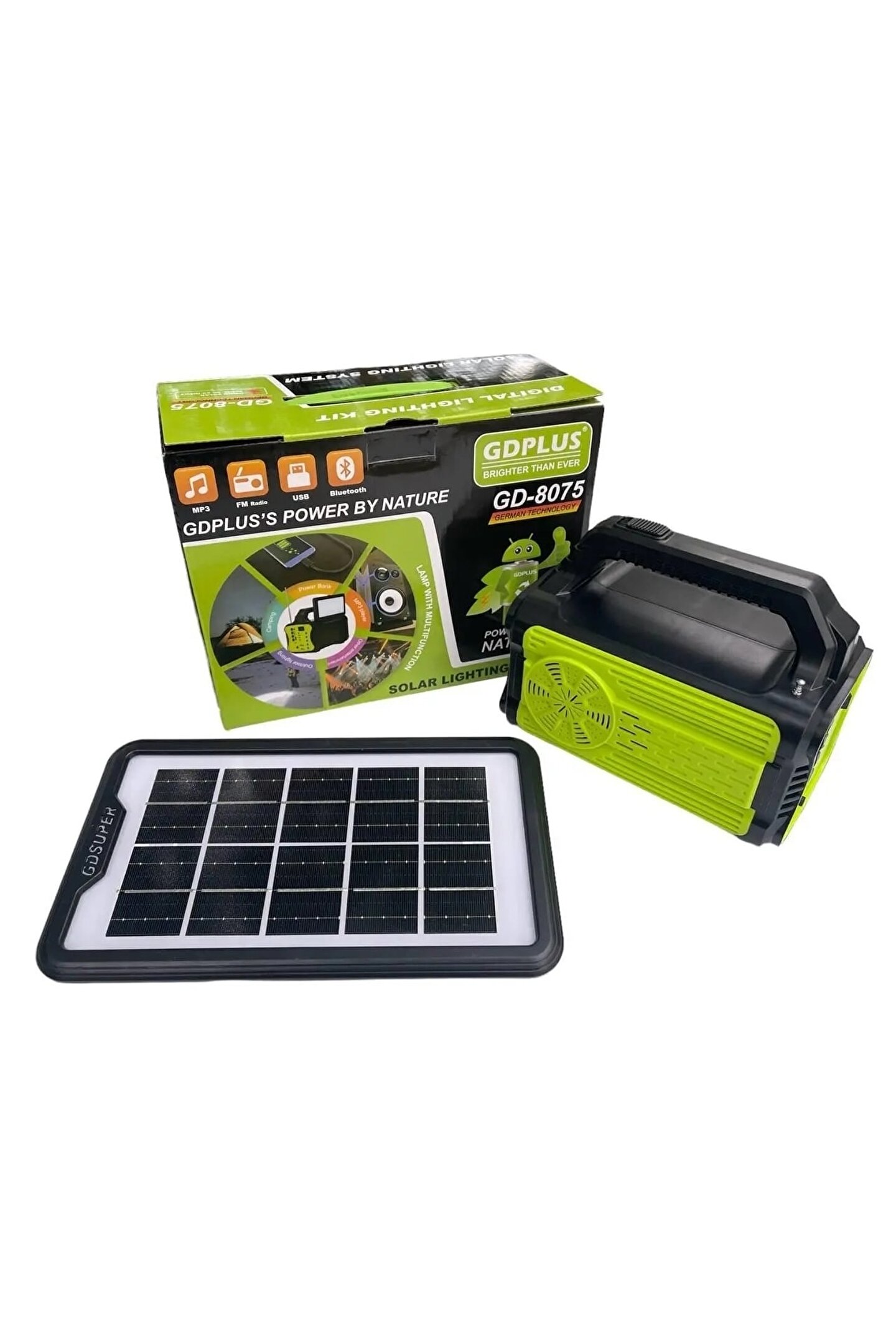 Taşınabilir istasyon.3 m kablolu güneş enerjisi paneli.Telefonları şarj etmek için kablolar.220 V ağdan şarj etmek için kablo.AÇMA/KAPAMA düğmeli 5 metrelik bir kablo üzerinde ampuller - 4 adet.Güç ve aydınlatma için solar şarj sistemi elektriğinizin olmadığı durumlar için ideal çözümdür.İster izole bir alanda, kampta veya elektrik kesintisinde olun, güneş kiti size ihtiyacınız olan tüm olanakları sunar: 4 SMD LED ampul aracılığıyla taşınabilir aydınlatma, LED lambanın yardımıyla ve cep telefonlarını ve diğer cihazları şarj etme 6V pil sisteme dahildir.Ampuller doğrudan sistem pilinden güç alır ve gece lambası olarak kullanılabilir. ; Özel asma sistemi (kordon) sayesinde kamp yaparken çadır önüne kolayca monte edilebilirler. ; Ampullerin tel üzerinde bir AÇMA/KAPAMA düğmesi vardır.Özellikler:Uygulama: Ev, Doğa, Yürüyüş, GezilerGüneş paneli tipi: Monokristal silikonPil tipi: kurşun asitDenetleyici türü: PWMÇıkış gerilimi (USB): 5 volt 1AÇıkış frekansı: 50 HzŞarj süresi (sa): 12-15 saatTelefonunuzdan müzik dinlemek için yerleşik Bluetooth.FM radyoMp3 oynatıcıFenerRenk siyah/yeşilPil: 6V 10000 mAh kurşun-asitMalzeme: ABSYükler: 4,6 W set, LED lambalarŞarj yöntemi: güneş paneli 9V (3,5 watt)/DC9V/AC110V-220Vİşlev: MP3 Çalar/FM Radyo/Spot Işığı/;