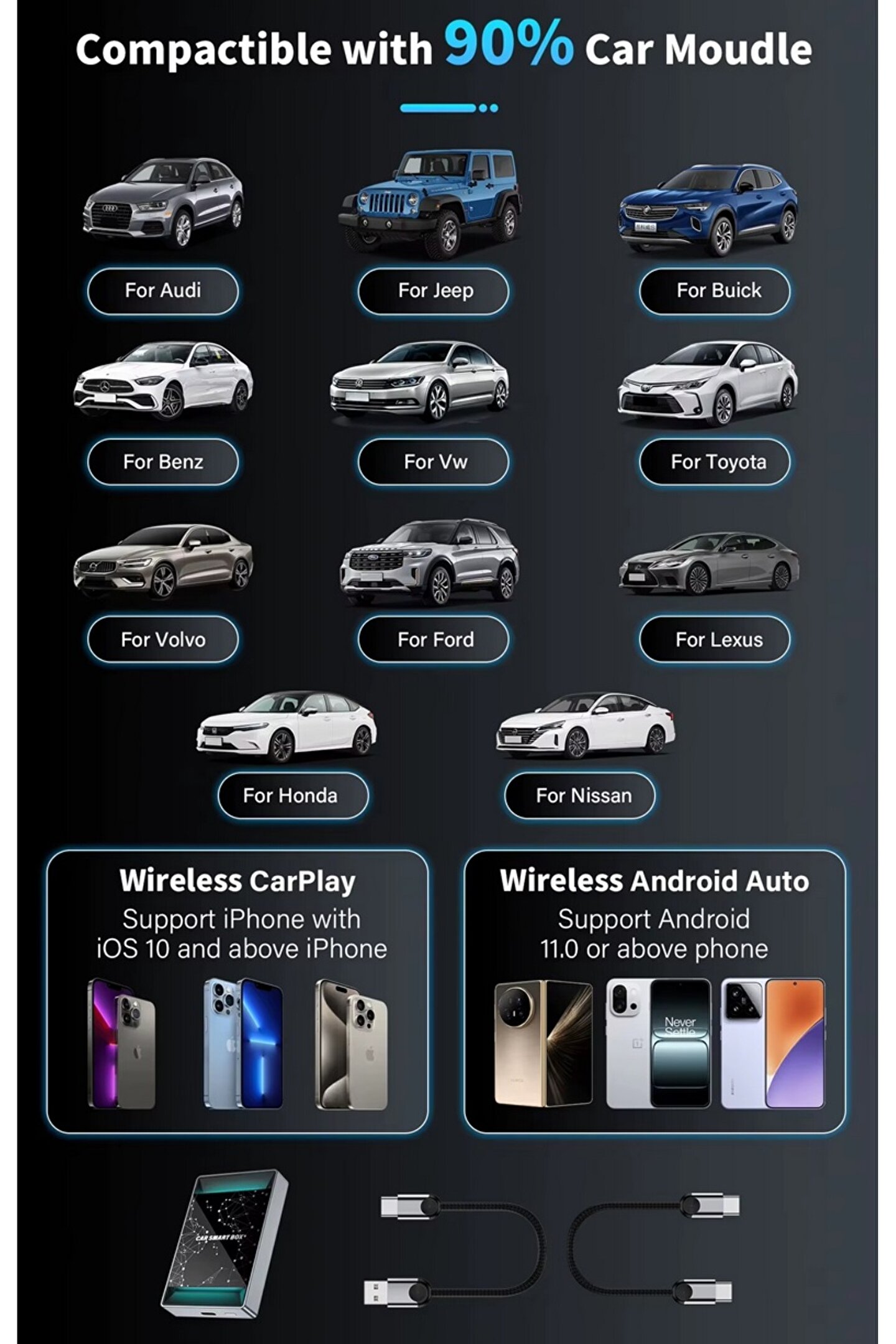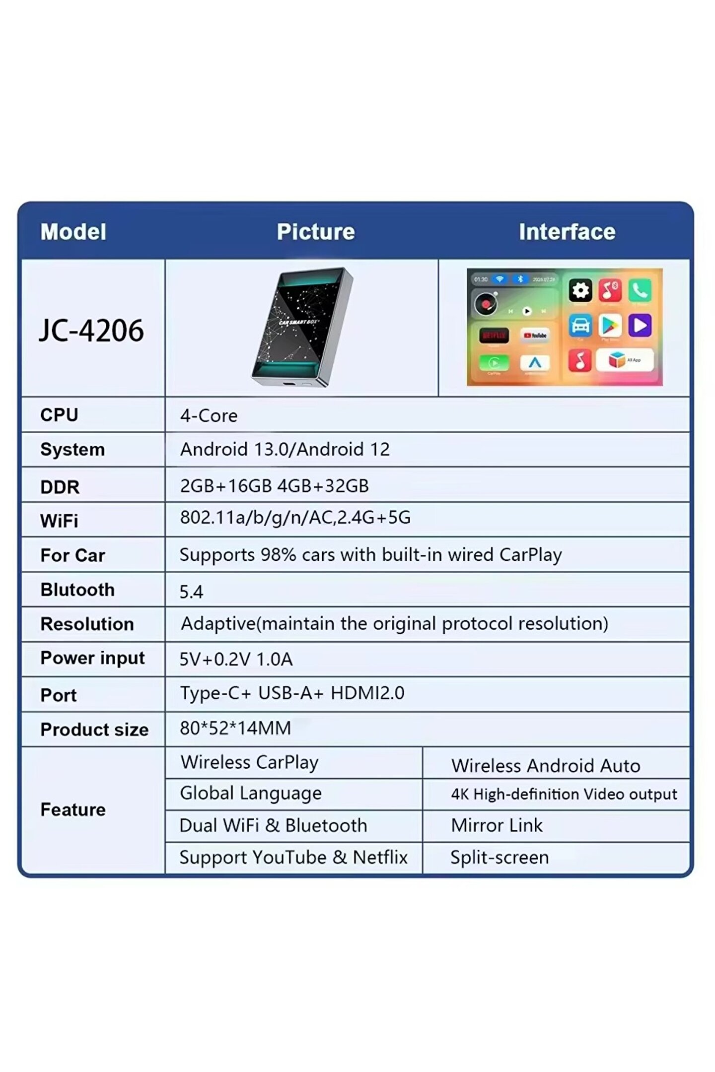 1. Orijinal otomobilin kablolu CarPlay ve kablolu Android Auto arasında çift modlu geçişi destekler2. Dahili HDMI 2.0 protokol çıkışı, iyi uyumluluk,3. 4K yüksek çözünürlüklü video çıkışını destekler. Android kutusunun arayüzü, arabanın arka ekranı, bilgisayar monitörü ve TV gibi diğer ekranlarda görüntülenebilir4. Dahili video oynatıcıları: YouTube, Netflix, TikTok, vb.; Orijinal araba düğmelerini, düğmeleri ve diğer işlemleri tutmak5. Apple Airplay ve Android ayna dökümünü yansıtmayı destekler, cep telefonu arayüzünü araç multimedya ekranına yansıtabilir ve cep telefonu içeriğini senkronize olarak izleyebilirsiniz.6. USB protokolünü destekler, videoları ve müziği bir U diske kopyalayabilir, oynatma için Android kutusuna takabilir ve ayrıca fare ve klavye gibi USB cihazlarını da destekler7. Bölünmüş ekran işlevini destekler8. LED atmosfer ışığı renk ayarını destekler