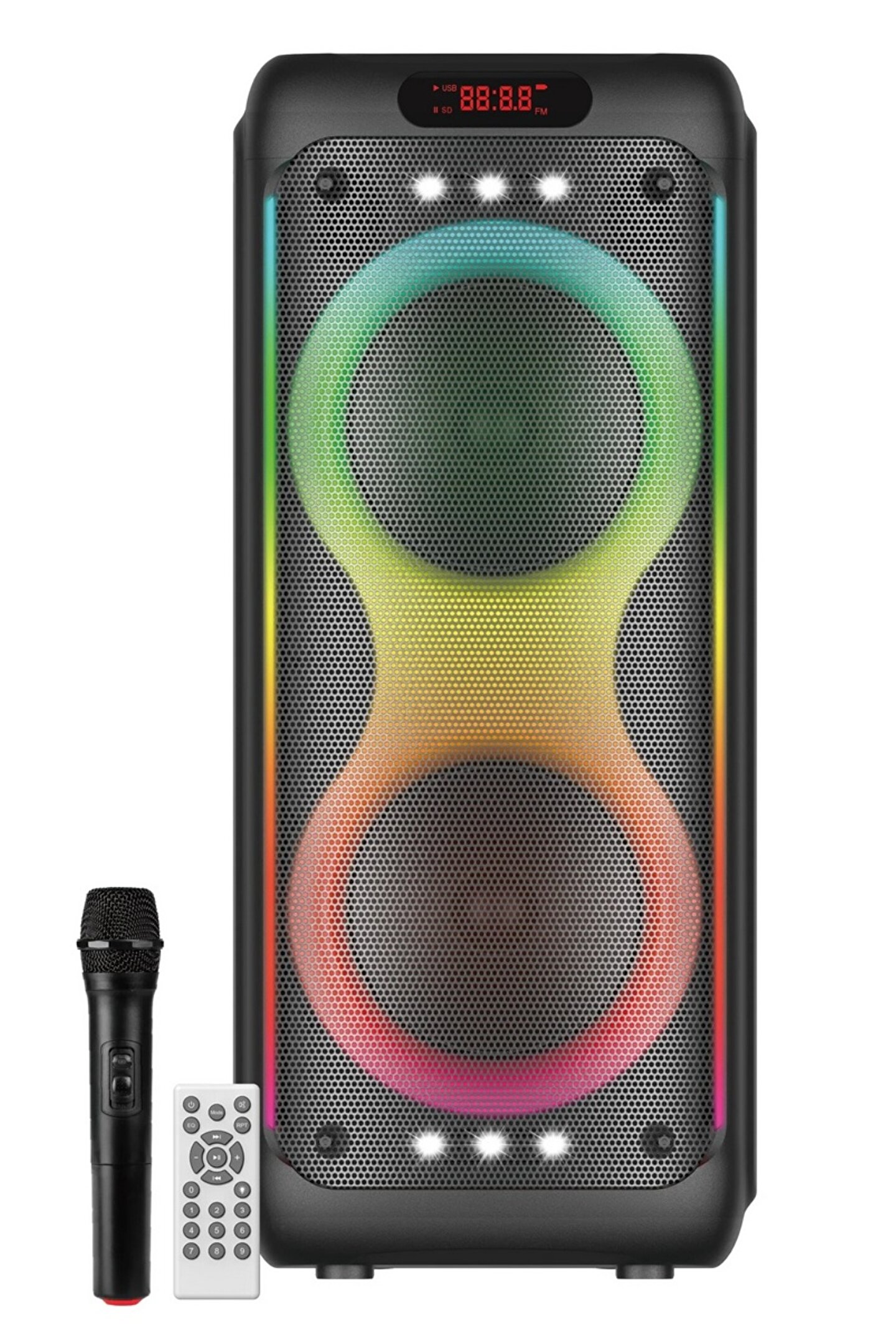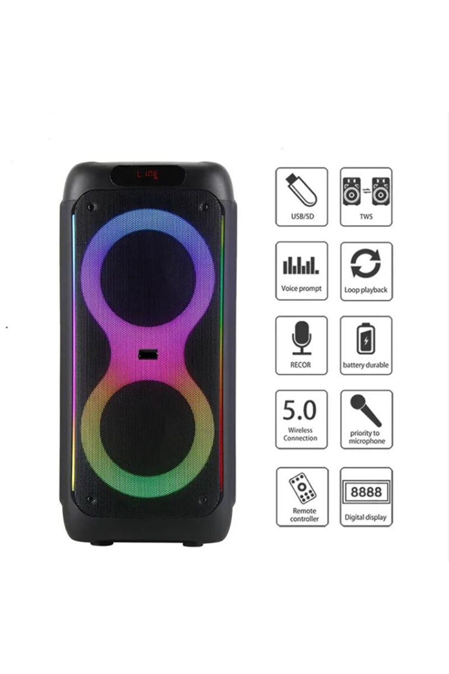 Kts-1829 Büyük Çift 10 İnç Şarj Edilebilir Kablosuz Taşınabilir Parti Bt Hoparlör, Ledli Parti Işığı ve Kablosuz Mikrofon, Uzaktan KumandaFm Radyo Tws Usb Tf kart Mp3 Müzik Çalar ses hoparlörü gts kts Bocina مكبرات الصوتMalzemePP, MetalİşlevBt, Aux, Usb, Tf kart, Tws, Fm radyo, Mikrofon Jakı, Bas, Tiz, Echo, Rec, EQ.RenkSiyah.Hoparlör Özellikleri10 inç x 30W x 2 adet Tweeter.Pil kapasitesi4500mAh Şarj Edilebilir Li-pilÜrün Birim boyutu36,1x34x84,4 cmÜcretsiz aksesuarlarUSB Şarj kablosu x 1 adet, Kablosuz Mikrofon x 1 adet, Uzaktan Kumanda x 1 adet. Karton Boyutu: 39x38x93,6 cmG.W/Koli: 13.06 kg