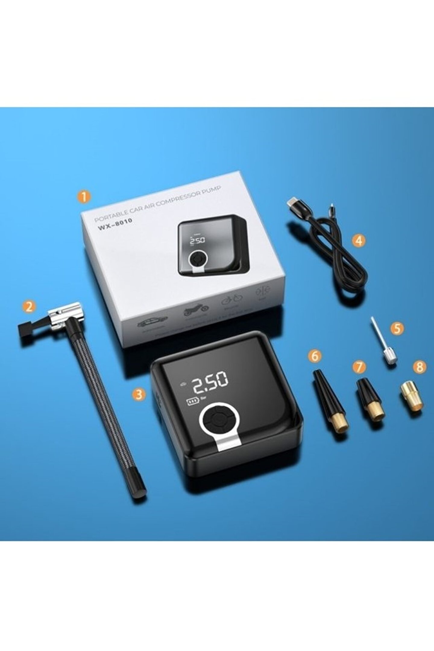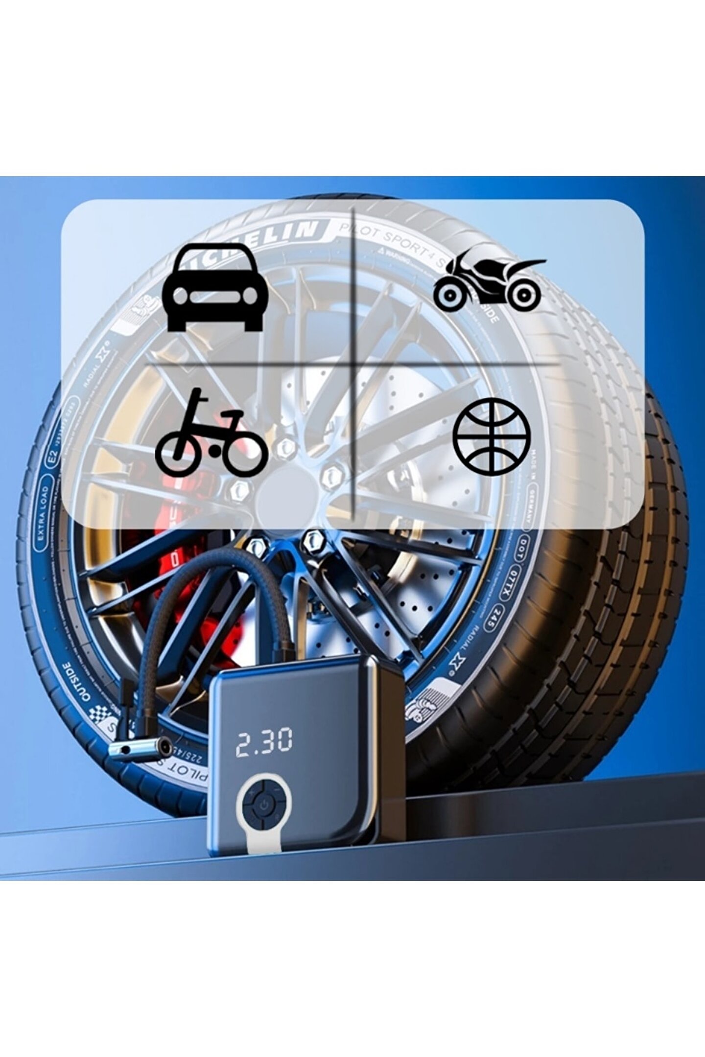 Akıllı araba hava pompası, lastik basıncını her zaman ve her yerde tespit etmenizi sağlar ve çok yüksek veya çok düşük lastik basıncından kaynaklanan lastik lekelerini reddeder ve daha güvenli sürüş sağlar. ; Özellikler: Taşınabilir kablosuz hava pompası, led dijital ekran, doğru basınç ölçümü, lastik basıncı durumunun zamanında ve sezgisel anlayışı ve seyahat güvenliğini sağlar. ; Dört şişirme modunu destekler ve araba/motosiklet/bisiklet lastikleri ve topları şişirmek için çeşitli basınç üniteleri (psı ? bar ? kpa ? kg/cm2) değiştirilebilir. ; Önceden ayarlanmış enflasyon basınç değeri, tam olduktan sonra otomatik durdurma şişmesi, lastik basınç göstergesine her zaman bakmaya gerek yoktur ve aşırı şişirme nedeniyle lastiği havaya uçurmaz. ; Dahili büyük kapasiteli pil, düşük güç tüketimi ve uzun bir dayanıklılığa sahiptir, telefonları, tabletleri, kulaklıkları vb. ; Şarj etmek için bir güç bankası olarak kullanılabilir. ; Led ışık ile karanlıkta acil durum lambası için kullanılabilir. ; Acil durumlarda kullanılabilecek sos yanıp sönen tehlike uyarısını destekleyin. ; Küçük ve taşınabilir, hafif tasarım, kullanımı kolay, bir sırt çantasına koymak çok kolay ve lastik basıncını her zaman ve her yerde şişirmek ve tespit etmek. ; Özellikler: Renk: Siyah + gümüş Malzeme: Abs Çalışma voltajı: 7.4v Pil kapasitesi: 3600mah / 4000mah (isteğe bağlı) Enflasyon aralığı: Maks. ; 150psı Birim: Psı, bar, kpa, kg/cm2 Ürün boyutu: 108*108*37mm/ 4.3*4.3 * 1.5in Ürün ağırlığı: 395g/ 13.9oz Paket boyutu: 170*135*55mm/ 6.7*5.3 * 2.2in Paket ağırlığı: 550g/ 19.4oz Ambalaj listesi: 1 * host 1 * hava tüpü 1 * usb kablosu Farklı uygulamalar için 4 x konektörler 1 * kullanım kılavuzu.;