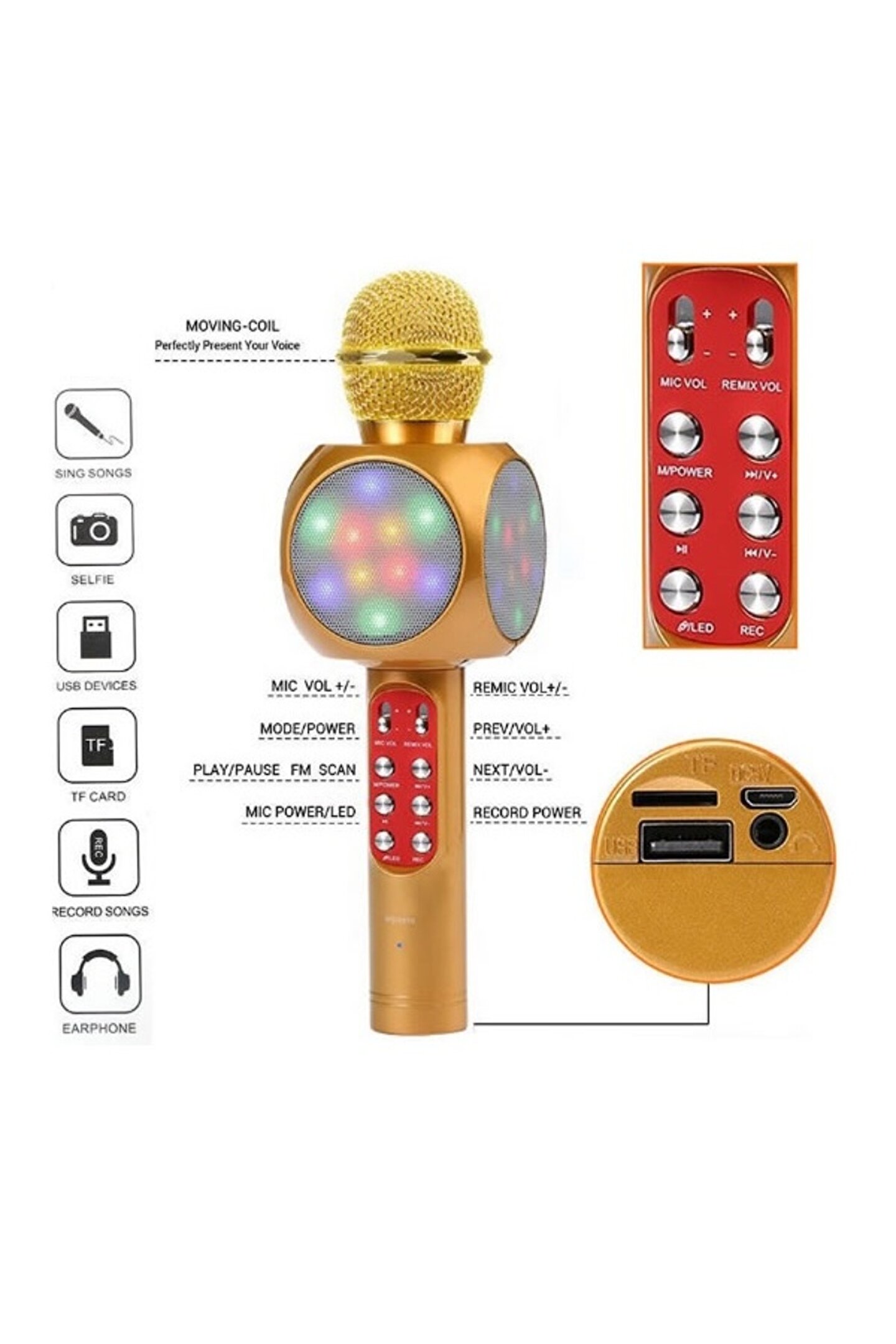 ŞARJLI KABLOSUZ KARAOKE MİKROFON BLUETOOTH HOPARLÖR SES DEĞİŞTİRME ÖZELLİKLİ SD KART USB GİRİŞLİ 5V ŞARJ GİRİŞİ 1800MAH 18650PİL 2X5W HOPARLÖR LED IŞIKLI