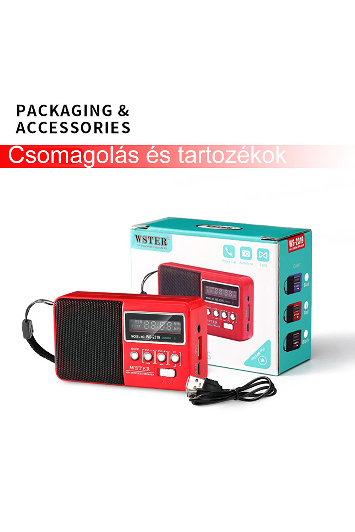Ürün Detayları ; * Model numarası :WS-2319 * Özellikler: Bluetooth oynatma, TF kart U disk okuma, FM radyo, TWS, LED ekran * Çıkış gücü :1*3W * Hoparlör :45MM*1 * Şok modu: Yok * Pil :1*500 mah * Radyo: 88-108 FM * Bluetooth sürümü :AB5.3 * Renkler: Siyah, mavi, Kırmızı * Giriş voltajı :5V Ürün Açıklaması Müzik çalarken telefon görüşmelerini yanıtlamayı destekler Dahili FM radyo Tak-çalıştır tipi mini hoparlör USB/SD kartı destekler Masaüstü bilgisayarlar, akıllı telefonlar ve çeşitli cihazlarla uyumludur USB arayüz tasarımı, Bluetooth uyumlu cihazlarla tak ve çalıştır, kurulumu ve kullanımı kolay Kompakt ve hafif, taşınması kolay, klipsli cep radyosu İşlev: USB/SD kart Mp3 ses dosyasını oynat Harici ses girişi harici güç şarj arayüzü FM otomatik taramalı radyo Otodin sistemli hoparlör