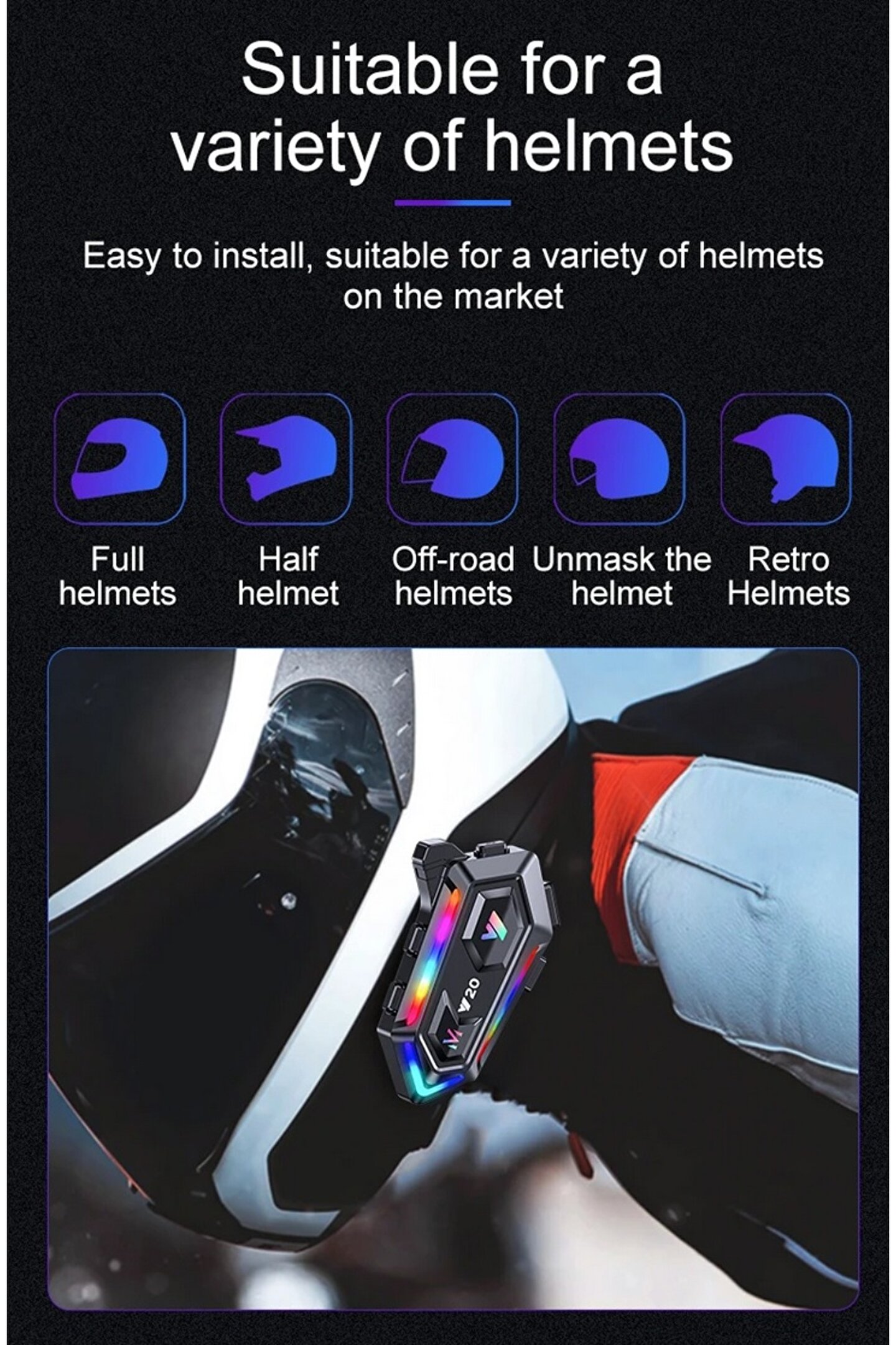 Ürün AçıklamasıÜrün adıMotosiklet Bluetooth Interkom Kask KulaklıkBluetooth sürümü5.3Gürültü azaltmaCVC+DSPCipsJLPil kapasitesi1000MAHSu geçirmezIPX6Şarj voltajı5V/1ABluetooth arama süresi18 saatY20M Motosiklet kaskı kulaklıklarıTüm Bluetooth interkom kulaklıklarını destekler. ; Bluetooth 5.3 çipi, IPX6 su geçirmez, akıllıÇok katmanlı gürültü azaltma, gürültüyü filtreleyerek ve desibelleri etkili bir şekilde azaltarak çağrı iletişimini mükemmel hale getirir. ; SesNet ve yüksek sesle, iki telefonu aynı anda tek bir cihaza bağlayabilirsiniz. ; Müzik dinlemeye geçiş yapmak ücretsiz,Navigasyon, telefon çağrılarını yanıtlama.;