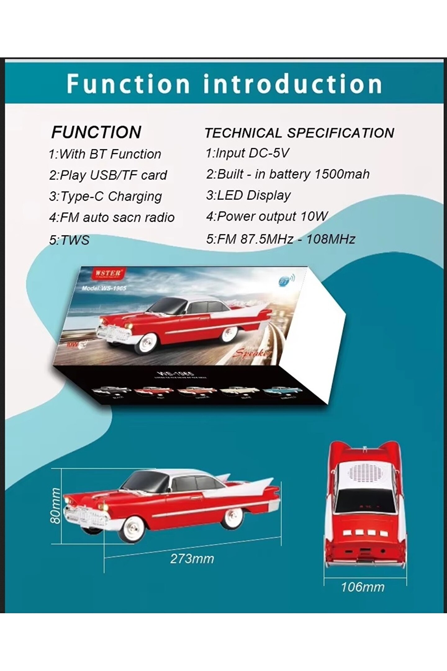 <div id="rich-content-wrapper"> <div> <table> <tbody> <tr> <td colspan="1" rowspan="1"> <div> <div> <b>Ürün modeli</b> <br> </div> </div> </td> <td colspan="4" rowspan="1"> <div> WS-1965 <br> </div> </td> </tr> <tr> <td colspan="1" rowspan="1"> <div> <div> <b>Malzeme</b> <br> </div> </div> </td> <td colspan="4" rowspan="1"> <div> ABS plastik <br> </div> </td> </tr> <tr> <td colspan="1" rowspan="1"> <div> <div> <b>Fonksiyon</b> <br> </div> </div> </td> <td colspan="4" rowspan="1"> <div> Eller serbest çağrı/BT/AUX/TF kartı/USB <br> </div> </td> </tr> <tr> <td colspan="1" rowspan="1"> <div> <div> <b>Birim boyutu</b> <br> </div> </div> </td> <td colspan="4" rowspan="1"> <div> 28*11.2*8.7CM <br> </div> </td> </tr> <tr> <td colspan="1" rowspan="1"> <div> <div> <b>Çıkış gücü</b> <br> </div> </div> </td> <td colspan="4" rowspan="1"> <div> 10W <br> </div> </td> </tr> <tr> <td colspan="1" rowspan="1"> <div> <div> <b>Kablosuz mesafe</b> <br> </div> </div> </td> <td colspan="4" rowspan="1"> <div> 10 metre <br> </div> </td> </tr> <tr> <td colspan="1" rowspan="1"> <div> <div> <b>Çalma süresi</b> <br> </div> </div> </td> <td colspan="4" rowspan="1"> <div> 2-4 saat <br> </div> </td> </tr> <tr> <td colspan="1" rowspan="1"> <div> <div> <b>Pil</b> <br> </div> </div> </td> <td colspan="4" rowspan="1"> <div> 1500mAh <br> </div> <div> <br> </div> </td> </tr> </tbody> </table> <div> <br> </div> </div> </div>