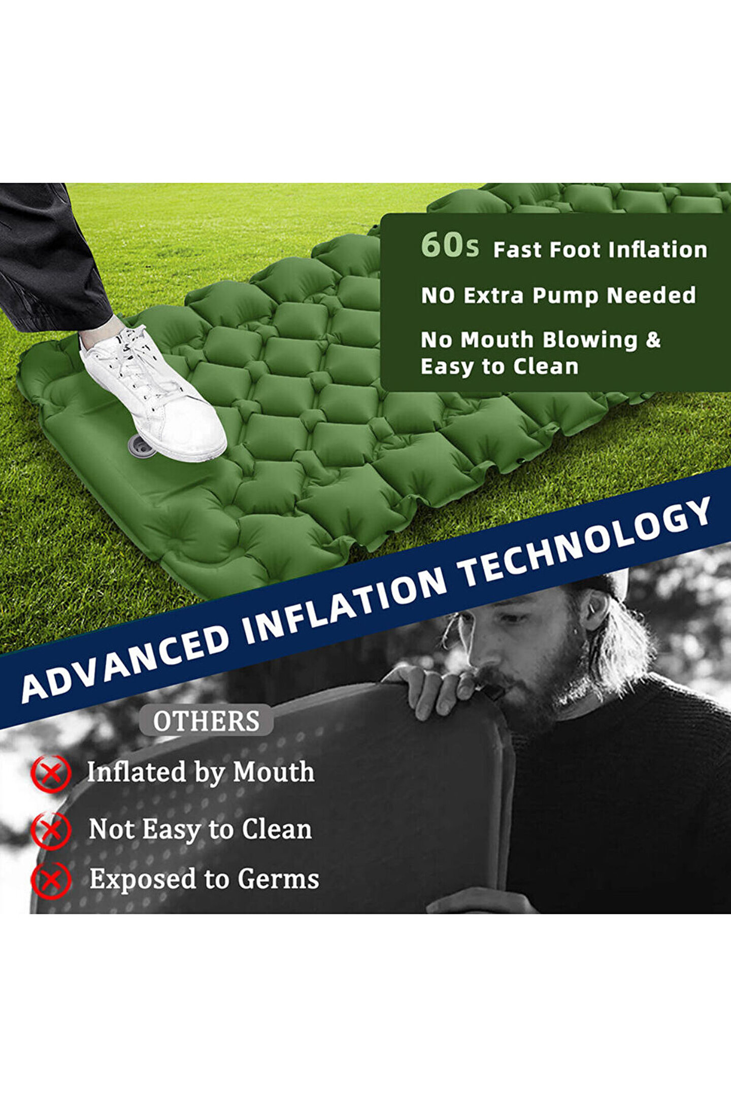 - Kendinden pompalı yapısı sayesinde kolayca şişirilip indirilebilir, pratik kullanım sunar; - Tek kişilik boyutuyla ideal konfor ve rahatlık sağlar, kamp ve plaj aktivitelerinizde mükemmel uyku deneyimi yaşatır; - Hafif ve taşıması kolay tasarımı ile seyahatlerinizde ekstra yük oluşturmaz, taşınabilirliği artırır; - Dayanıklı malzemelerden üretilmiştir; hava koşullarına karşı dayanıklılık gösterir ve uzun süreli kullanım için idealdir; - Şişme yatak, kamp çadırı veya plajda rahatça kullanabileceğiniz uyku pedi olarak tasarlanmıştır; konforlu bir uyku ortamı yaratır;
