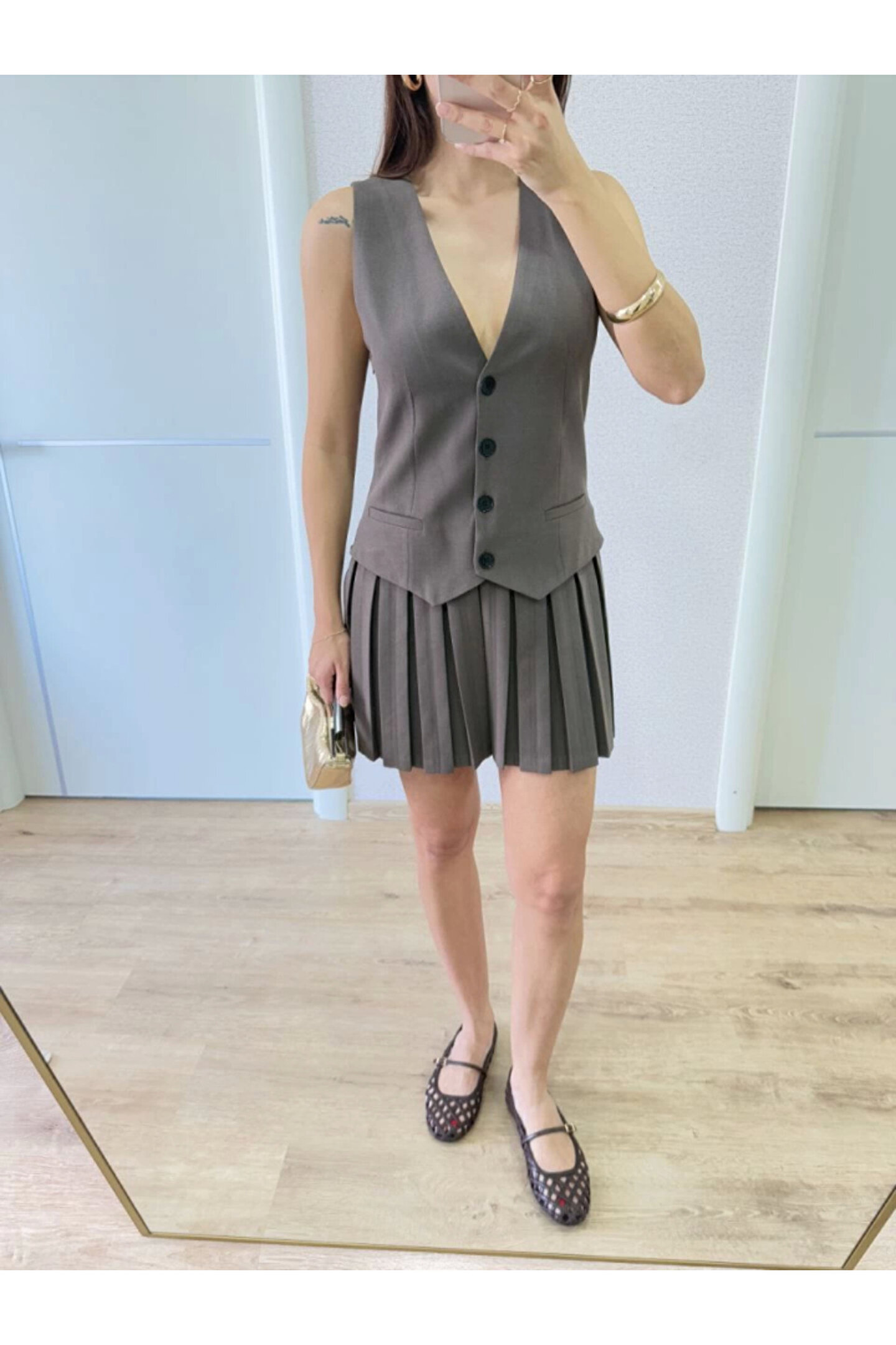 Takım Görünümlu Yelekli Mini Elbise- Füme