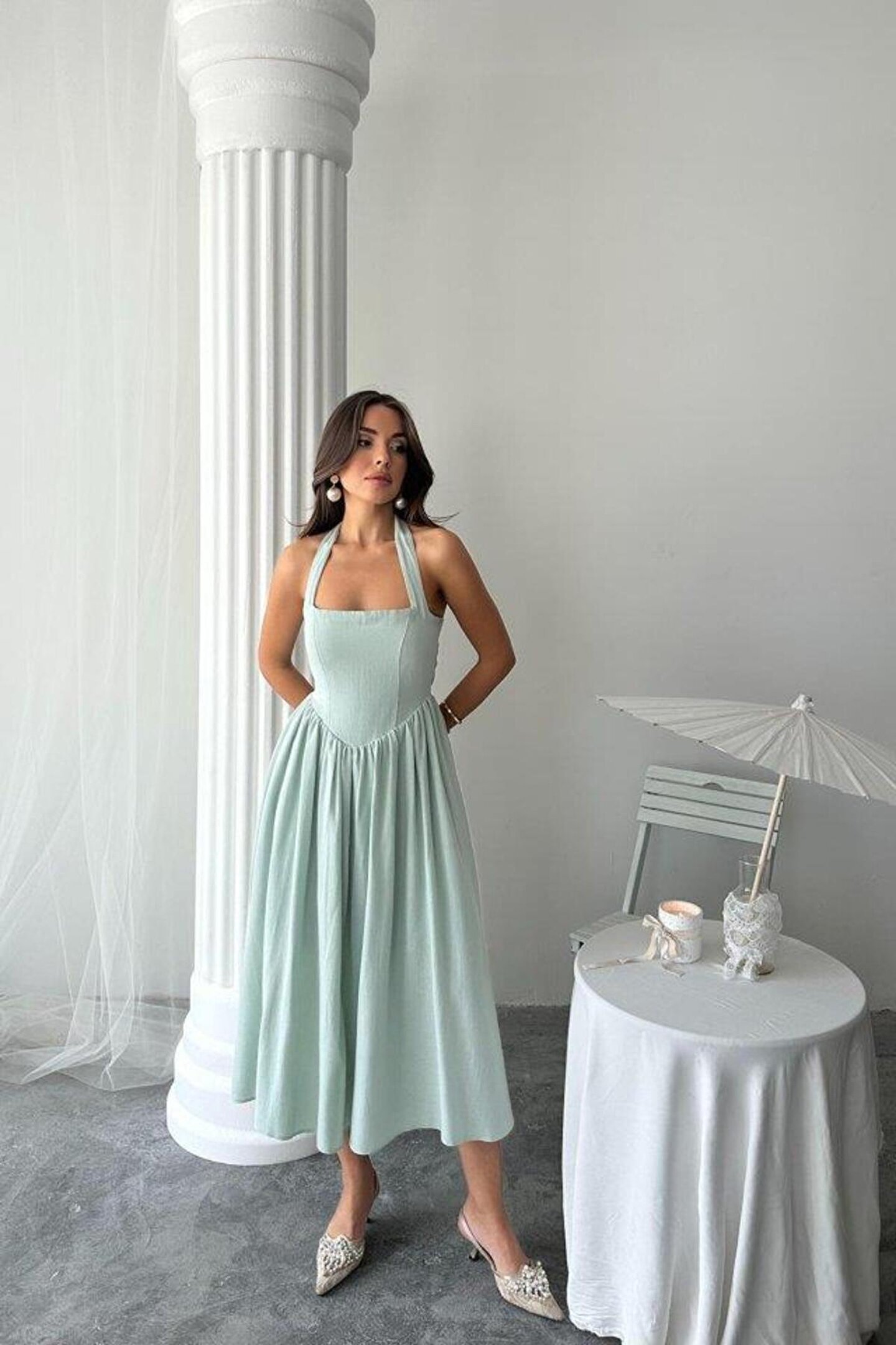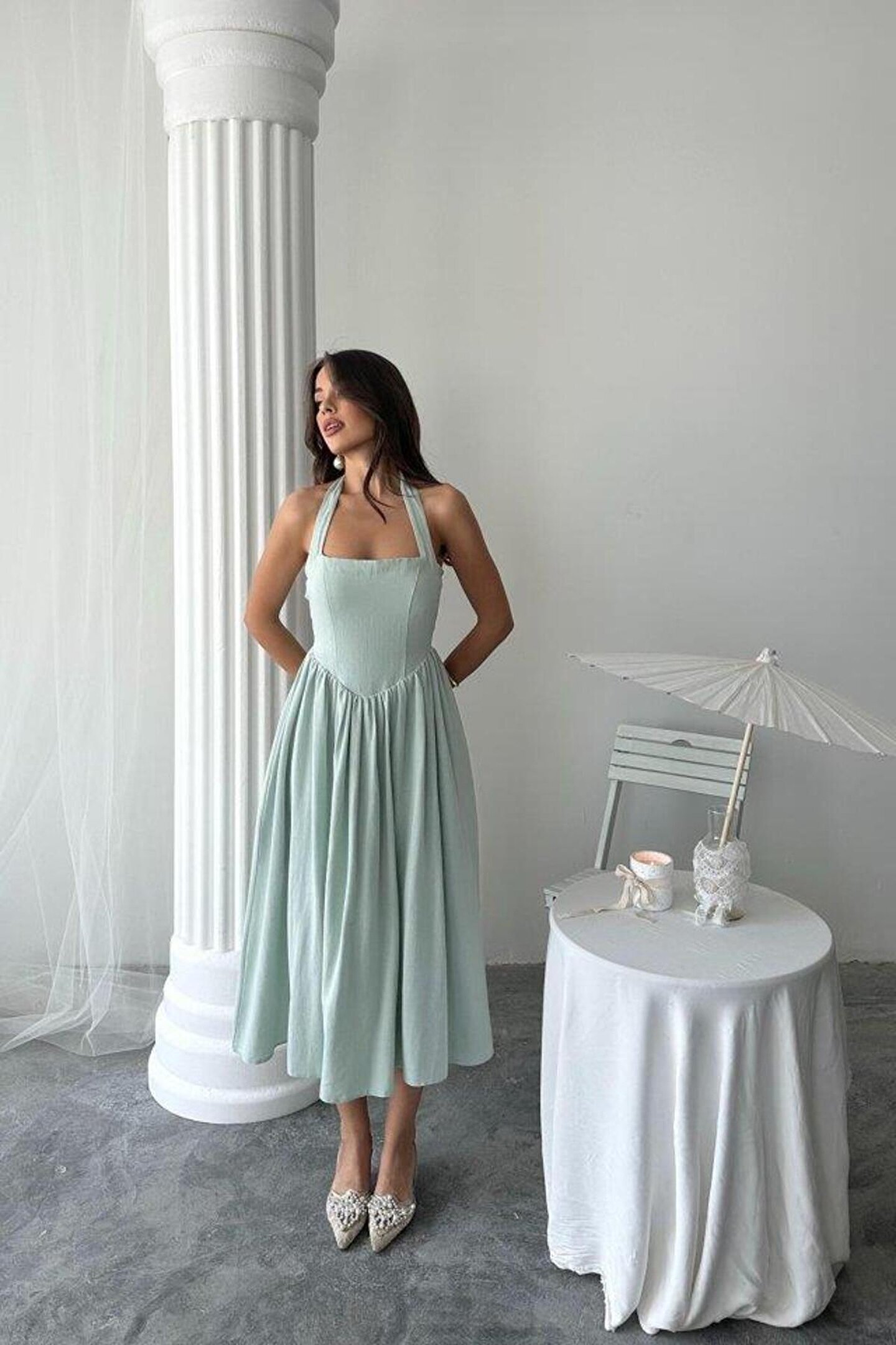 Mint Boyundan Bağlamalı Keten Elbise
