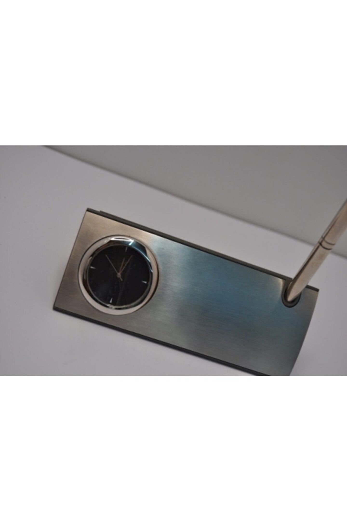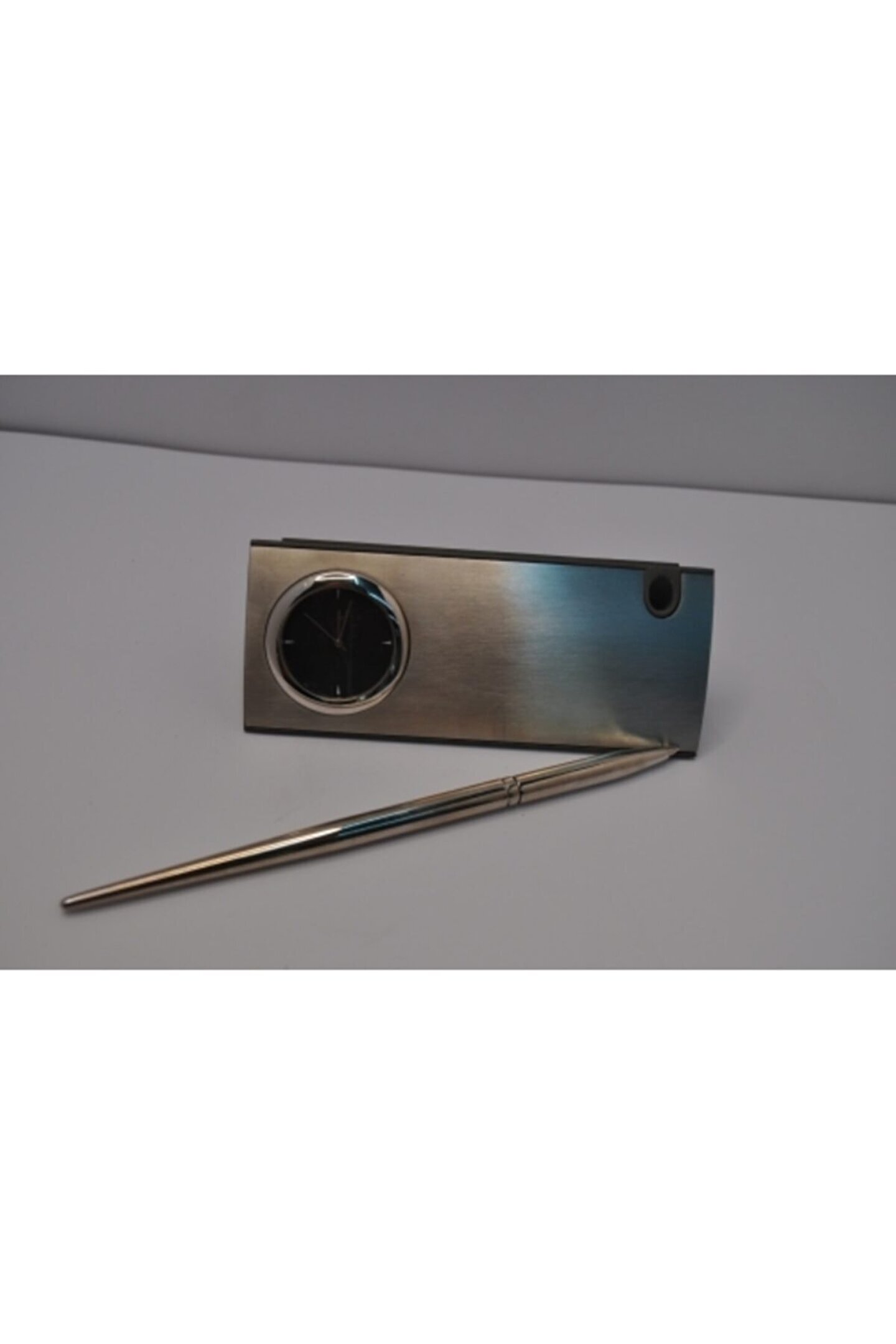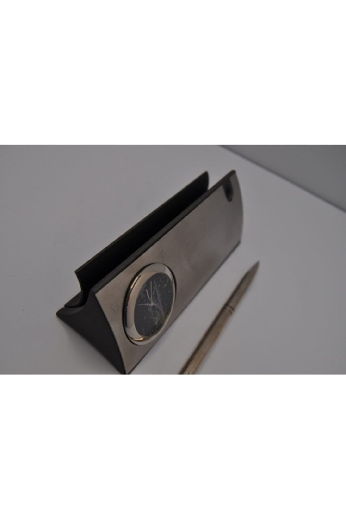 Dayanıklı metal malzeme kullanımı, uzun ömürlü ve sağlam bir kullanım sunar; Modern tasarımıyla ofis veya ev ortamınıza şıklık katar; Saat ve gümüş kalem gibi aksesuarlarla tamamlanan bu kartvizitlik, hem işlevsel hem de estetik bir görünüm sağlar; Metal malzeme sayesinde kolay temizlenebilir yüzeyi ile hijyenik bir kullanım imkanı sunar;