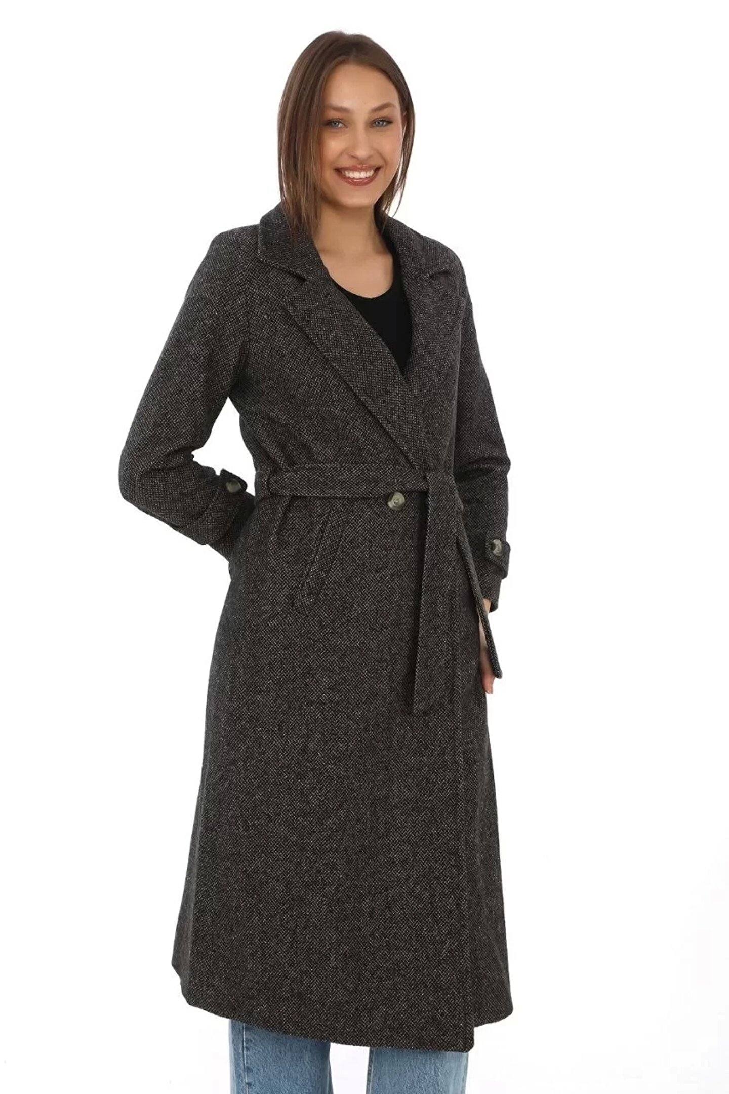 kalimbus Kadın Astarlı Balık Sırtı Kaşmir Kaşe Kaban - Kahverengi