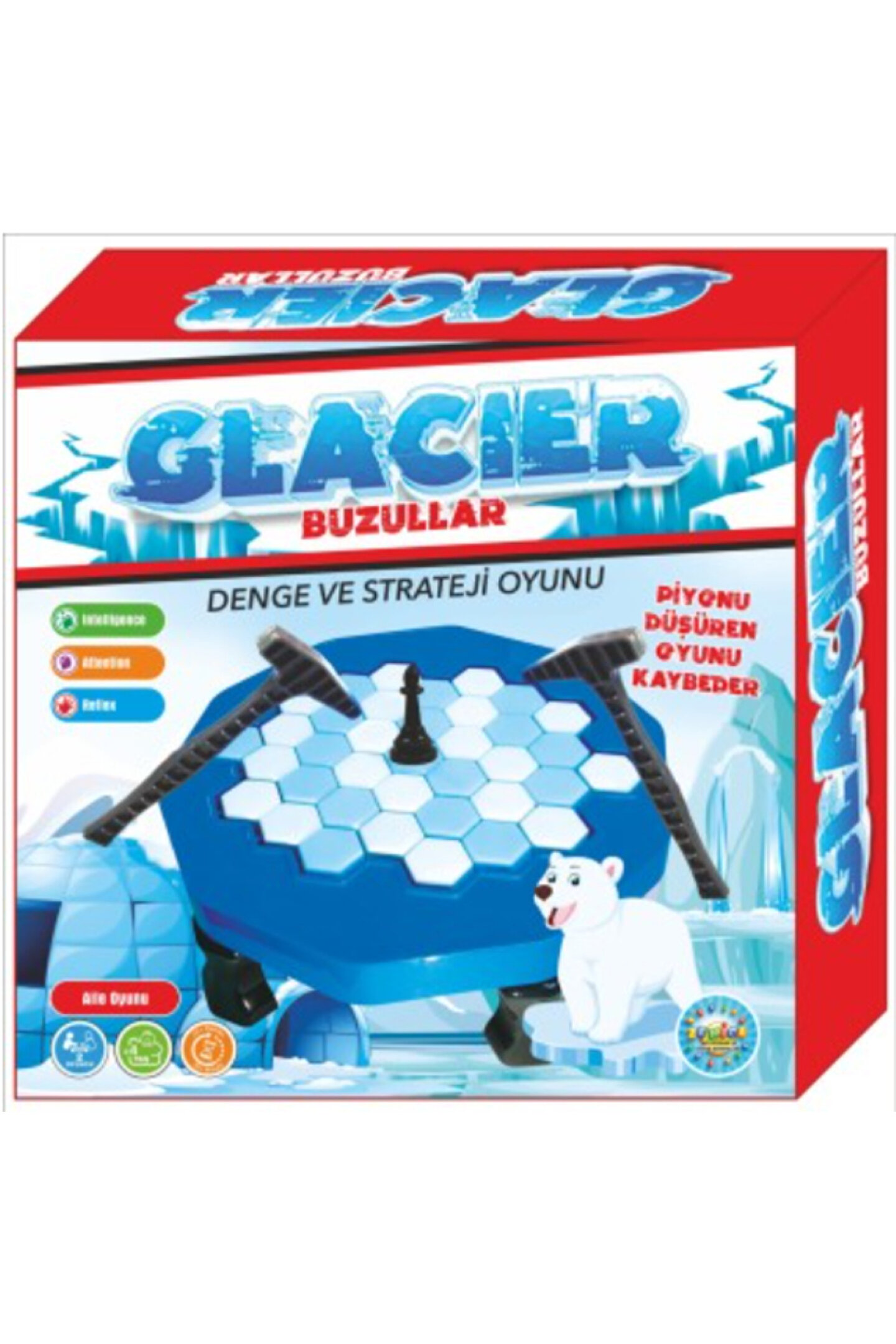 İçindekiler 37 Adet Buz Küpü 2 Adet Çekiç 1 Adet At 1 Adet Oyun Çerçevesi 4 Adet Oyun Çerçevesi Ayağı Oyun Hazırlanışı Oyun çerçevesinin ayakları takılır. Oyun çerçevesi düz bir zemine ters olarak çevirilir ve buz küpleri renk ayrımı olmaksızın yerleştirilir. Oyun çerçevesi ayaklarının üzerinde durabilecek şekilde düz çevirilir. Çerçevenin orta noktasındaki buz küpünün üzerine piyon yerleştirilir. Oyun Kuralları 2 oyuncu sıra ile buz küplerine birer vuruş yaparak küpü çerçevenin dışına çıkartır. Oyuncu küpleri kontrol ederek vuruş yapamaz ve çekiçle ilk dokunduğu küpü düşürmek zorundadır. Oyun orta noktadaki piyonun düşmesine kadar devam eder. Orta noktadaki piyonu düşüren oyuncu oyunu kaybeder. ;