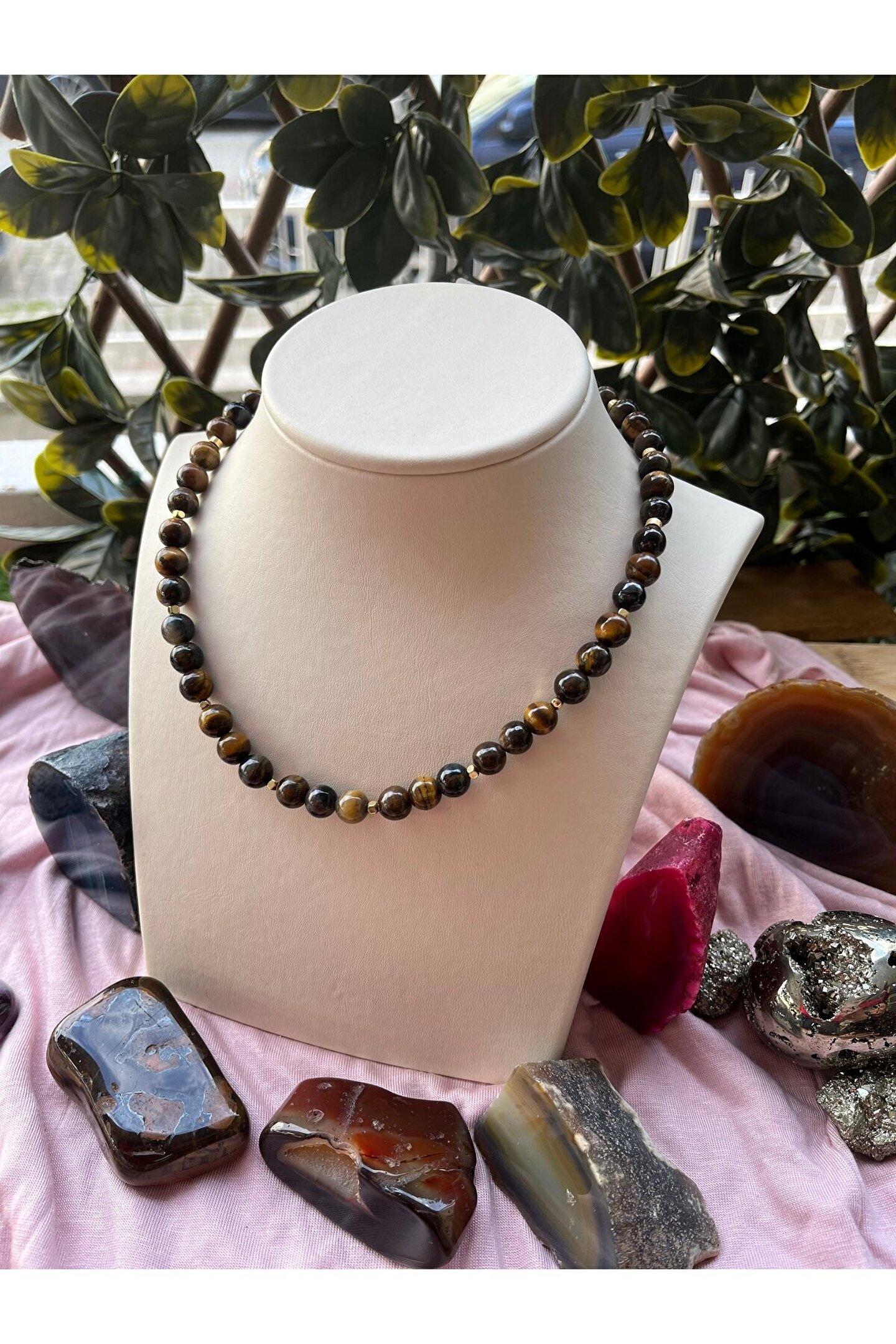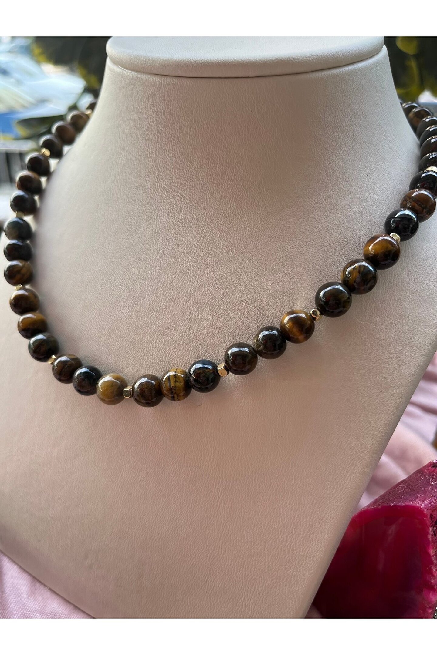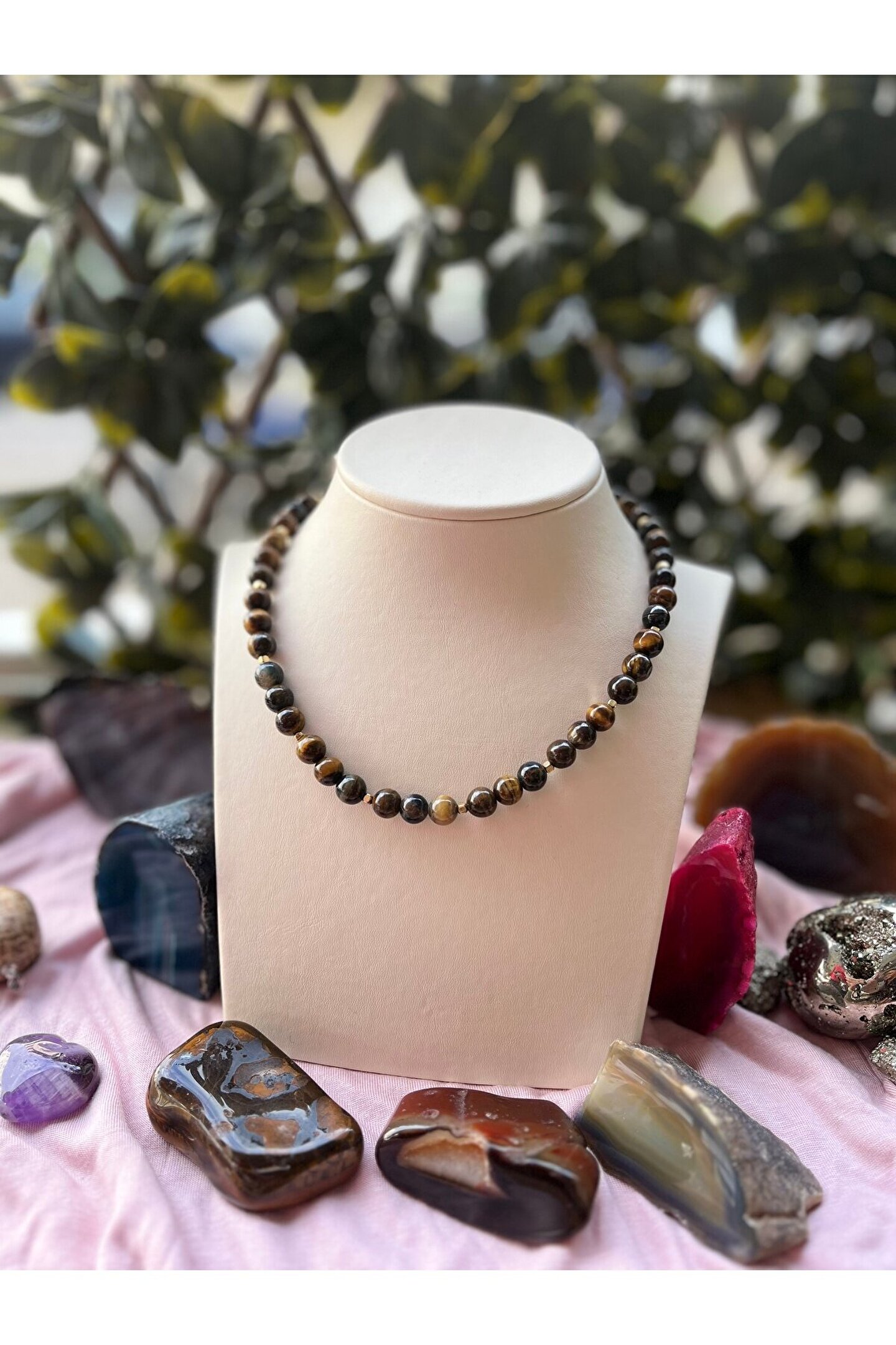 Kaplan Gözü Taşı Doğal Taş Kolye 40 cm Kaplan Gözü Doğal taşlar arasında olan kaplan gözü taşı, kalsedon grubunda yer alan bir taştır. ; Mavi, kırmızı, pembe ve benzeri farklı renkleri bulunur. ; En sık olarak sarı ve kahverengi tonlarının karışımından oluşan kaplan gözü taşı ile karşılaşılır. ; Parlak, hafif yağlı bir görüntüye sahiptir. ; Üzerinde koyu renkli şeritler vardır. ; Bunlar, demir minerallerinin etkisiyle meydana gelir. ; Genellikle cesaret, güç ve güven ile ilişkilendirilir, bu da onu kişisel güçlerini artırmak ve engellerin üstesinden gelmek isteyenler arasında popüler bir seçim haline getirir. ; Kaplan Gözü Taşı'nın zihinsel berraklığı ve odaklanmayı teşvik ettiği, bireylerin akıllıca kararlar almalarına ve hedeflerine odaklanmalarına yardımcı olduğu da bilinmektedir. ; Genel olarak, bu taş kişinin hayatına denge ve uyum getirme kabiliyetiyle büyük saygı görür ve bu da onu kristal şifa dünyasında değerli bir değerli taş haline getirir. ; Kaplan Gözü Taşı Özellikleri : Kaplan gözü kişiye azim, denge, cesaret ve sezgisel yetenekleri arttırmada güç verir. ; Motivasyon sağlar ve hem iç hem de dış huzuru ortaya çıkarmada destek olur. ; Korku, kıskançlık gibi duyguları dengelemeyi sağlar. ; Endişe ve stres gibi faktörlerin üstesinden gelmek için faydalıdır. ; Halk arasında göz ve nazardan koruduğuna inanılır. ; Bu yüzden küçük çocukların yastıklarının altına konur. ; Kaplan gözü mantığı ve cesareti yansıtır. ; Bu taş ile çalışmak yaratıcılık önündeki blokajları kaldırmak faydalı olur. ; Duyguları ve zihni dengelerken, zekâ ve sezgileri keskinleştirir. ; Astrolojik olarak savaşçı özellikleriyle bilinen Mars gezegeniyle ilişkilidir. ; Kaplan gözü fiziksel olarak sindirim sistemiyle ilişkilidir. ; Astım hastalığına iyi gelir. ; Görme duyusunu hem fiziksel hem de içsel olarak güçlendirir. ; Olaylara daha net ve dengeli bakmayı sağlar. ; Baş ağrılarına karşı etkilidir. ; Kuvars grubu taşlarından olan kaplan gözü, yine kuvars grubundan sitrin, kristal kuvars gibi taşlarla kullanılabilir. ; Böylece iki taşın da etkisi desteklenerek artacaktır. ; Örneğin kahverengi jasper taşı ile birlikte kullanılan kaplan gözü, jasper taşının bilge ve şifacı özelliklerini pekiştirerek kişiyi şifalandırmak, beslemek ve korumak için muhteşem bir ikili oluşturur. ; Kaplan Gözü Taşının Burcu: Kaplan gözü taşı, ikizler, akrep, oğlak, yengeç burcudur. ; Çakrası alt karın çakrasıdır. ; Kaplan Gözü Taşının Temizliği: Kristallerin kullanılmadan önce ve düzenli aralıklarla temizlenmesi önerilir. ; Böylece taşın enerjisini temizleyebilirsiniz. ; Kaplan gözü taşını temizlemek için dört yöntem vardır: Kristalinizi toprağa gömüp bir gece boyunca bekleterek arındırabilirsiniz. ; Kristalinizi bir tütsü yardımıyla arındırabilirsiniz. ; Bu ürün KAMBA tarafından gönderilecektir.;