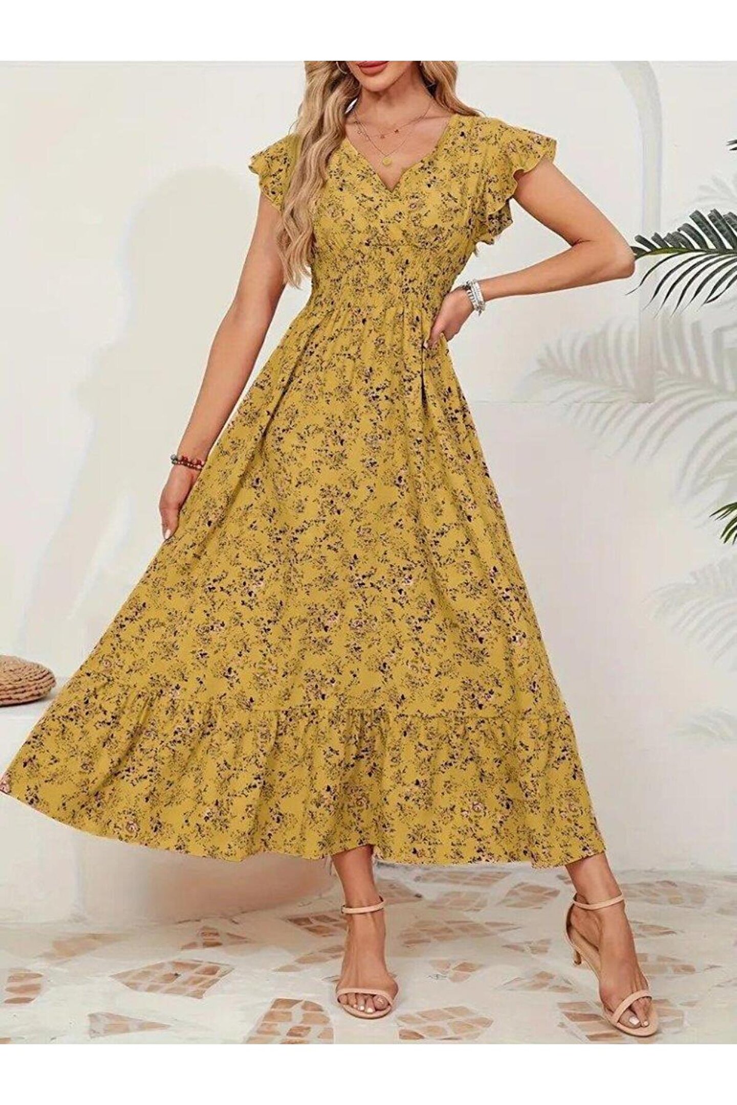 Kadın Kısa Kollu Kruvaze Yaka Beli Lastikli çiçek Desenli Elbise