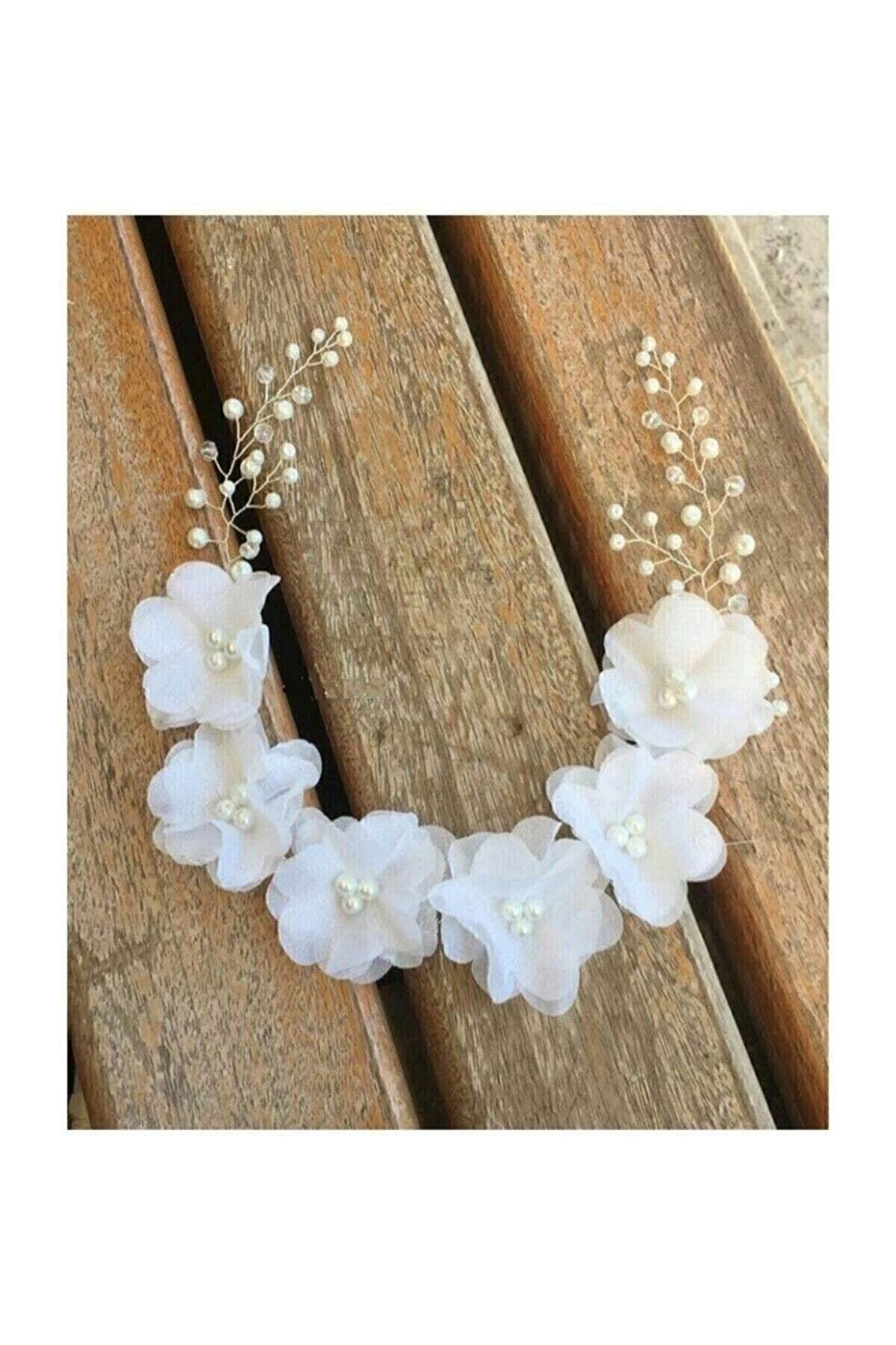 kardelen tasarım Beyaz Şifon Çiçekli 4 Yapraklı Incili Gelin Tacı Cyf29