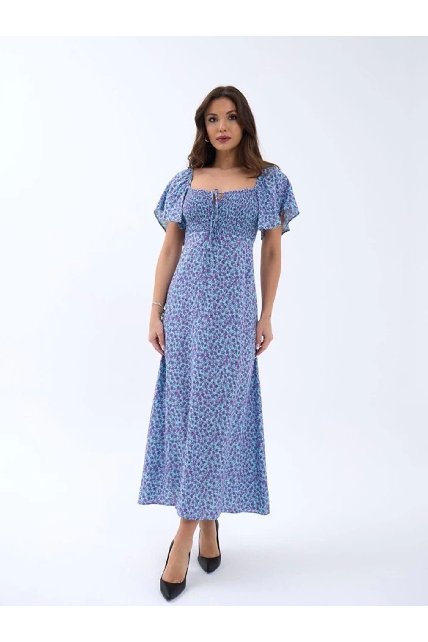 Kadın Kısa Kollu Yakası Açık Belden Lastikli Pileli Kısa Ithal Krep Elbise