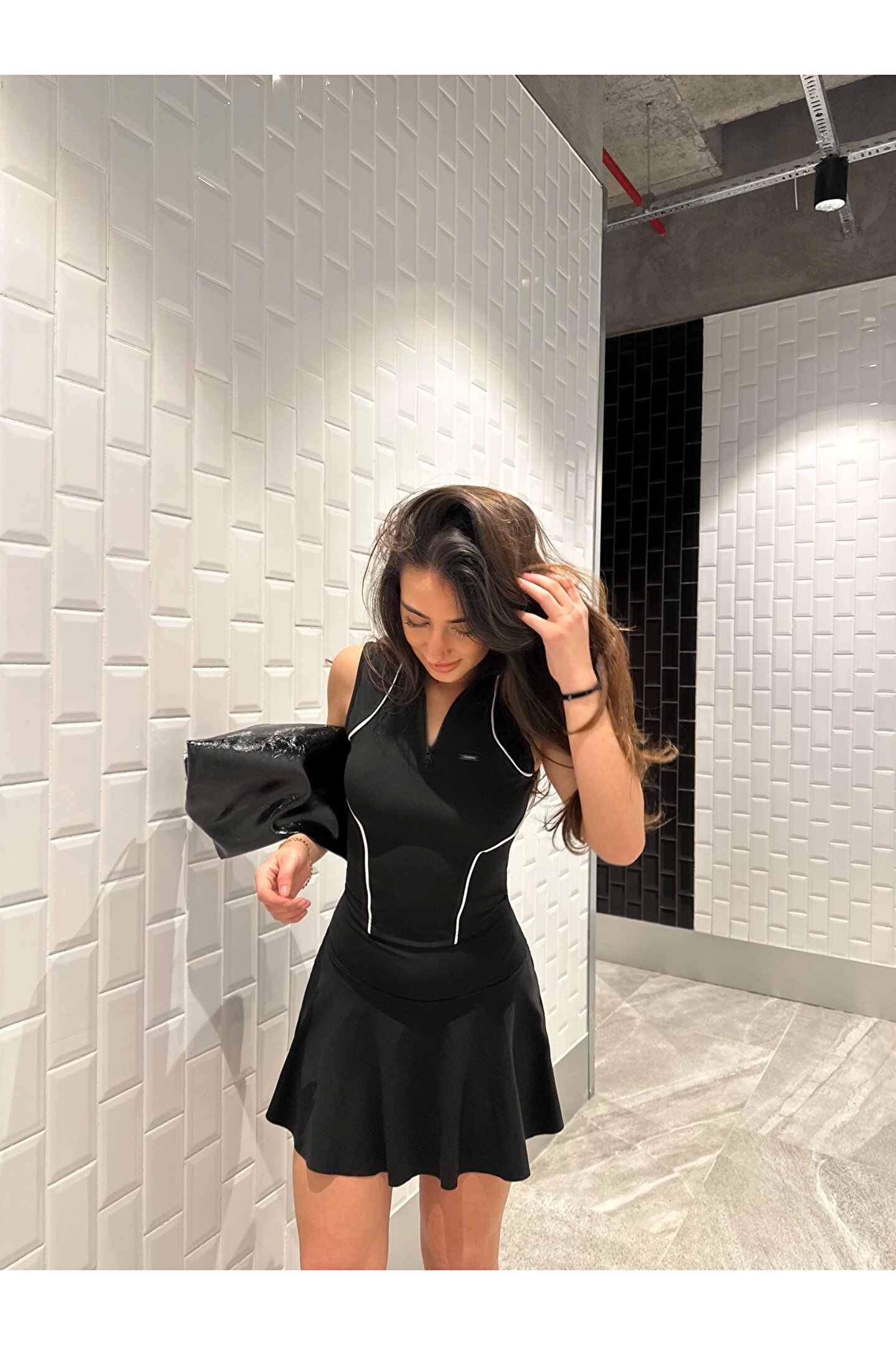 KarşıVitrin Siyah Fermuarlı Bilyeli Bluz
