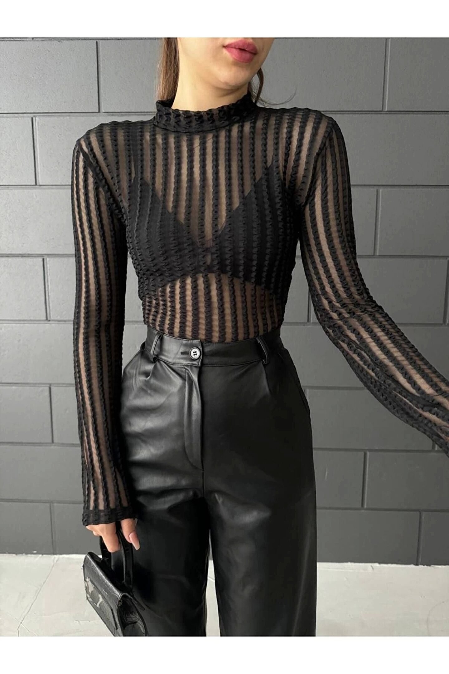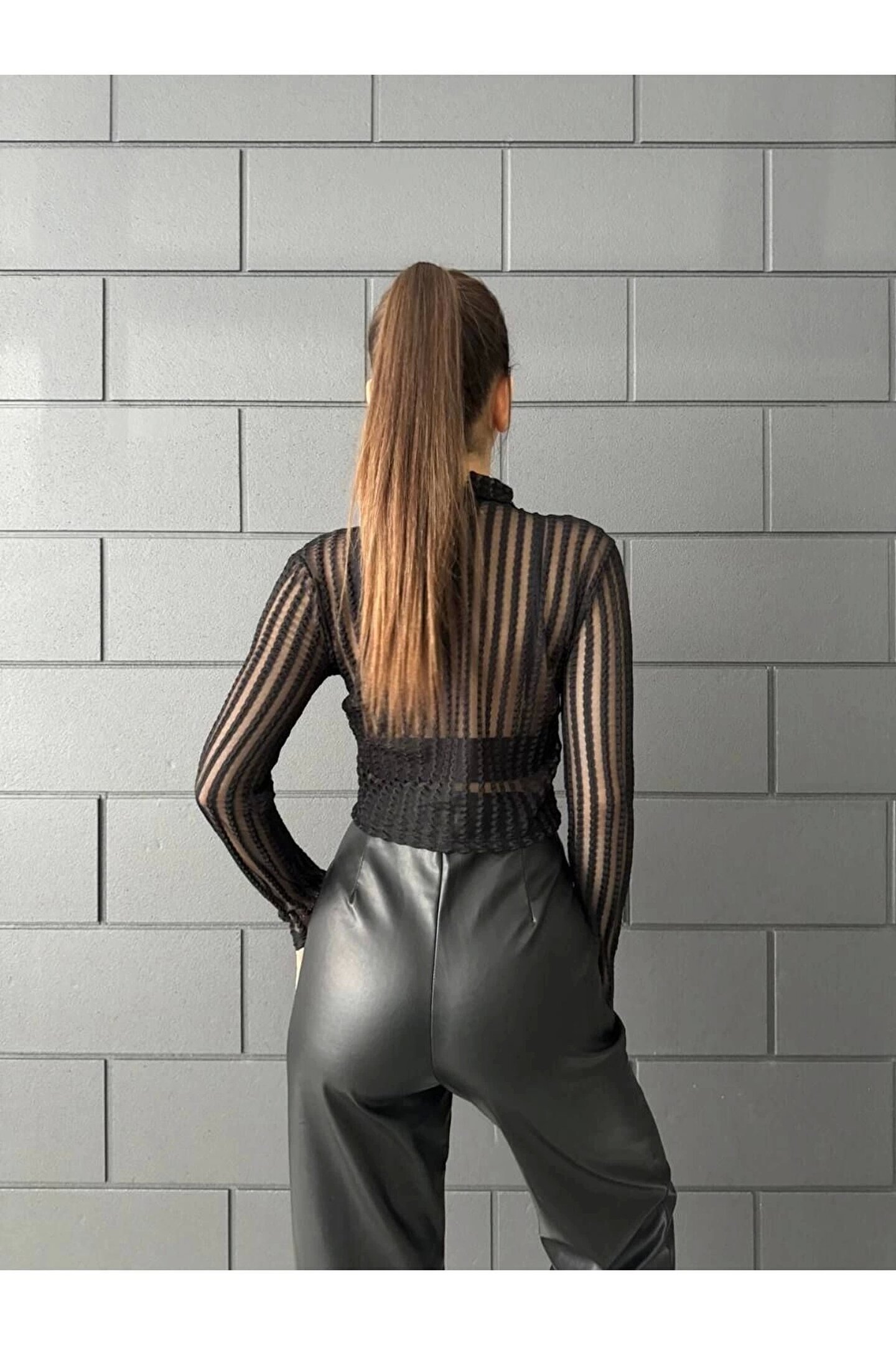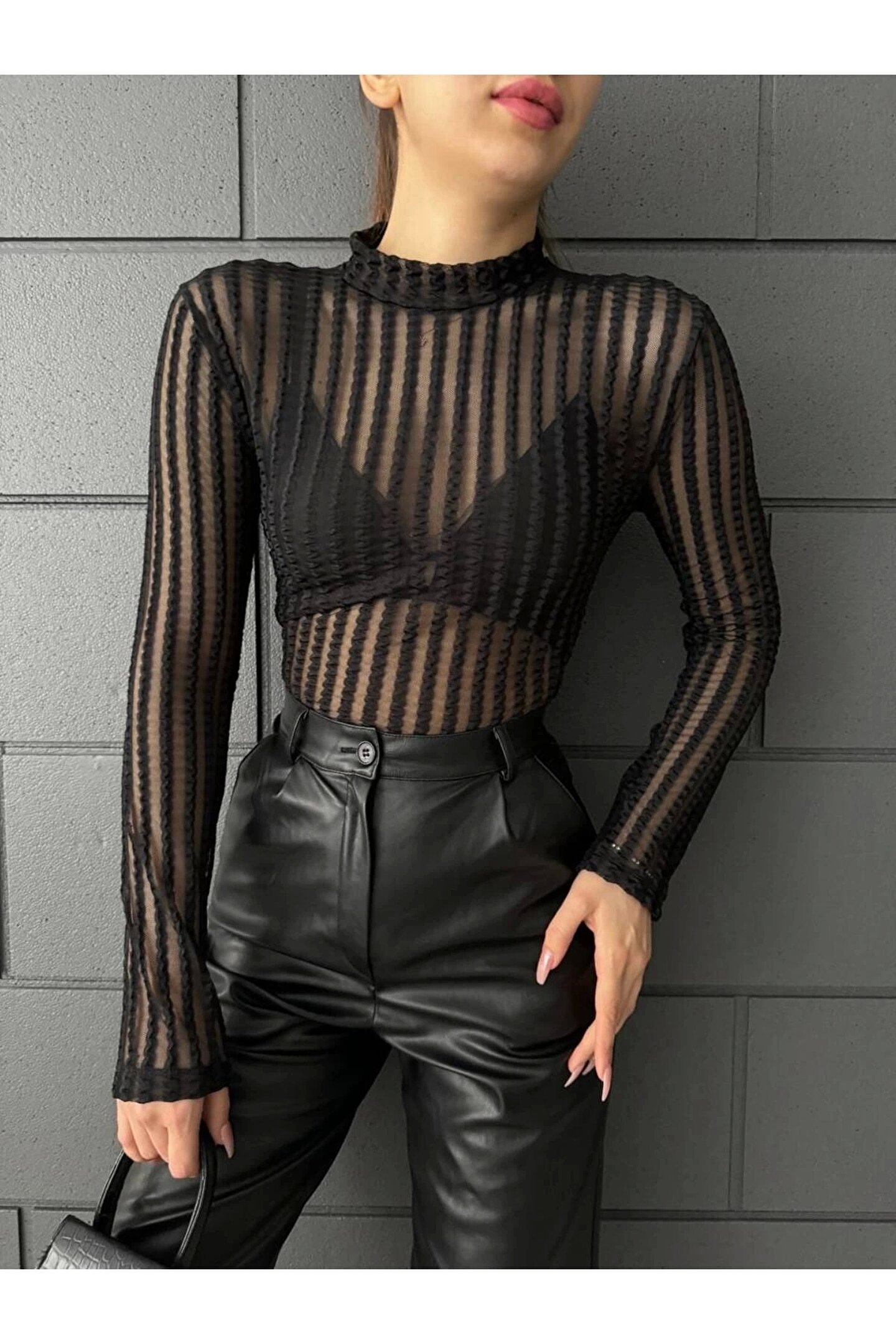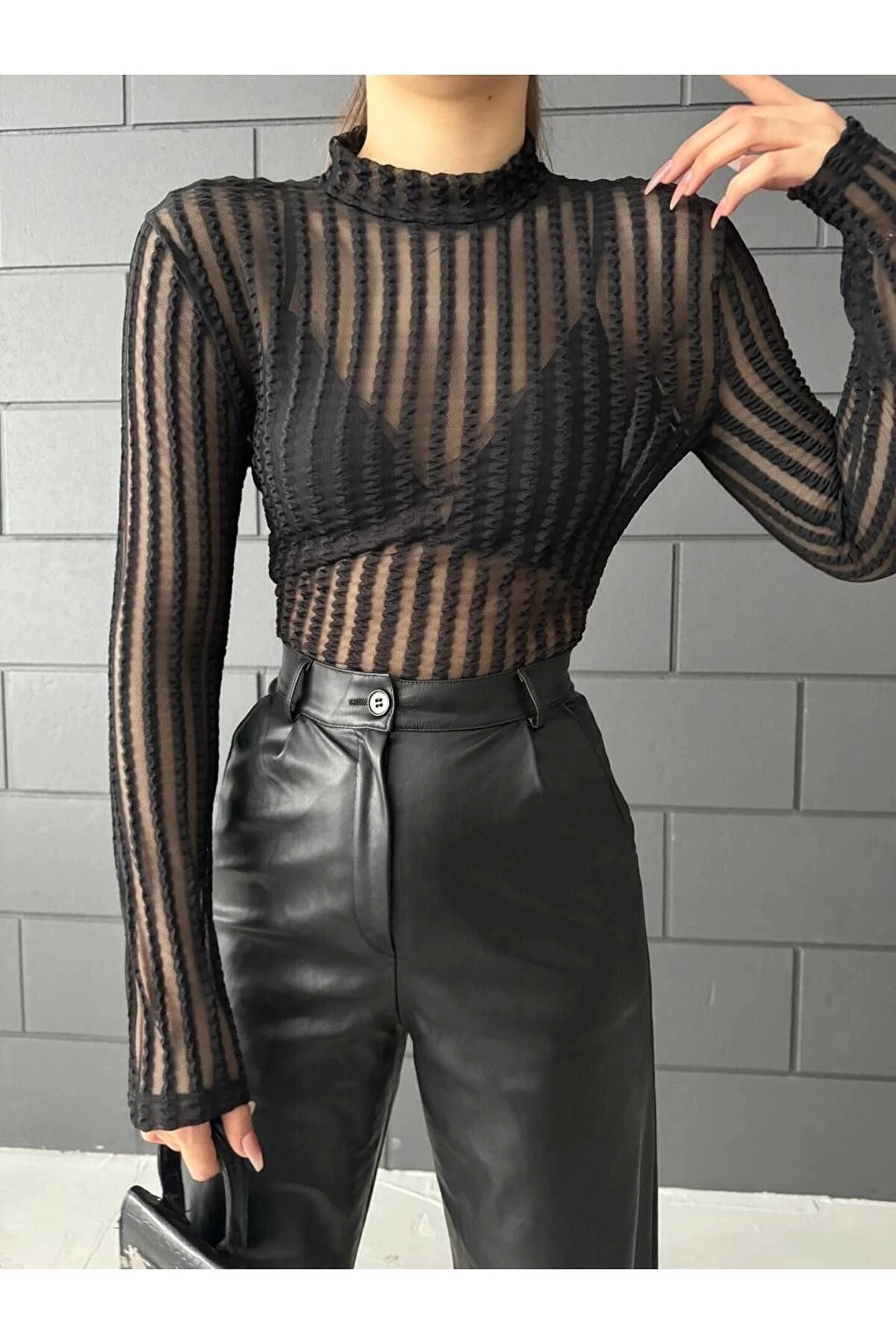 KarşıVitrin Siyah Tül Detay Transparan Bluz