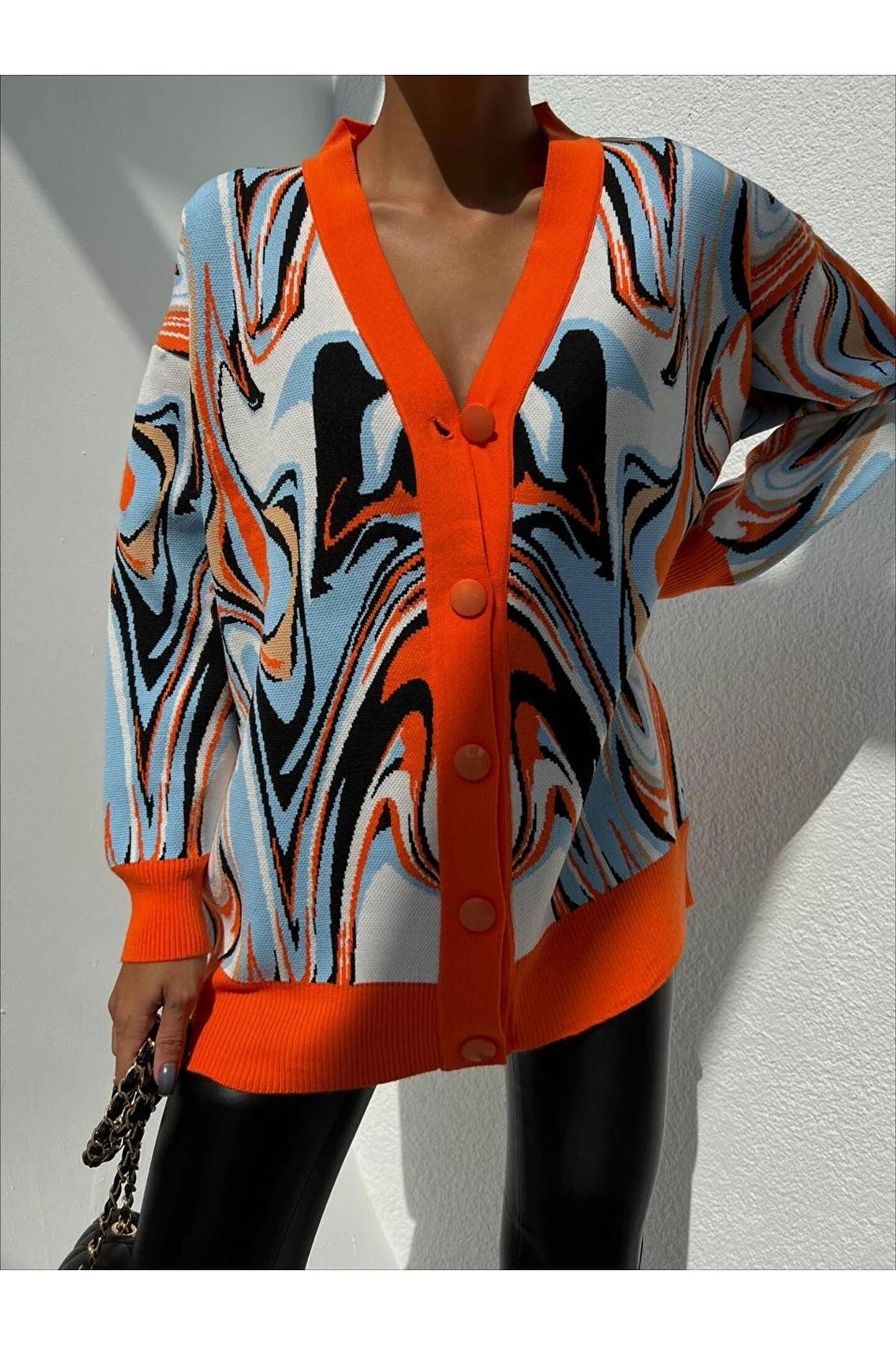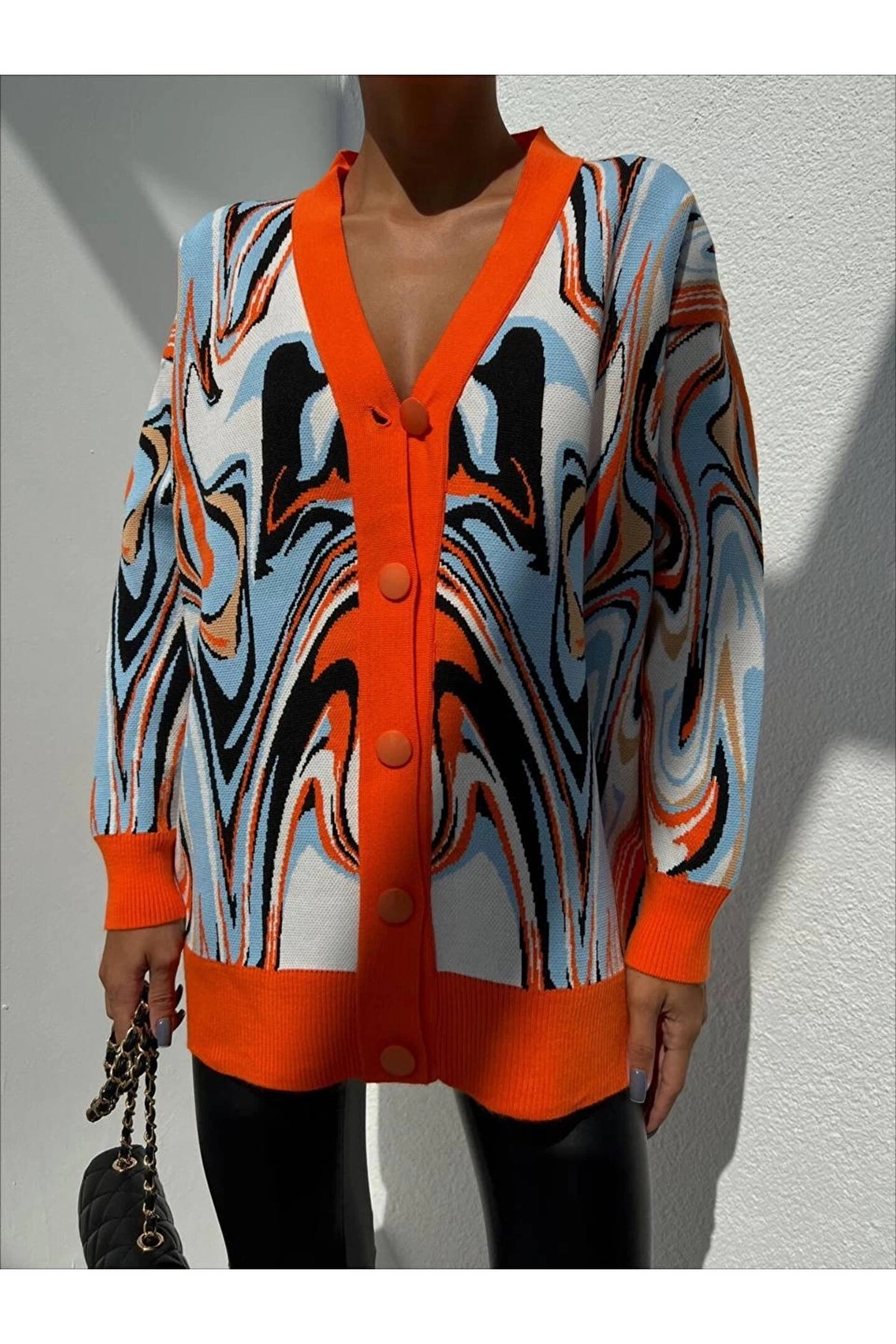 KarşıVitrin V Yaka Düğmeli Oversize Ebruli Desen Hırka