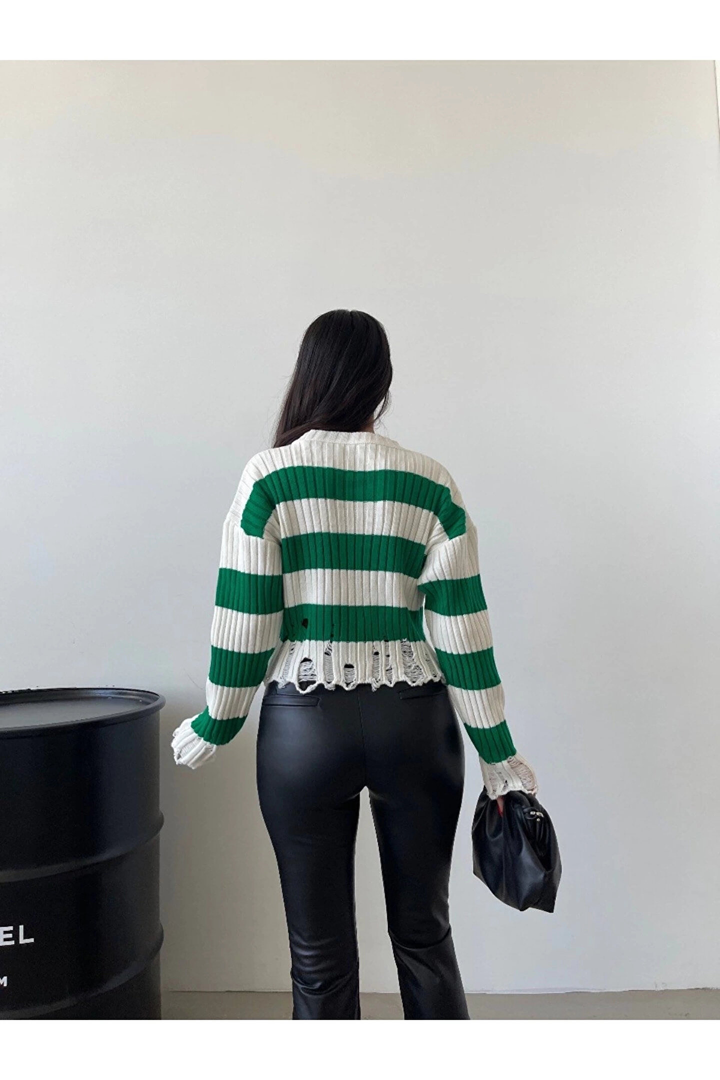 KarşıVitrin Yeşil Çizgili Yırtık Detaylı Triko Kazak