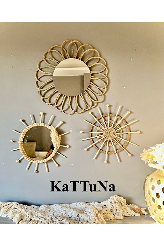Bohem Papatya Jüt Boncuk Ayna ve Bambu Duvar Dekorasyon Ürünü 3’lü Set