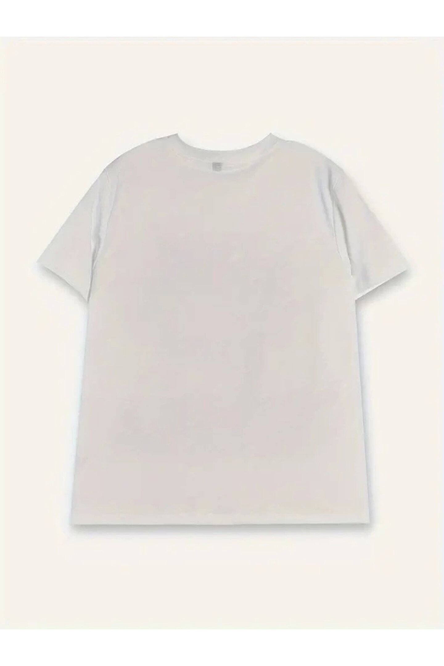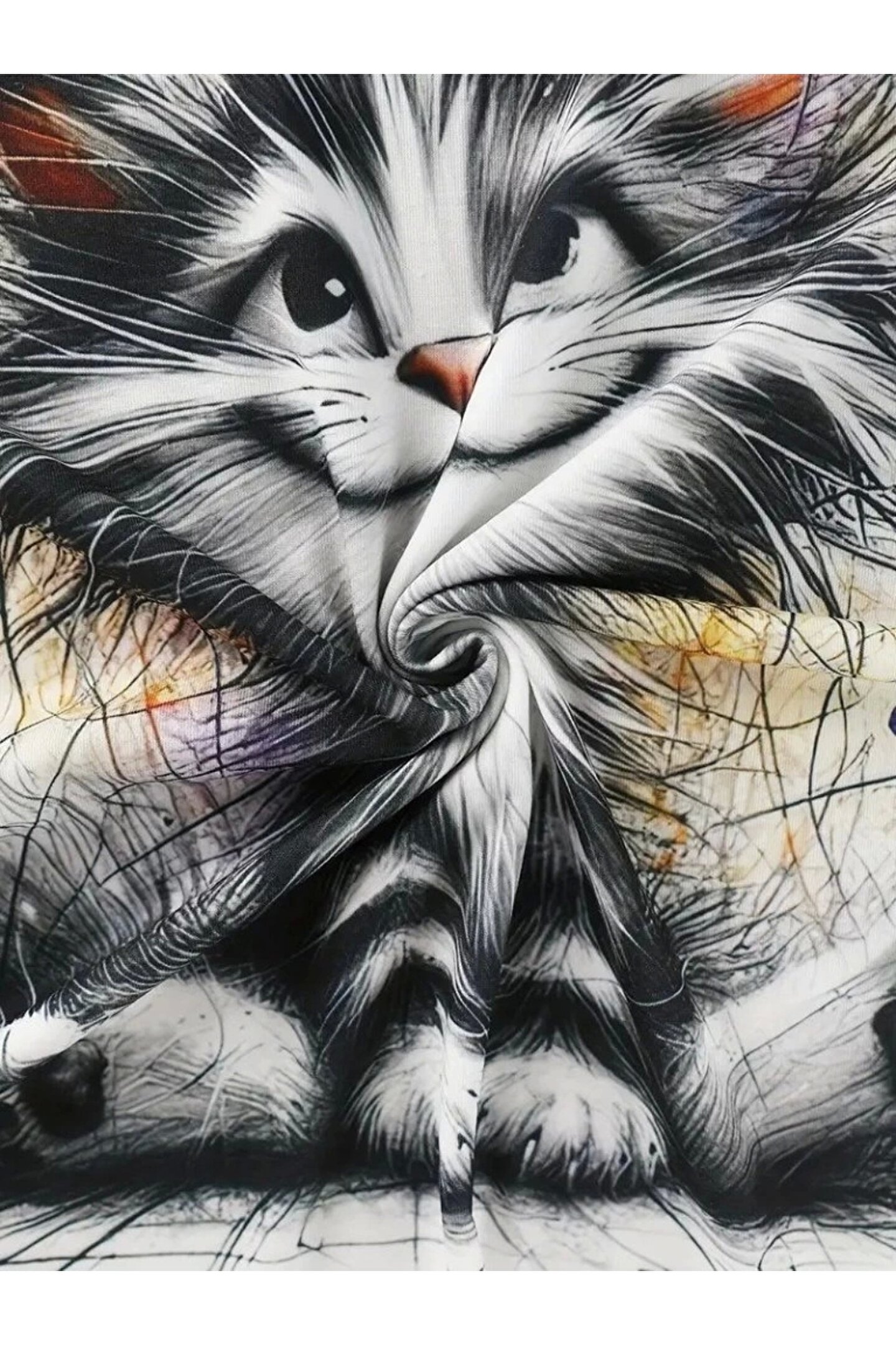 Kadın Kısa Kollu Bisiklet Yaka Kedi Baskılı Süprem Bluz