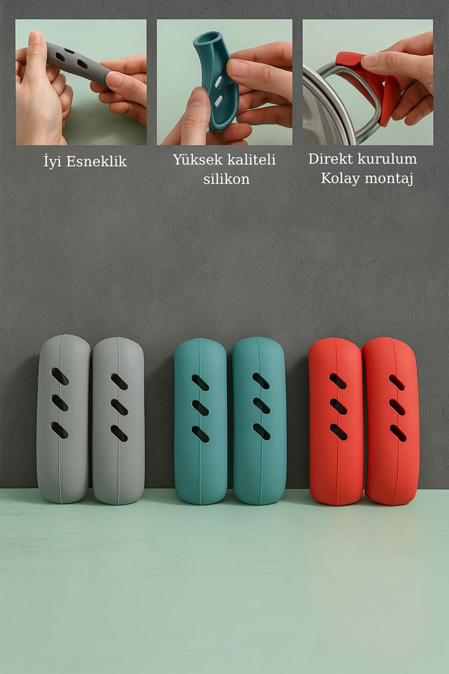 Isıya dayanıklı silikon malzemeden üretilmiş bu 2’li kulp tutucu seti, tencere, tava ve güveçlerin kulplarını güvenle kavramanızı sağlar.; Kaymaz ve esnek yapısı sayesinde ocakta ya da fırında yemek yaparken ellerinizi yanıklara karşı korur.; Şık tasarımı ve kolay takılabilir özelliği ile mutfağınızın vazgeçilmezi olacak.; ; ⸻ Ürün Özellikleri: •Paket İçeriği: 2 Adet Silikon Tutucu STOK DURUMUNA GÖRE RENK GÖNDERİLİR •Malzeme: Yüksek kaliteli silikon •Isı Yalıtımı: Yüksek ısıya dayanıklı yapı •Kullanım: Fırın, tava, güveç, tencere kulp koruma •Özellik: Kaymaz yüzey, kolay tak-çıkar •Esneklik: İyi esneklik ile farklı kulplara uyum sağlar •Temizlik: Kolay temizlenebilir ve yıkanabilir •Kalın Saplı Tencere ve Tavalar İçin Uygundur