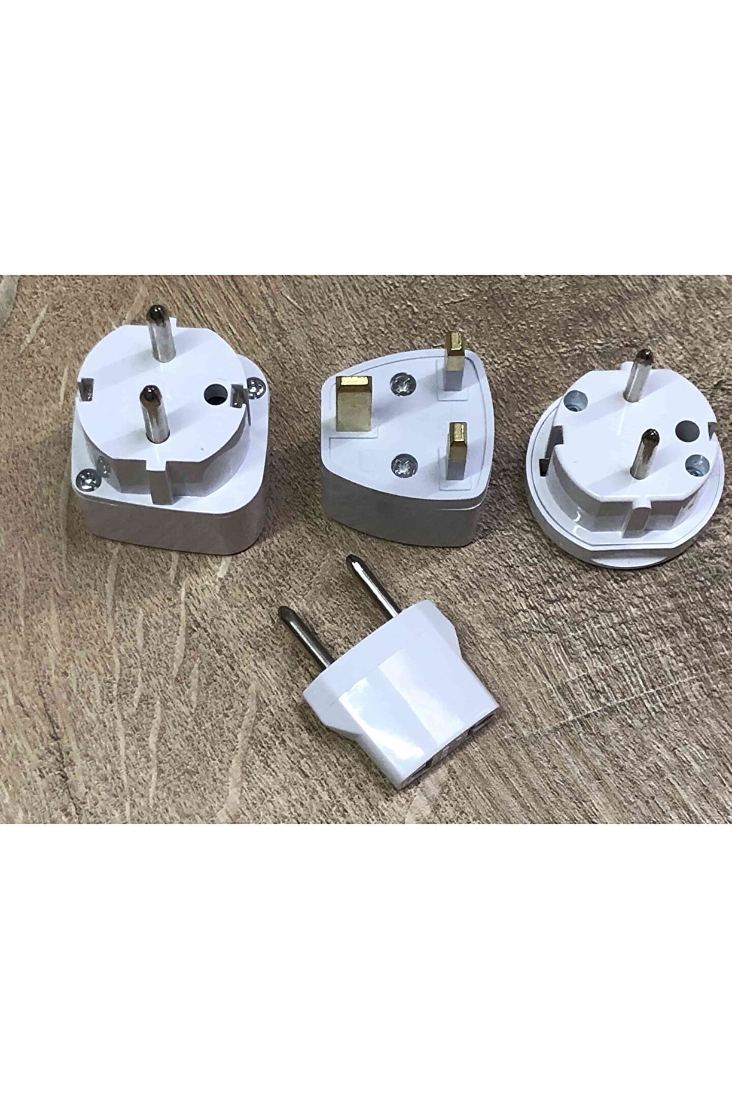 4 adet birbirinden farklı beyaz plastik çevirici dönüştürücü elektrik fiş ucu ; 1. Ingiliz ucunu türk prizine çeviren beyaz renkli yuvarlak topraklı dönüştürücü ; 2. Amerikan + ingiliz ucunu türk prizine çeviren beyaz renkli kare tipi dönüştürücü ; 3. Amerikan 2 pinli duz elektrik ucunu türk prizine dönüştüren küçük siyah renk çevirici ; 4. Amerikan ingiliz avrupa fişini ingiliz avusturalya fişine çevirici 3 kalın bacaklı adaptör ; Yurtdışındaki prizlere uygun ürünleri çalıştırma konusundaki problemi çözmek için kullanılır ; 4 adet resimde görülen çeviriciler gönderilecektir ;